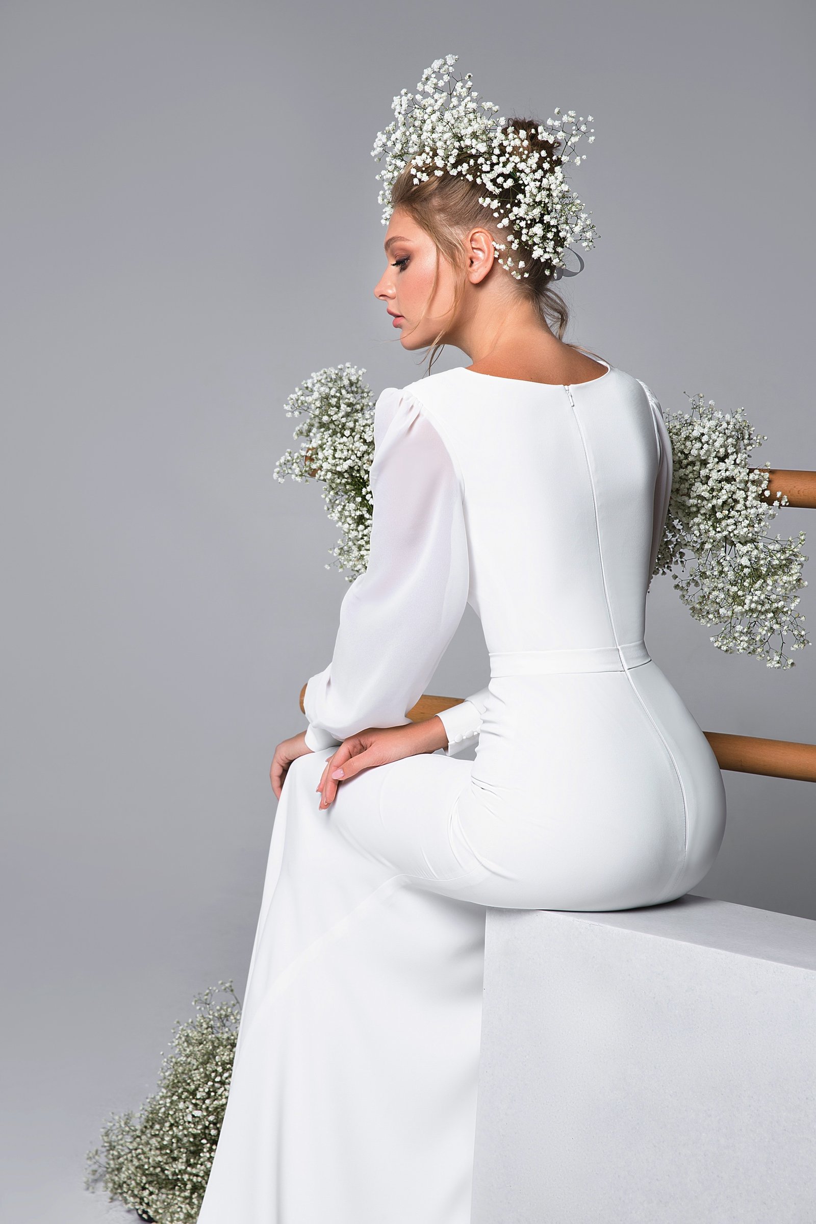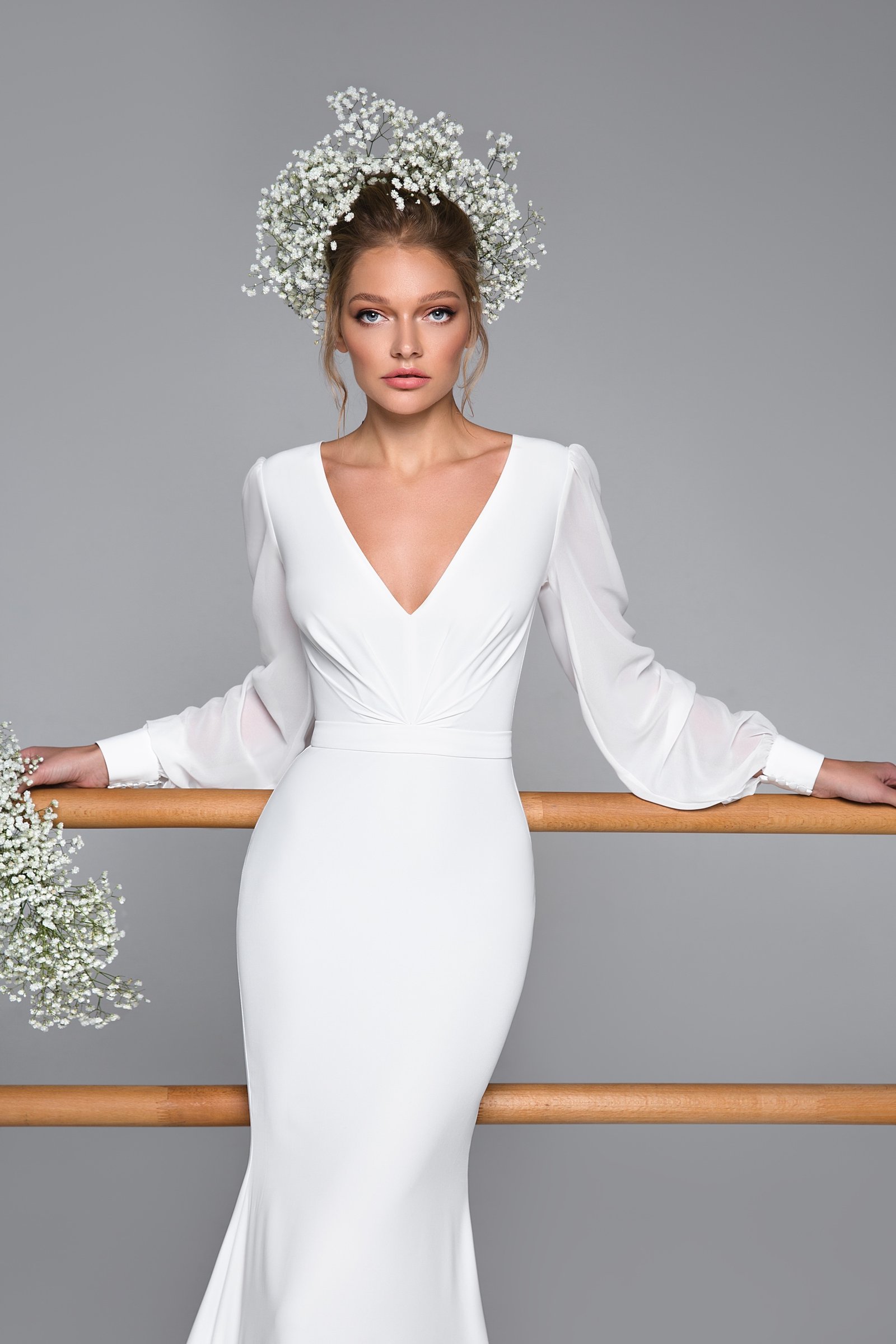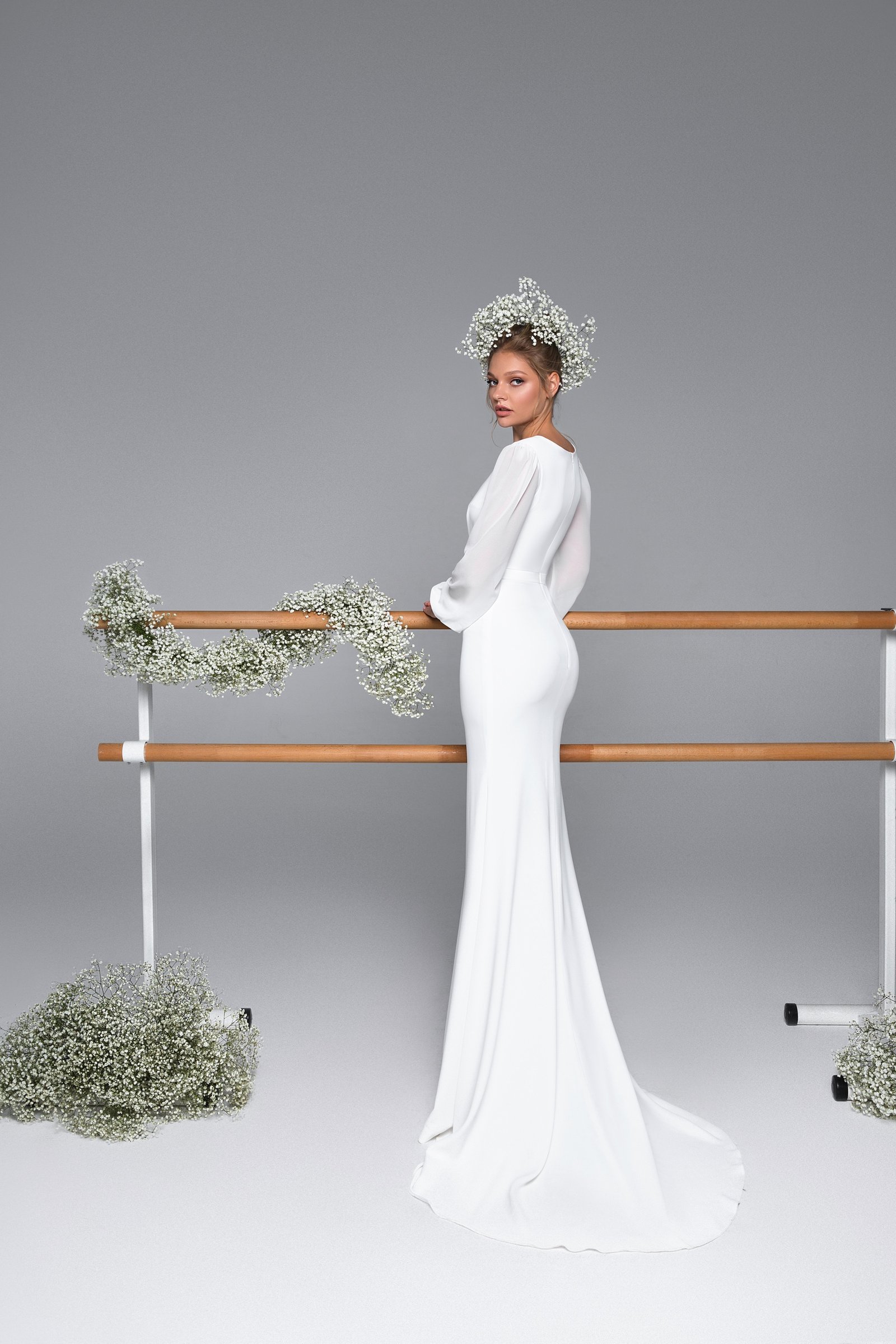 Discover the magic of bridal couture with Nino. Its enchanting sheath silhouette, paired with the softness of crepe, tulle, ensures a look of regal sophistication. Every bride deserves to look and feel her best, and this gown promises just that.