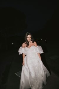 Estos diseños fueron la guinda del pastel para sus dos vestidos de novia. El vestido de la ceremonia era muy sencillo, con un gran escote, el diseño de Eva Lendel con el que soñaba la novia, mientras que el segundo rezumaba una elegante esencia ‘Old Hollywood’, con piezas desmontables para que la novia disfrutase cómodamente de toda la velada.