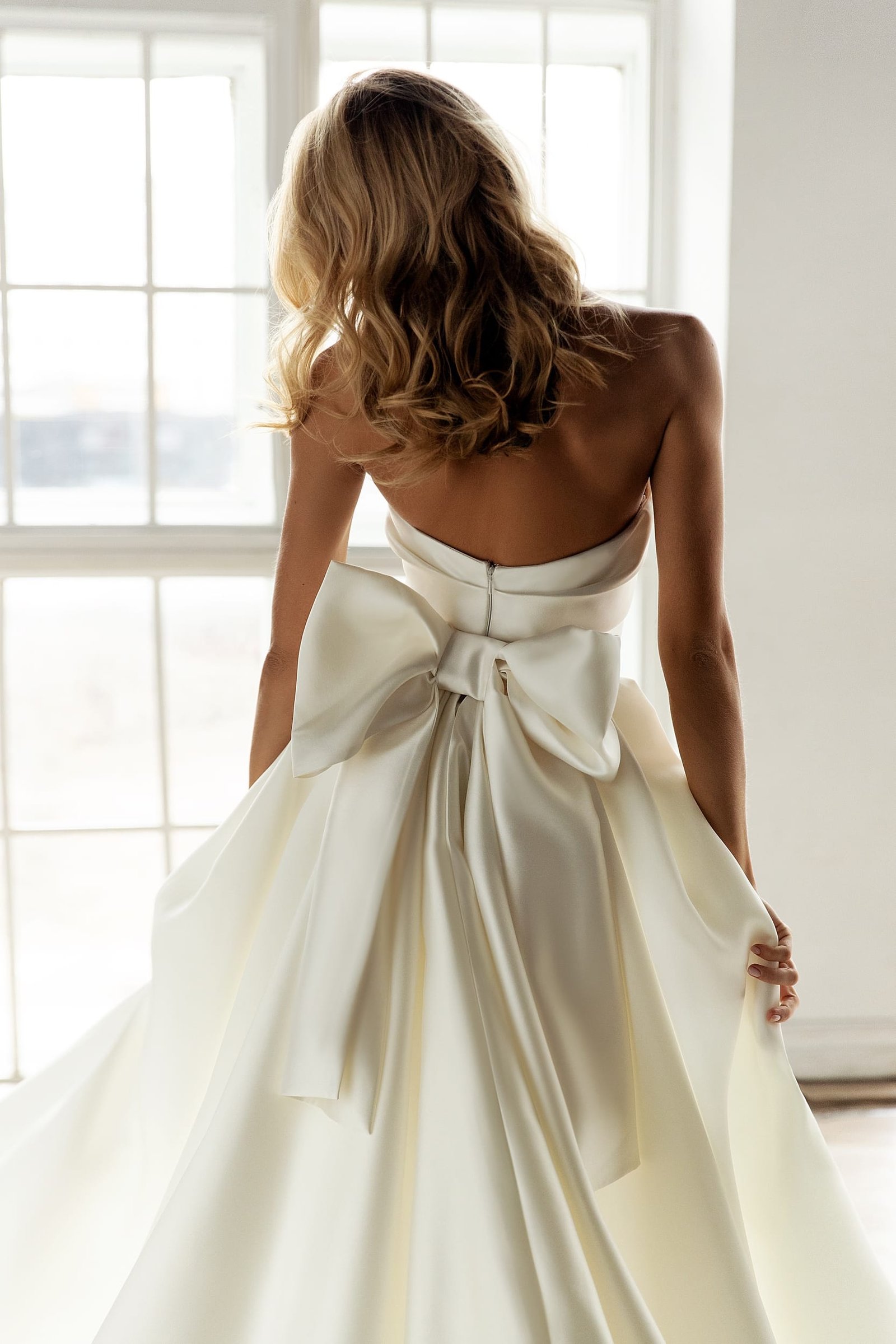 A royal wedding gown with a fabulous train. A sheath dress is made of glossy fabric. The silhouette accentuates the figure of the bride. A strapless bodice is decorated with a falbala that highlights a decollete. Extra-low bodice bares a bride’s back. A fantastic additional skirt is embellished with a big bow and passes into a long train and.