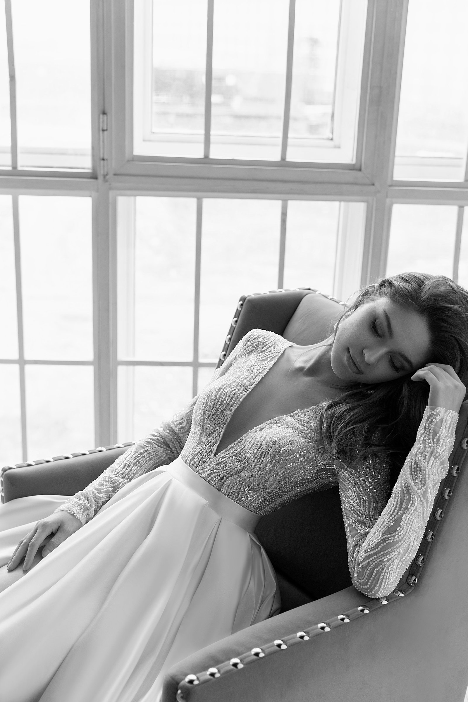 A fabulous wedding gown with magnificent long sleeves. The upper part of the dress is made of transparent fabric that is fully decorated with a pattern of shining crystals and beads. The dress looks feminine due to a V-shaped low neck and a deep neckline at the back of a dress. A splendor skirt that passes into a train is made of glossy fabric. A high cut adds a finishing touch to the outfit.