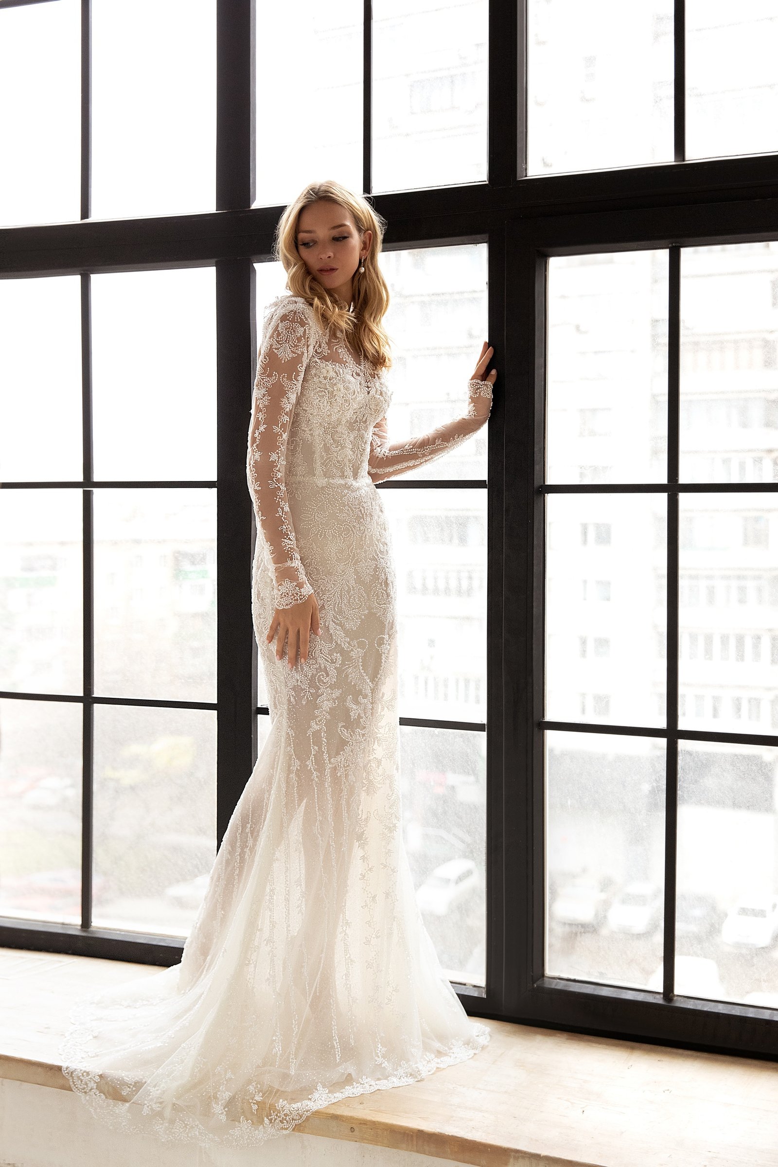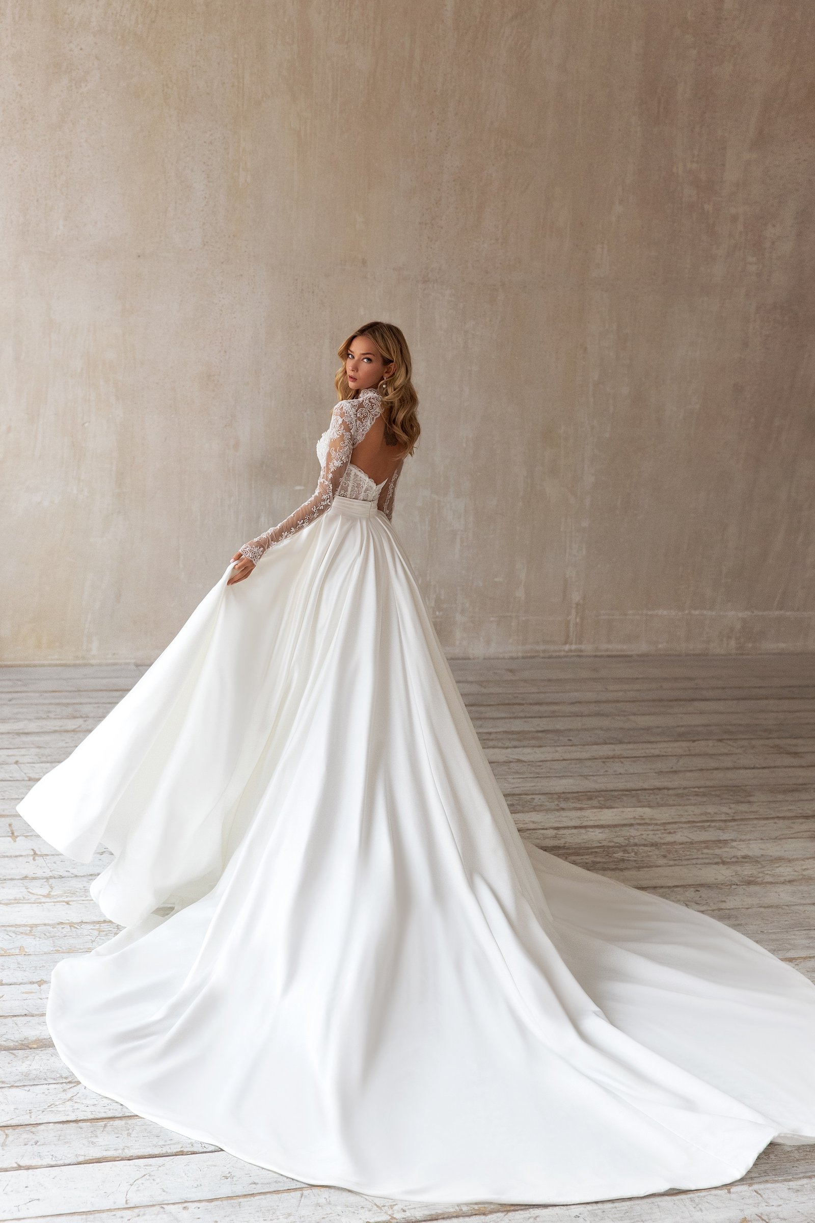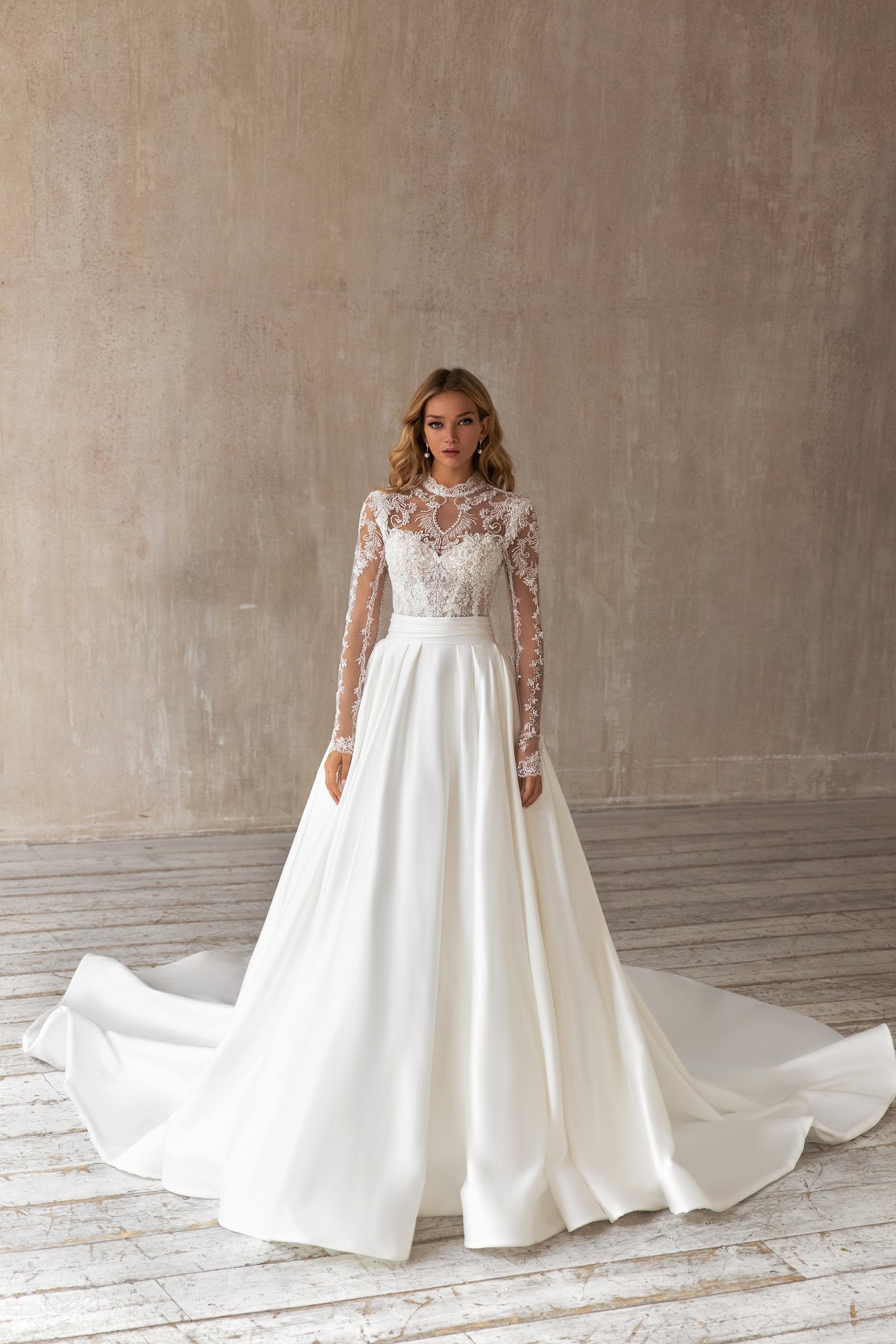 This wedding gown is a perfect solution for brides that want to change a few looks during the celebration. A sheath dress is made of lace and decorated with a floral pattern. It is also embellished with pearls and beads. A high collar with a keyhole and long transparent sleeves make this dress enigmatic. A spectacular detail is a rounded neckline at the back of a dress. An additional loose skirt with take-ups is made of glossy fabric. This additional skirt is fixed on a waistline and embellished with a belt. There is a magnificent train.