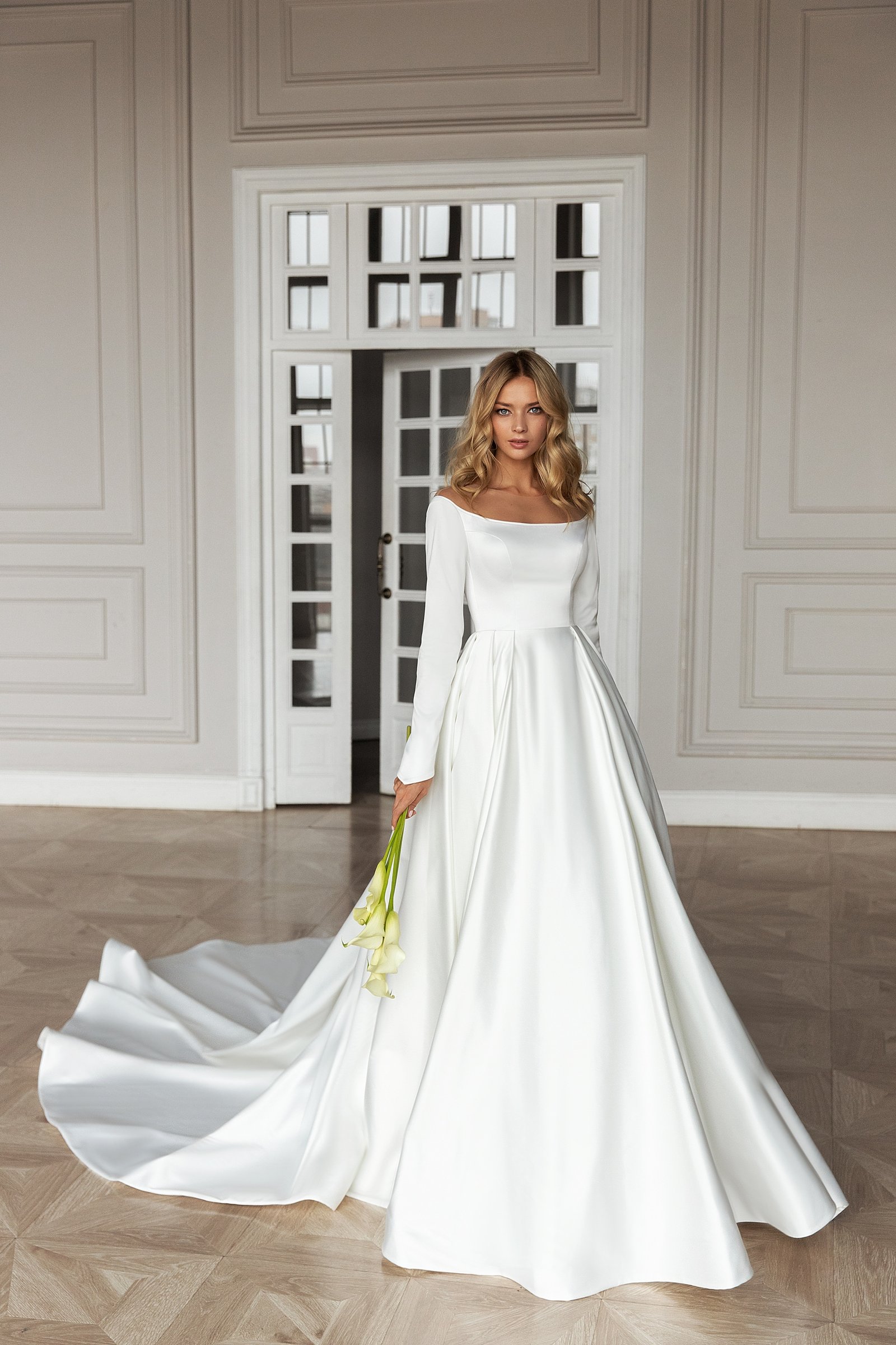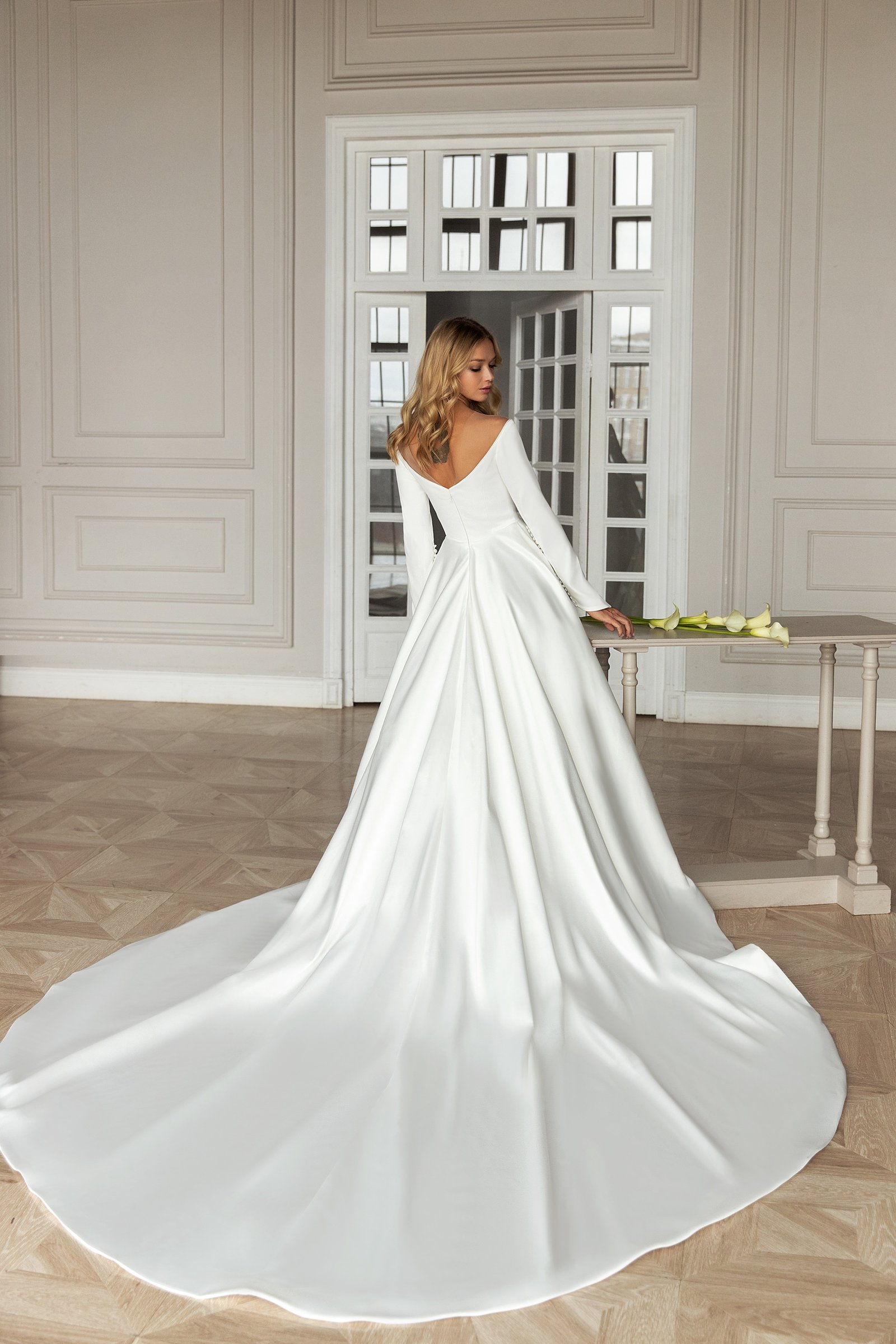 With Dimilia, bridal dreams turn into reality. Its enchanting a-line silhouette, paired with the luxury of satin, stands as a testament to elegance and sophistication. Every detail is a promise of grandeur, ensuring the bride feels like a vision of perfection.