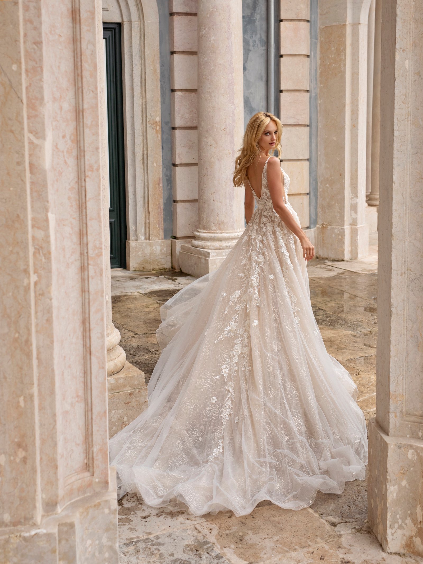 Translucent Elen wedding gown deserves special attention. A corsage on spaghetti straps is entirely decorated with floral lace pattern. The same lace movies are found on either side of a skirt. V-shaped low neck, cuts under arms and fantastic neckline look seductive. A long skirt with a tender pattern is made of translucent veiling.