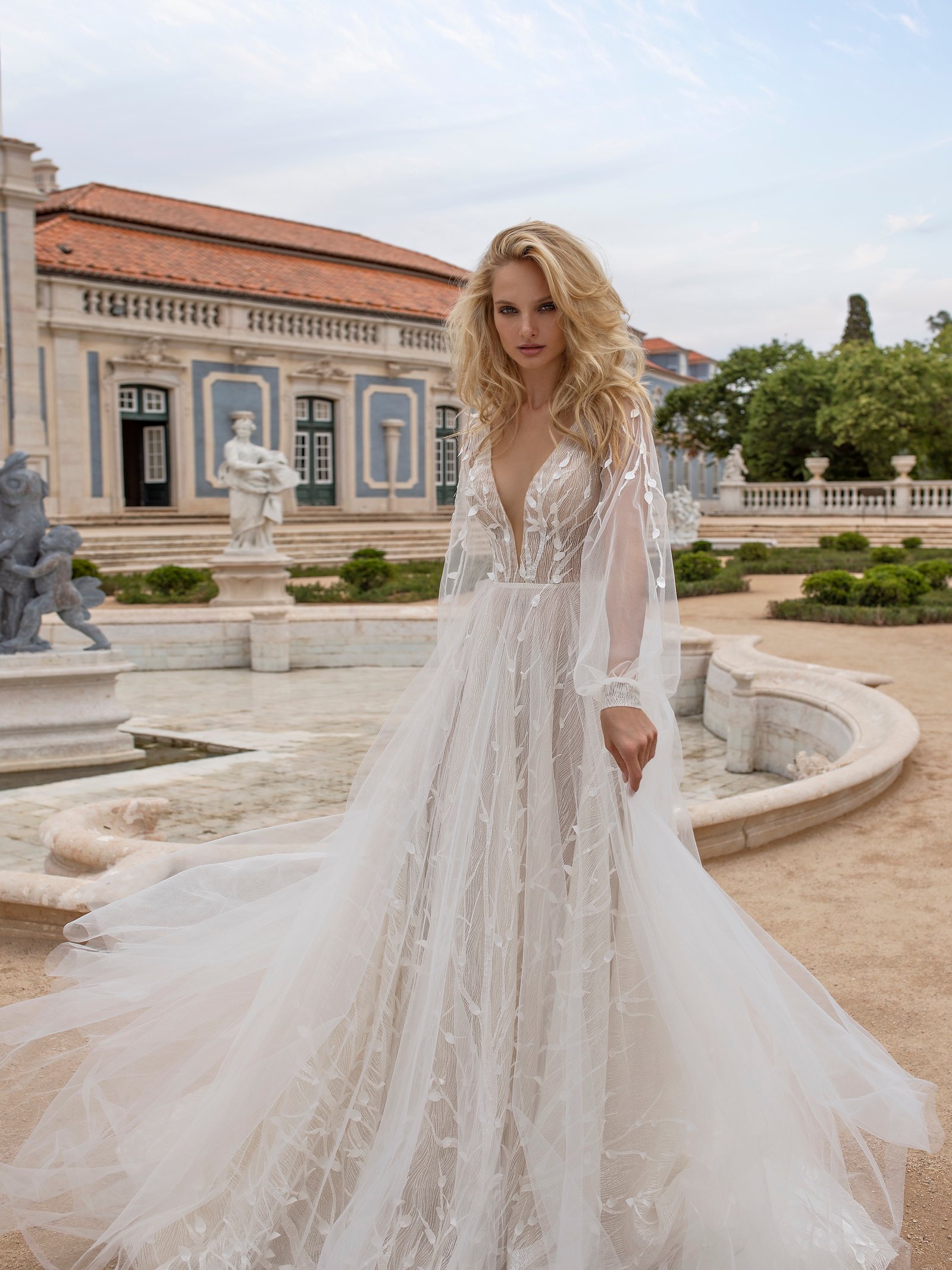 Fabulous Lima wedding gown is a graceful and laconic outfit. A-line dress is entirely decorated with a floral lace pattern. This pattern is combined with a thin veiling layer. V-shaped low neck, long deep neckline at the back of a dress make this look tender and feminine.