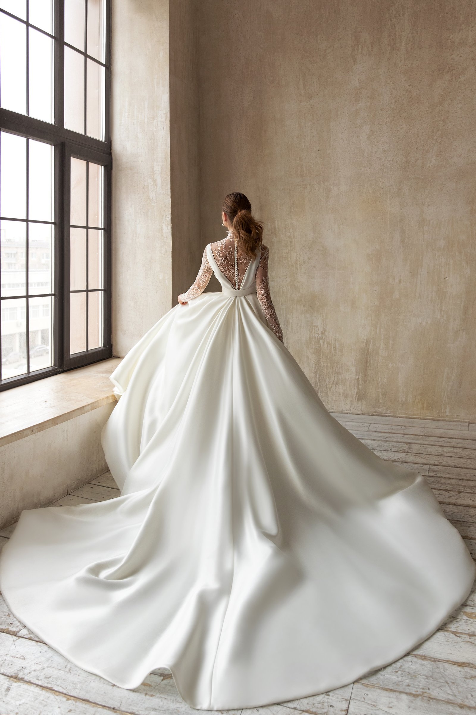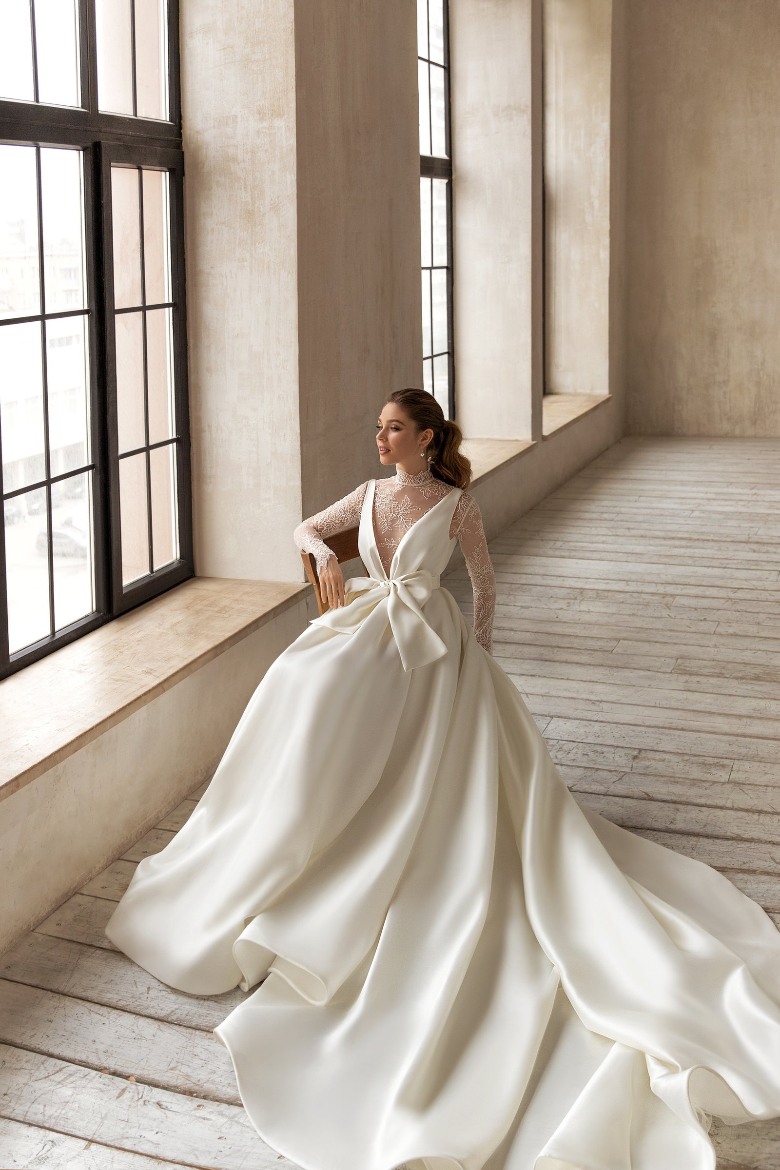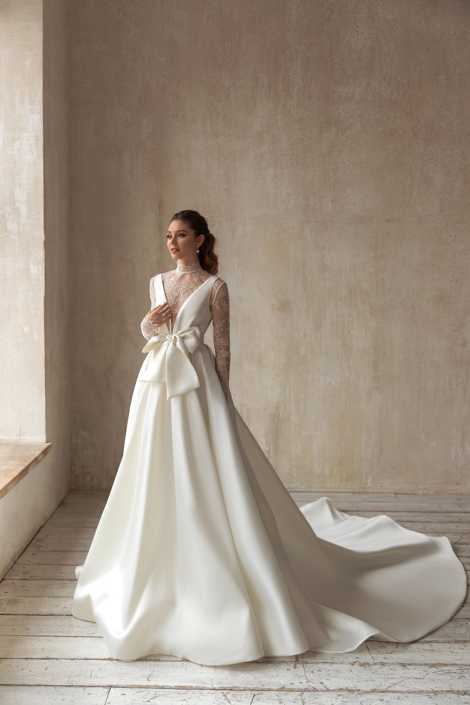 Magdalena is a tender and delicate dress that creates a vintage wedding look. The A-line dress itself is made of glossy fabric. A bodice on wide straps with a V-shaped neckline is highlighted with a big bow at the forepart of the dress. A transparent blouse with a high collar is decorated with floral shining patterns and a row of Buttons. Splendor skirt passes into a long train.
