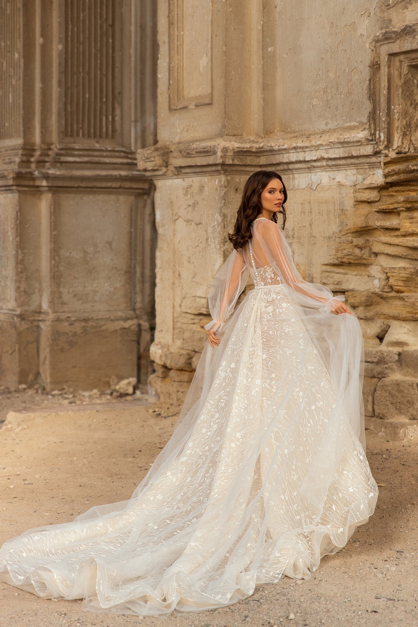 This A-line wedding gown is decorated with lace made of flowers. A V-shaped neckline accentuates a beautiful decollete. The fantastic cape is adding a final romantic touch to the dress.