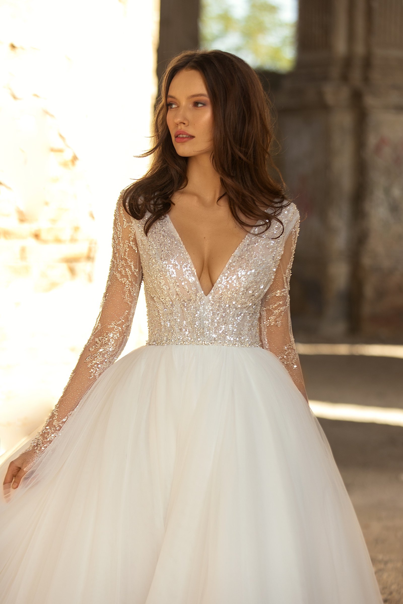 Cler is a classic A-line wedding gown with a V-shaped neckline and long sleeves. The corset of the dress is decorated with a sparkly lace and perfectly matching simple tule skirt.