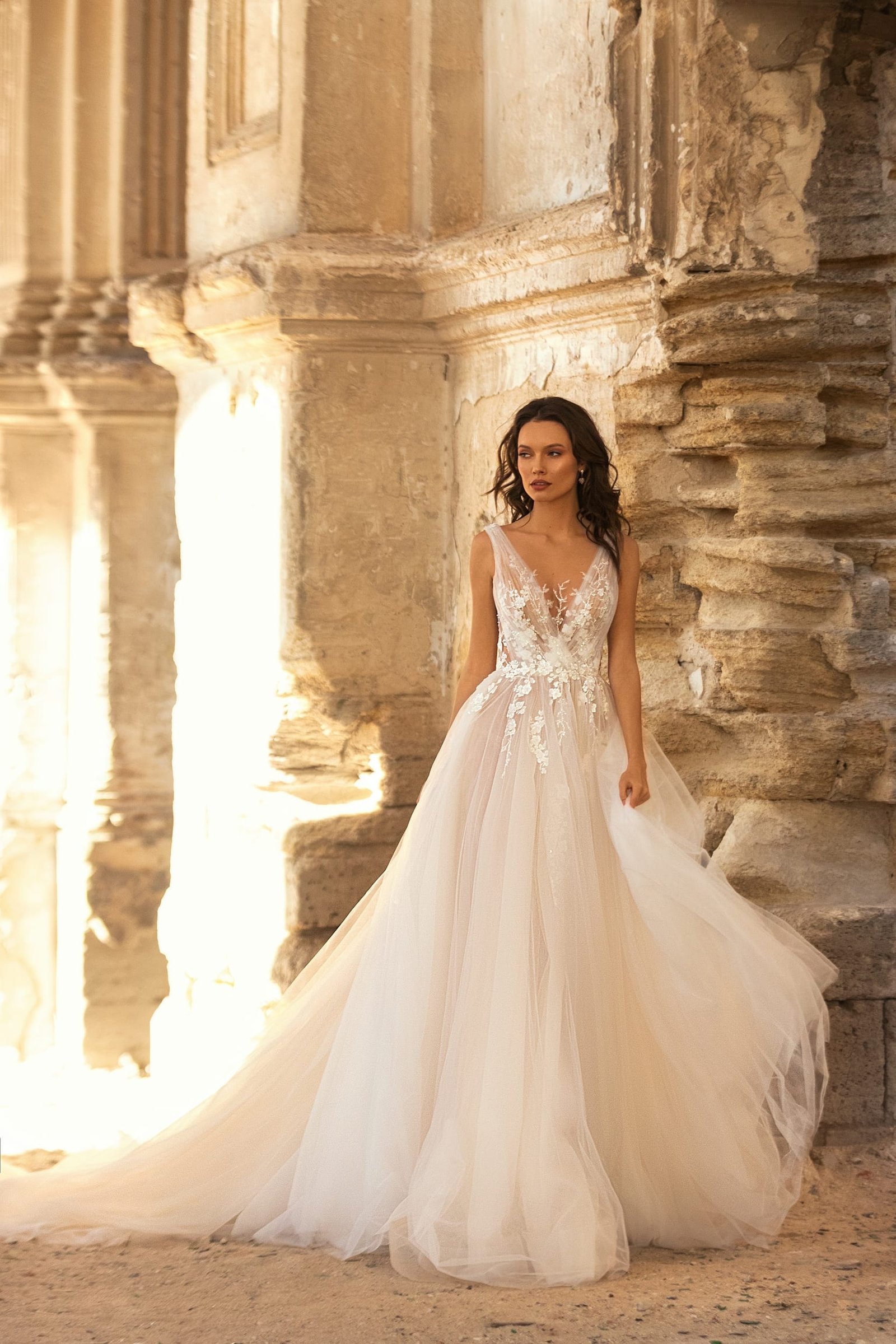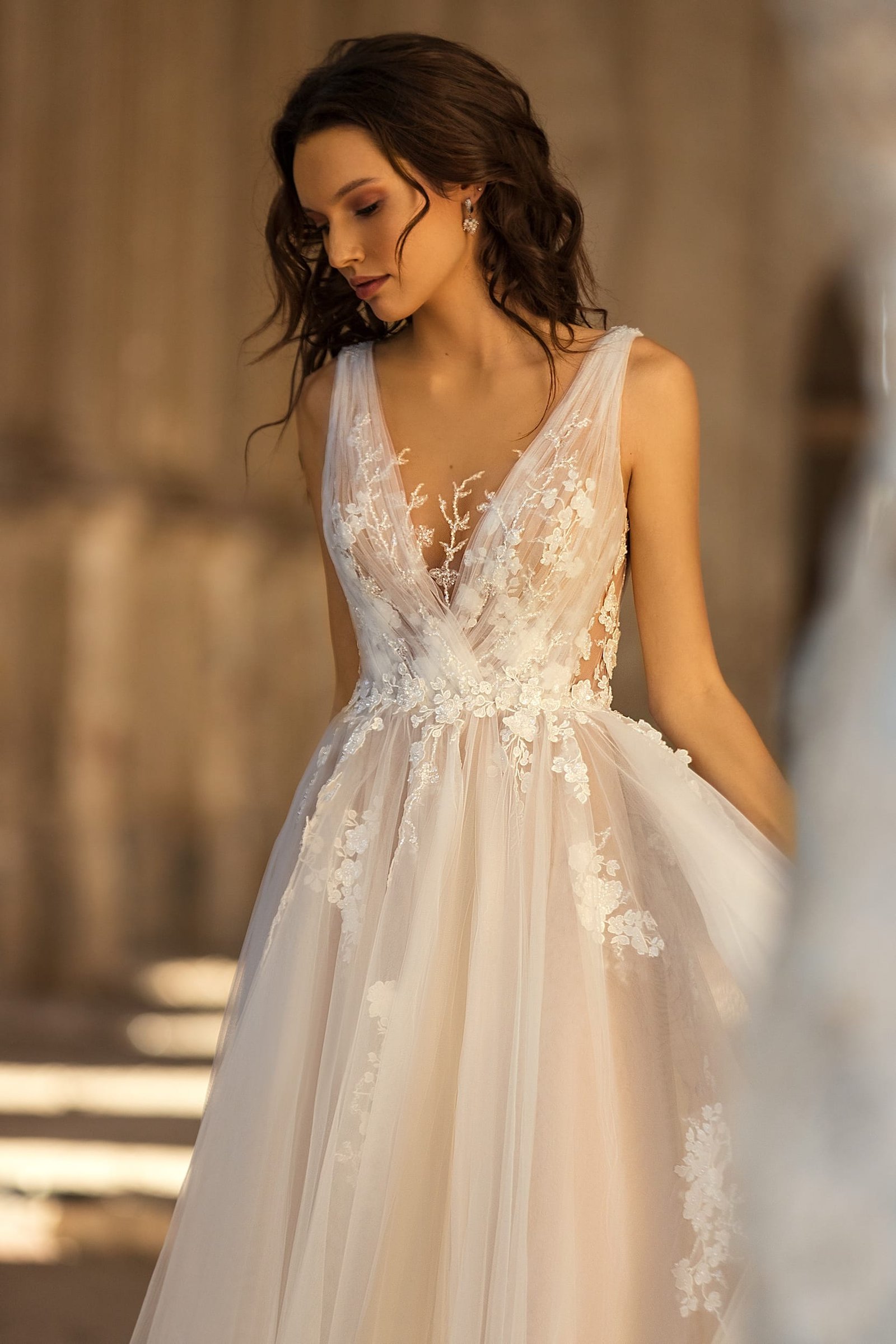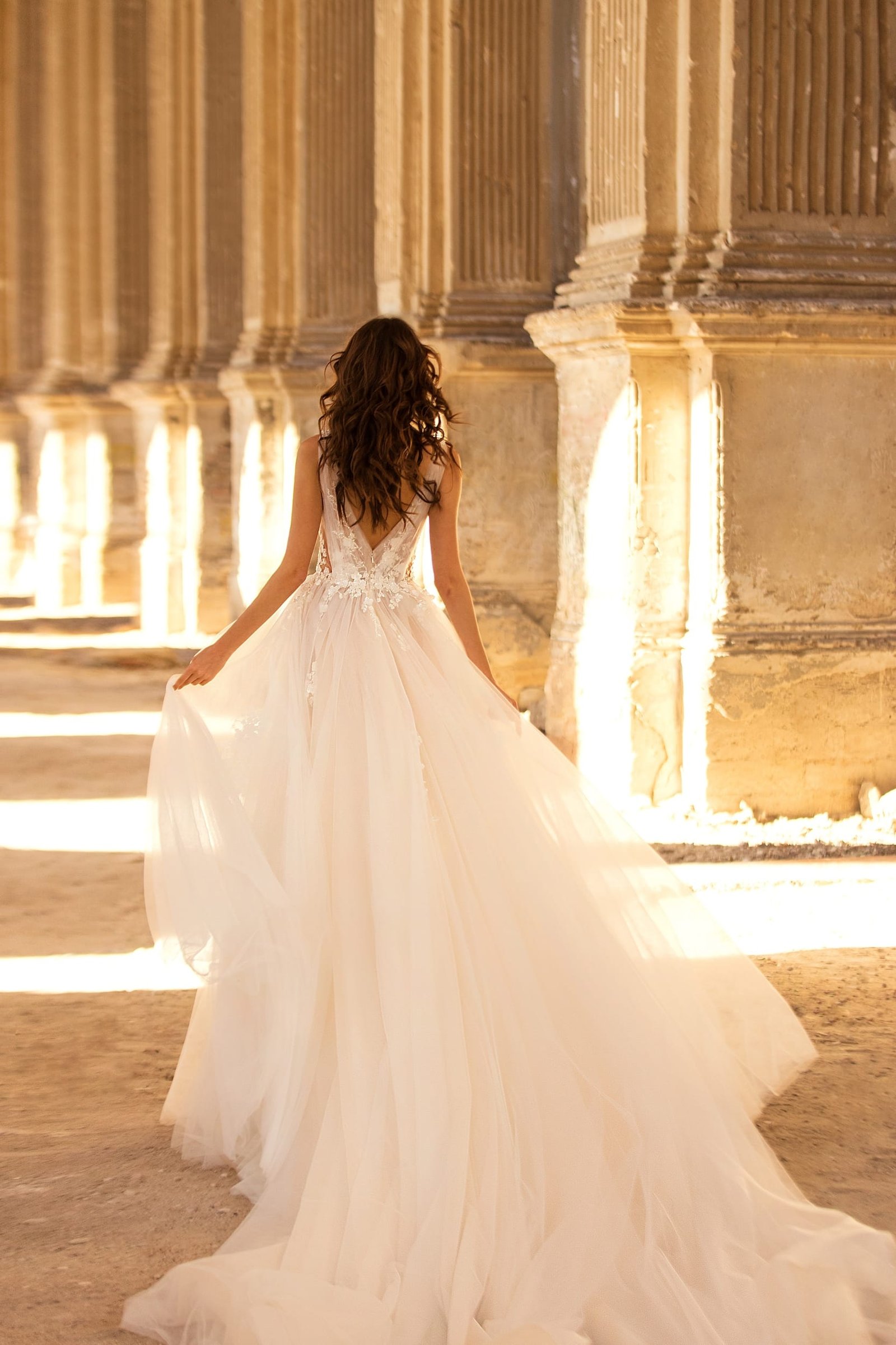 This tender wedding gown has a minimalistic and interesting design. A V-shaped neckline accentuates a beautiful decollate. The fantastic skirt passes into a long train.