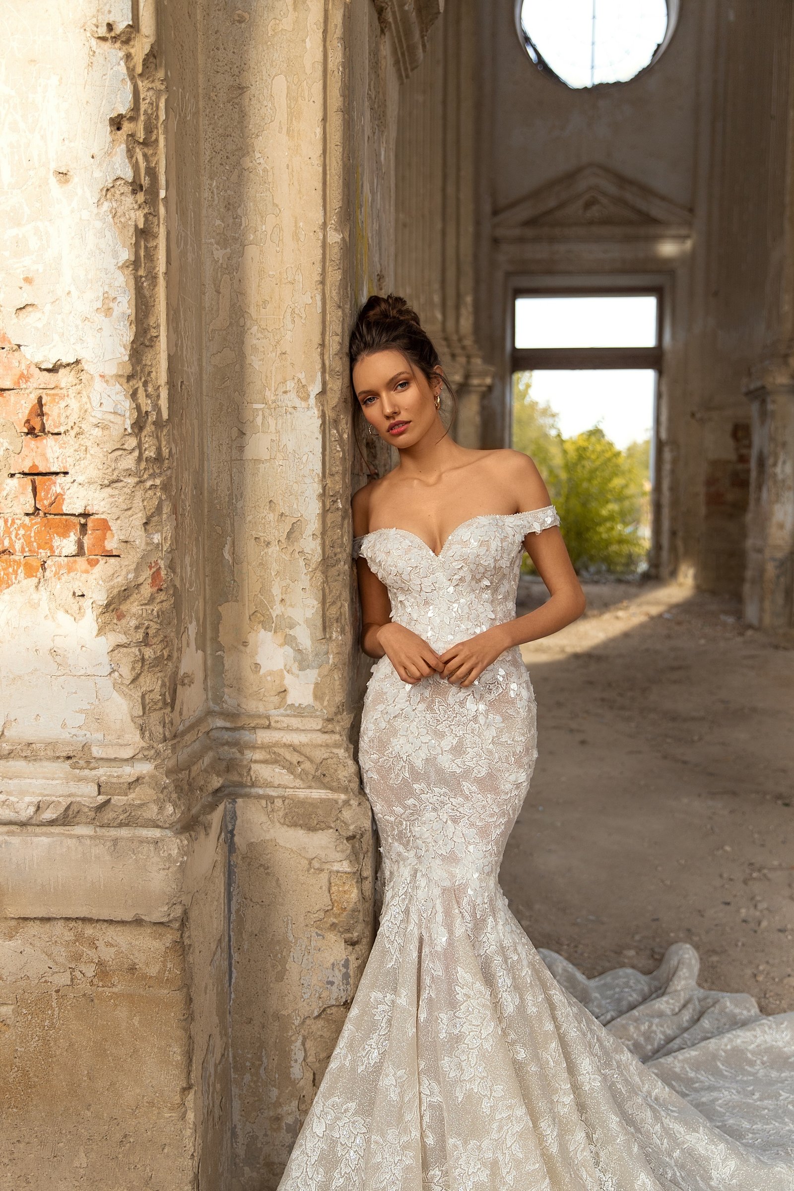 Paola gown is mermaid silhouette dress fully decorated with shiny lace. The off shoulders sleeves and sweetheart neck line are making this dress romantic and tender.