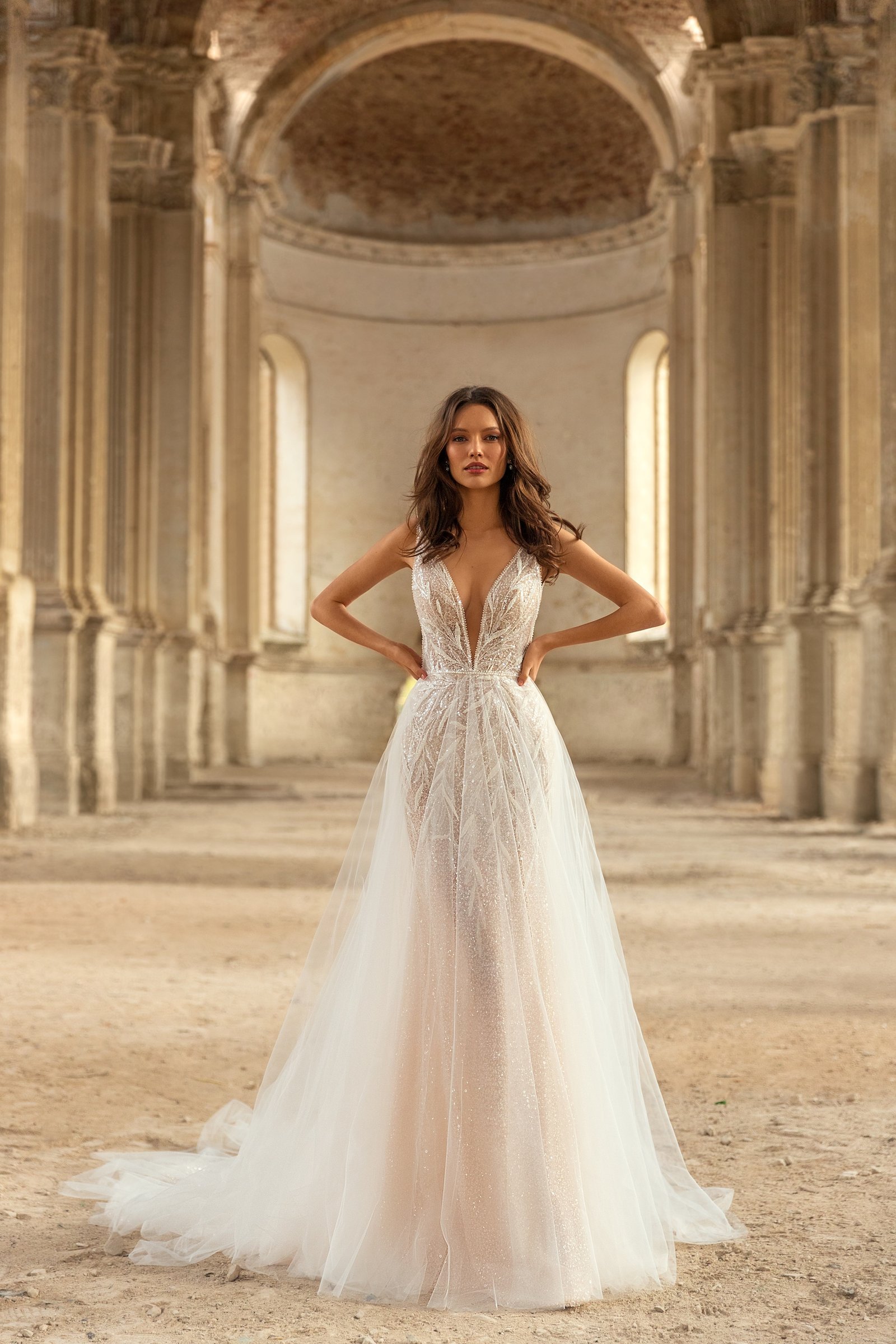A V-shaped neckline of the dress accentuates a beautiful decollate. A dress is decoded with beads and pearls. The skirt of the dress is combining unique lace, sparkly fabrics and tule.