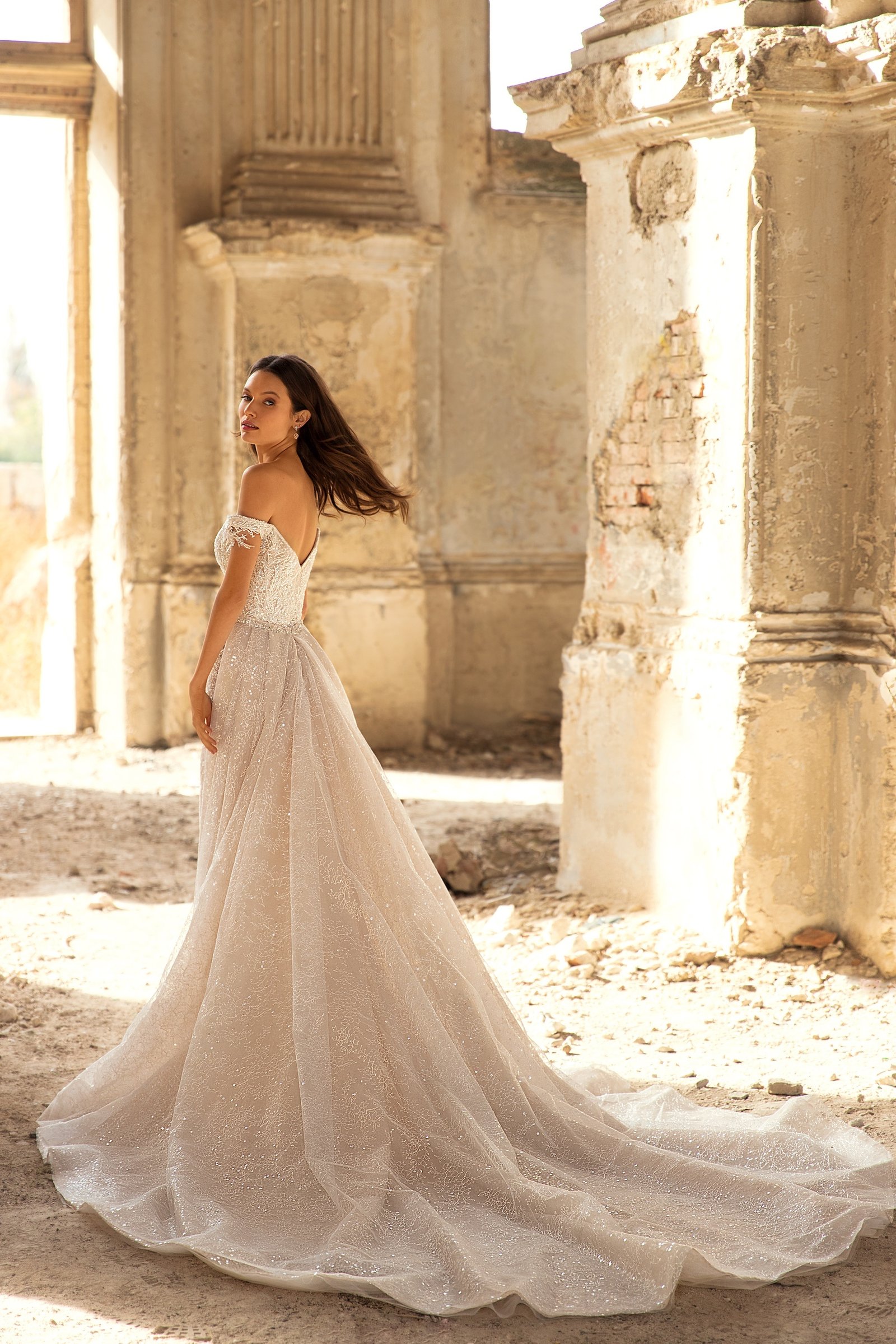 Sydney gown is fully decorated gown with a deep sweetheart neckline. The dress is perfectly matching with detachable skirt from the same lace.