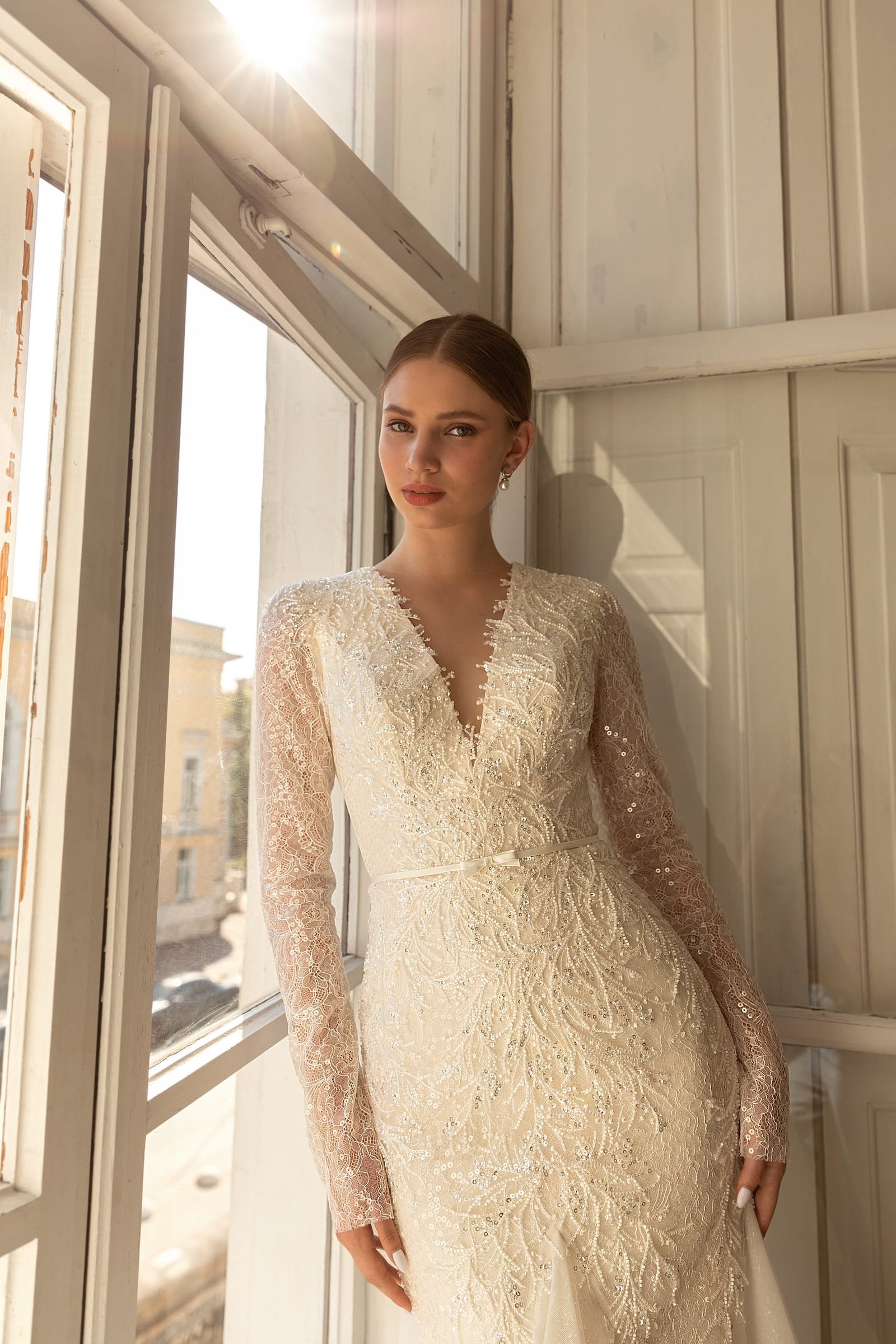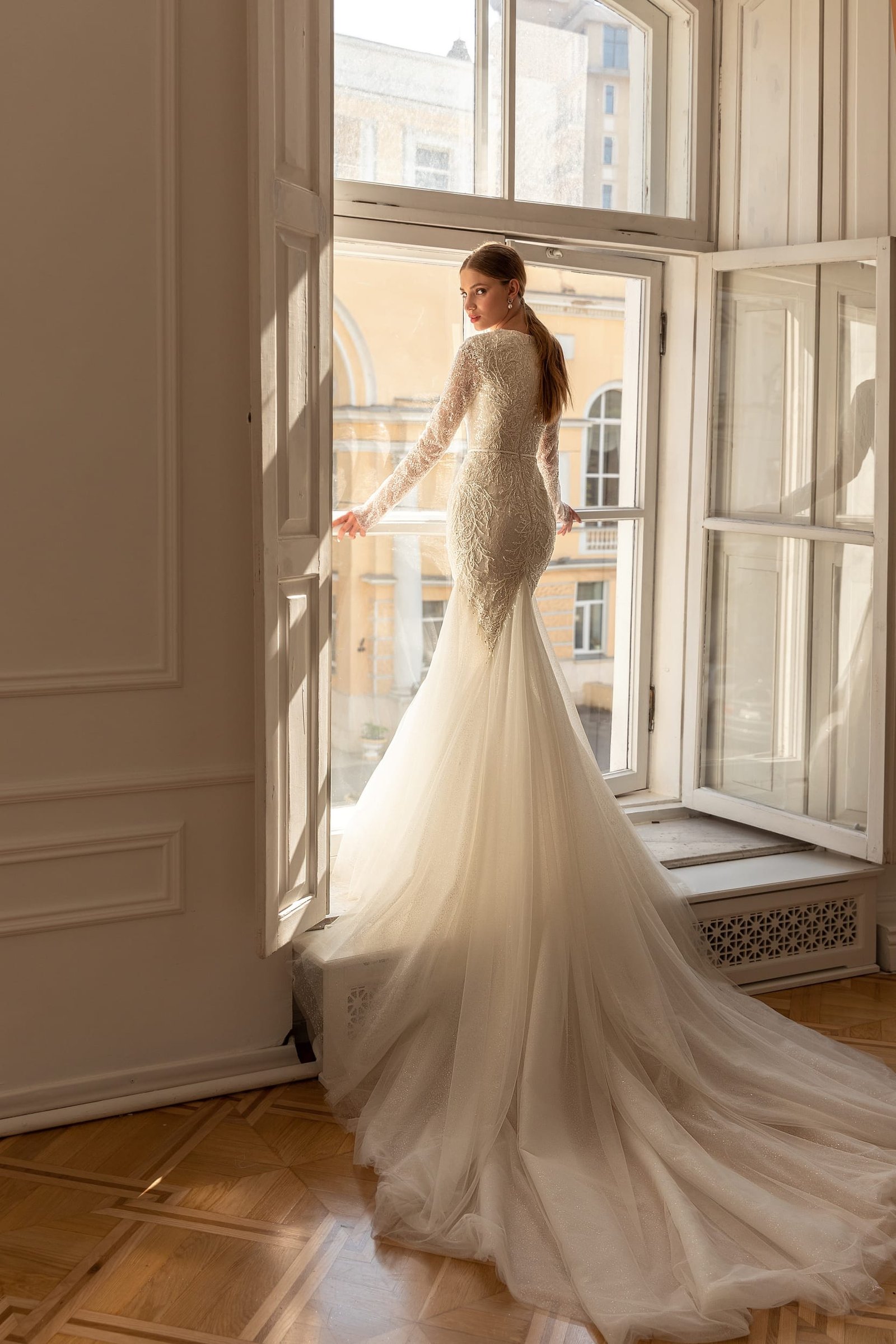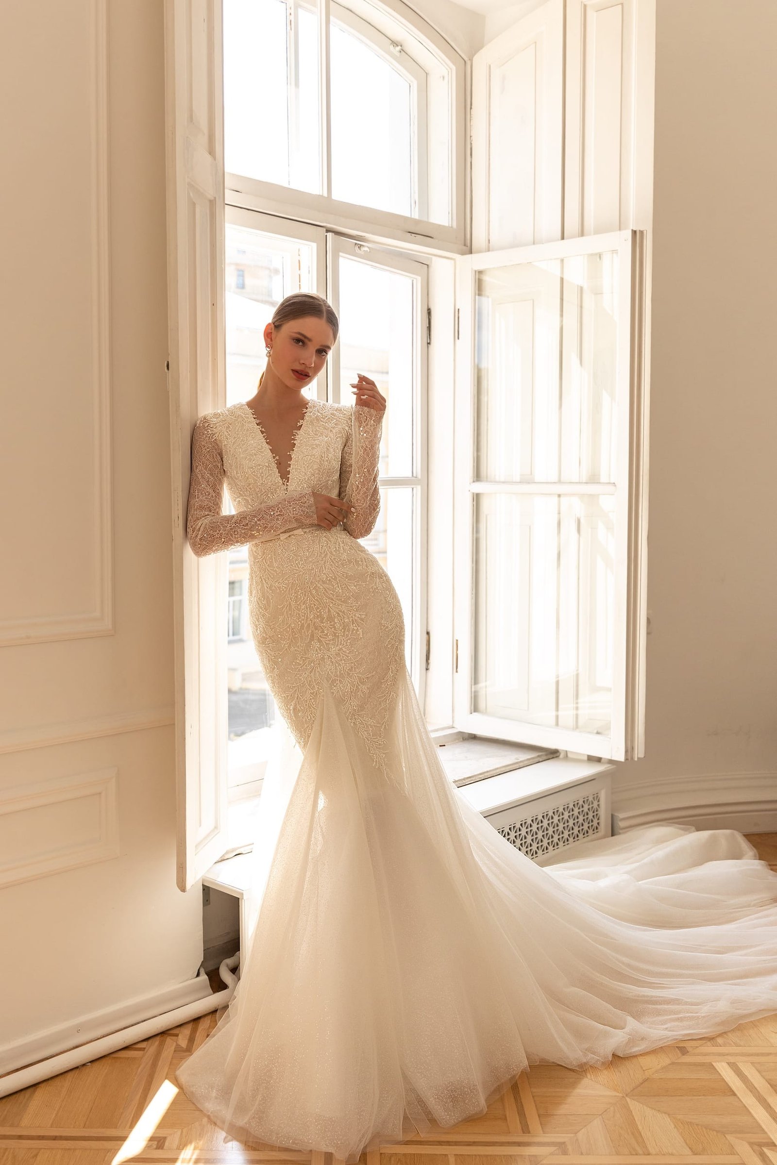 Darsi wedding dress is of classic mermaid silhouette that accentuates the bride's figure. The bridal gown is decorated with leaf patterned lace embroidered with beads, spangles and crystals along the whole length. The long sleeves are made of translucent lace decorated with sequins. A deep V-neckline makes this dress more seductive. The back of a dress is Closed with the same embroidered fabric. The skirt, fitted on the hips,is made of the embroidered lace and from the knees down it falls with layers of Tulle ending with a long train.