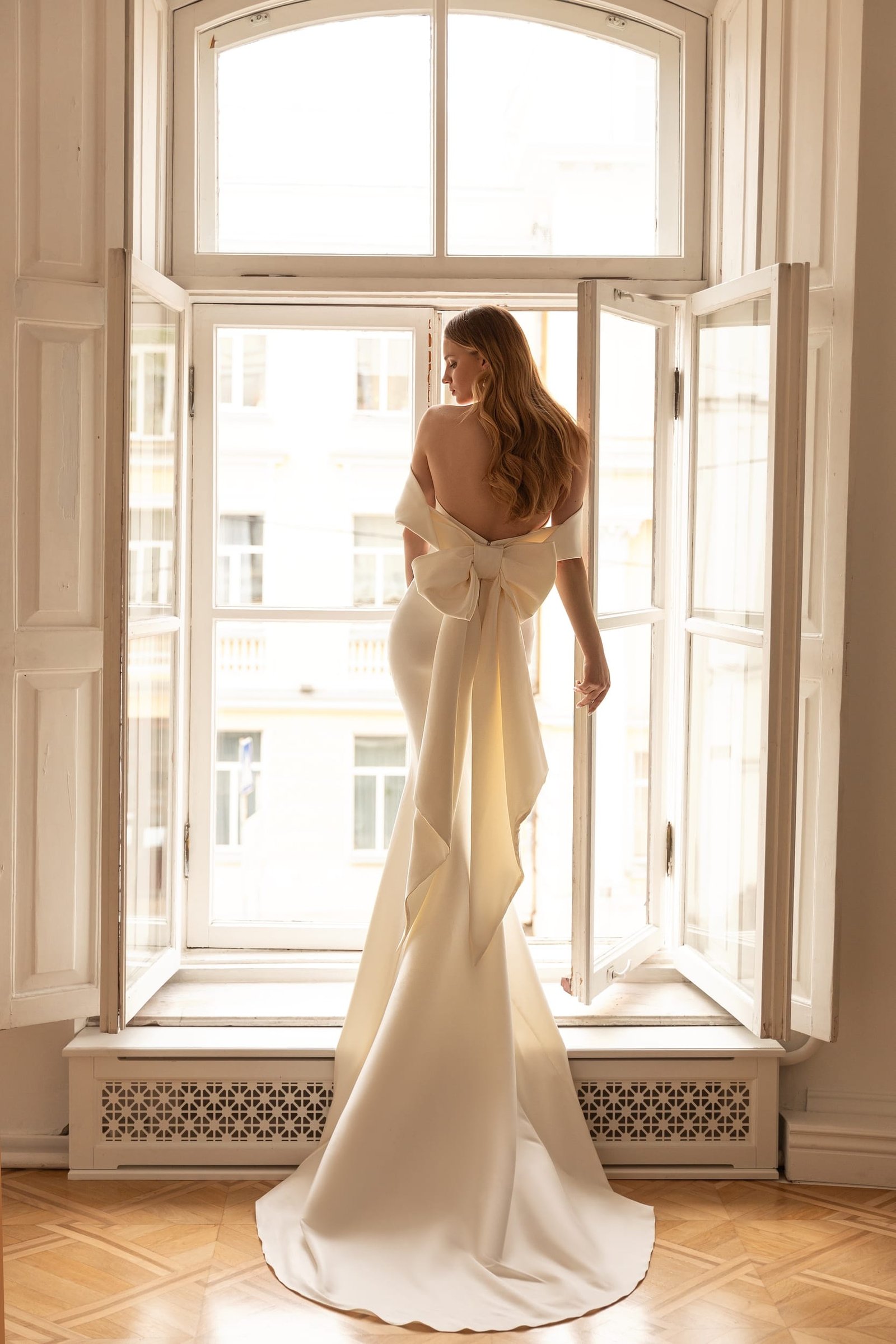 Delphi is an extremely romantic wedding dress made of glossy Mikado silk. Classic mermaid silhouette helps to highlight the figure and the off-shoulder neckline accentuates the collarbones. The strapless corset has a wrap around the shoulders which finishes with a marvelous bow on the back of the dress. The skirt is fitted on the hips and a bit flare down passing into a long train.