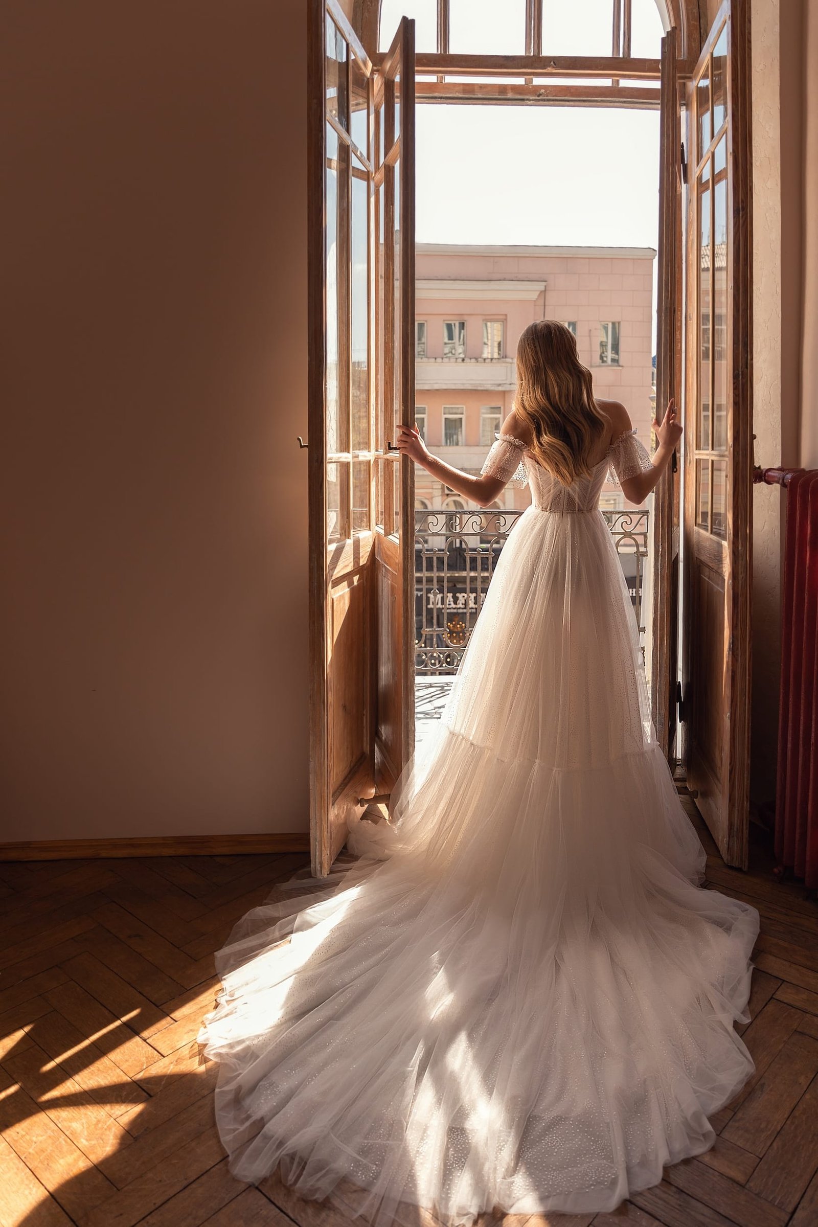 Fabian is a tender and fragile wedding dress which will make you feel like a princess. A combination of fabrics and A-line silhouette look gorgeous. The strapless corset with lowered shoulders decotated with transparent falbalas are embellished with patterned lace. The skirt has the same pattern and the lightweight fabric made of veiling is decorated with wide falbala on the bottom. The veiling skirt passes into a long train.