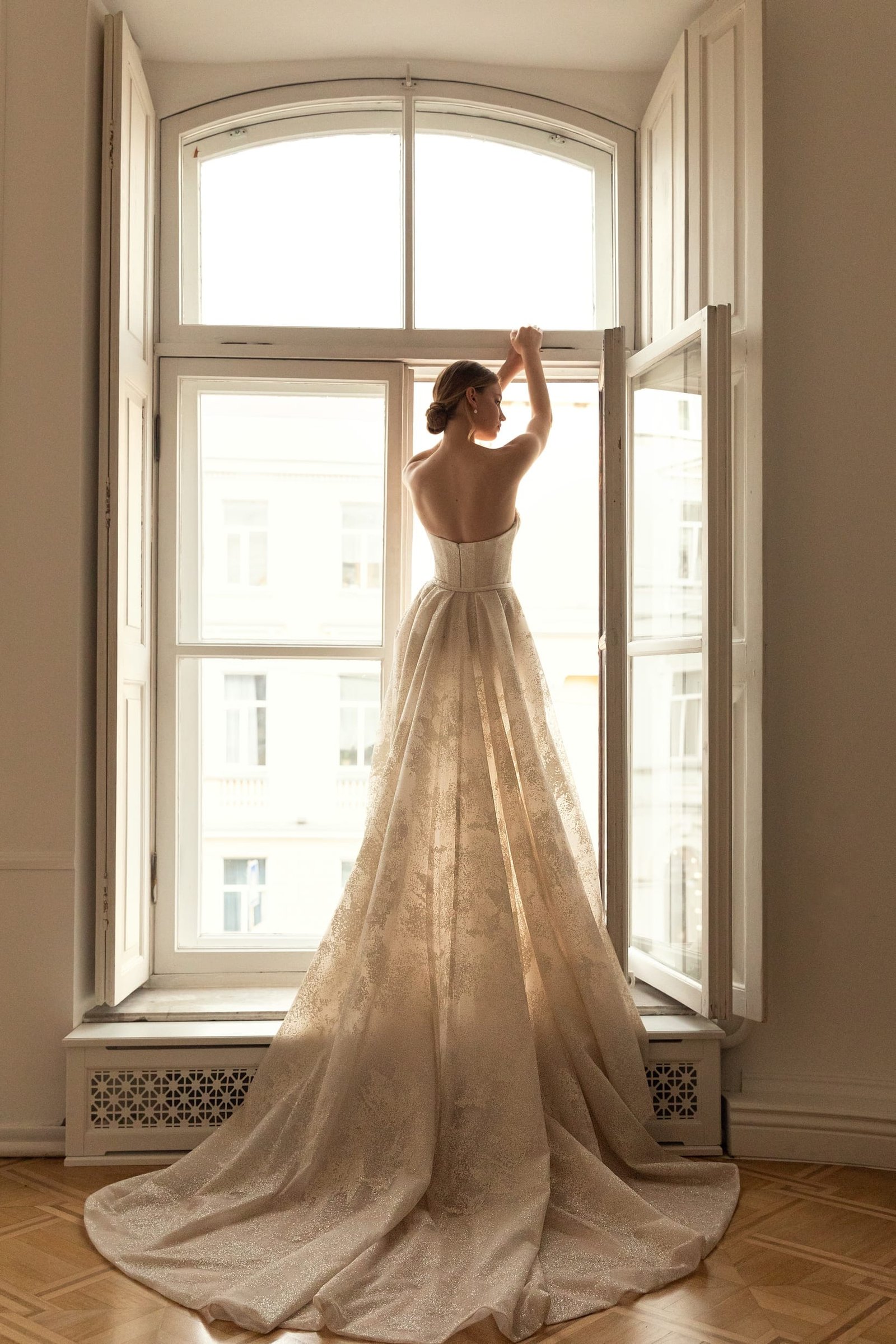 Milena wedding gown is entirely made of sparkling fabric with light pattern in soft Ivory colour. The corset is strapless and has a feminine sweetheart neckline. The sheath dress has a Straight cut, is fitted on the hips and becomes looser down the silhouette. The detachable skirt is fixed on the waist and has a fabulous train.