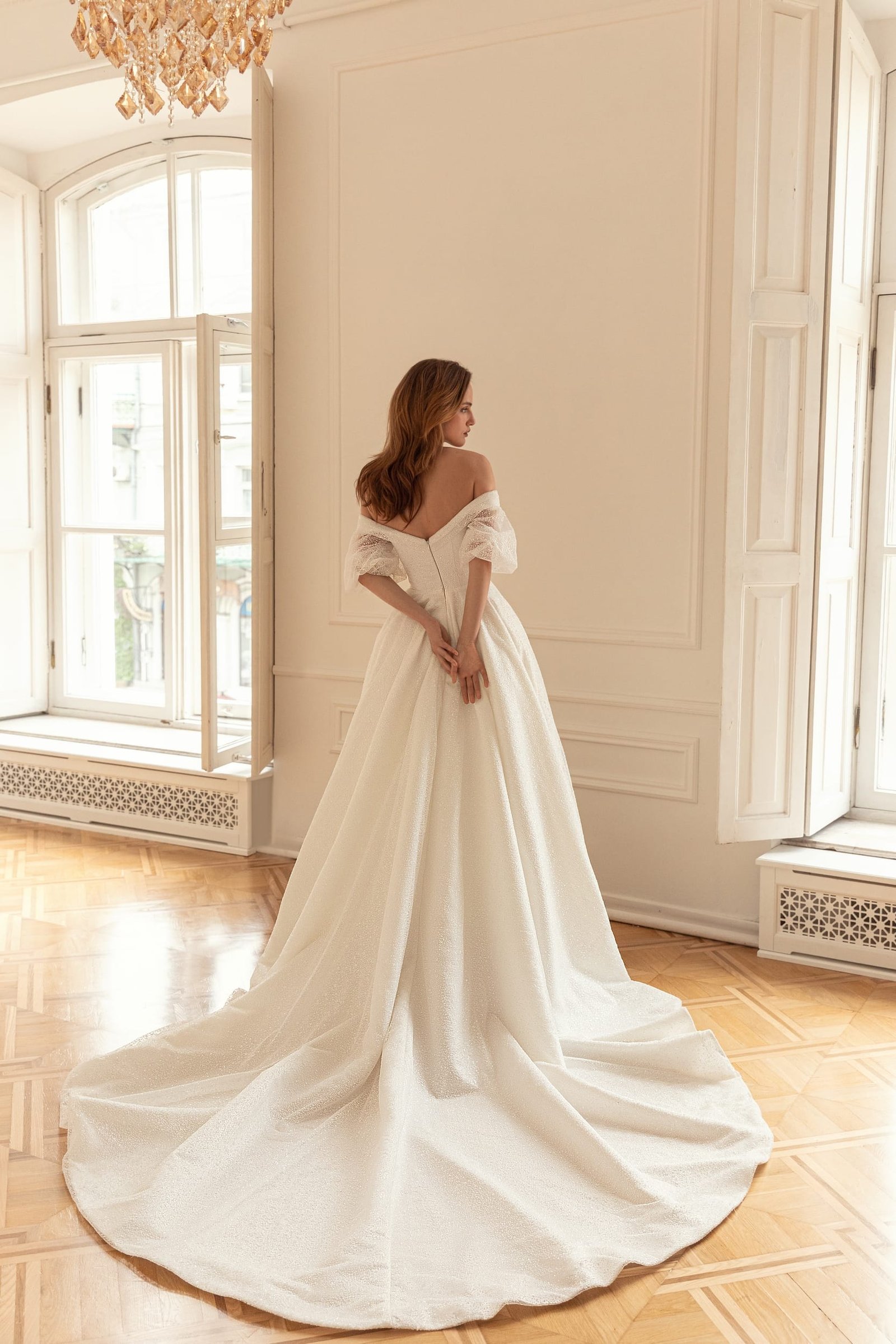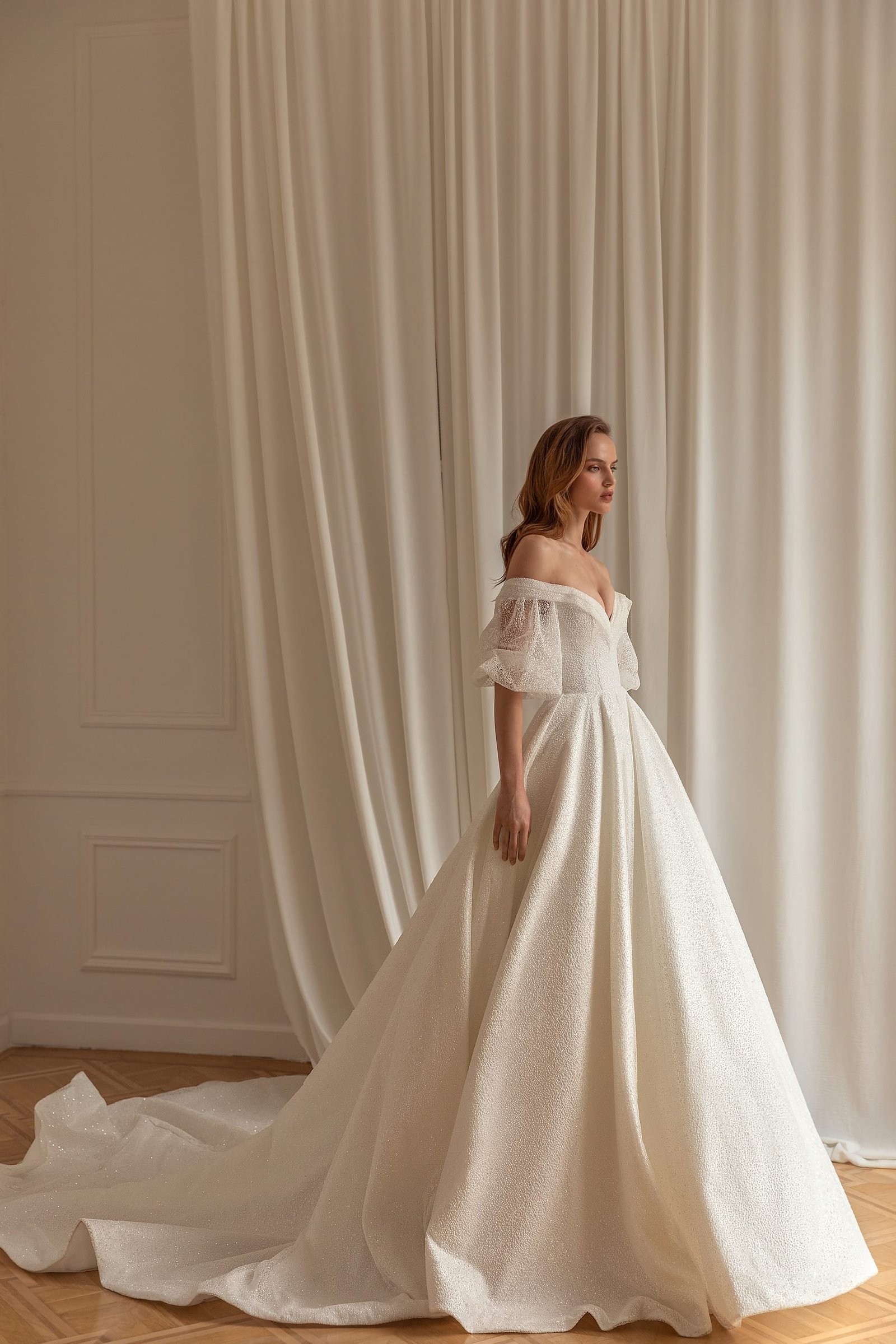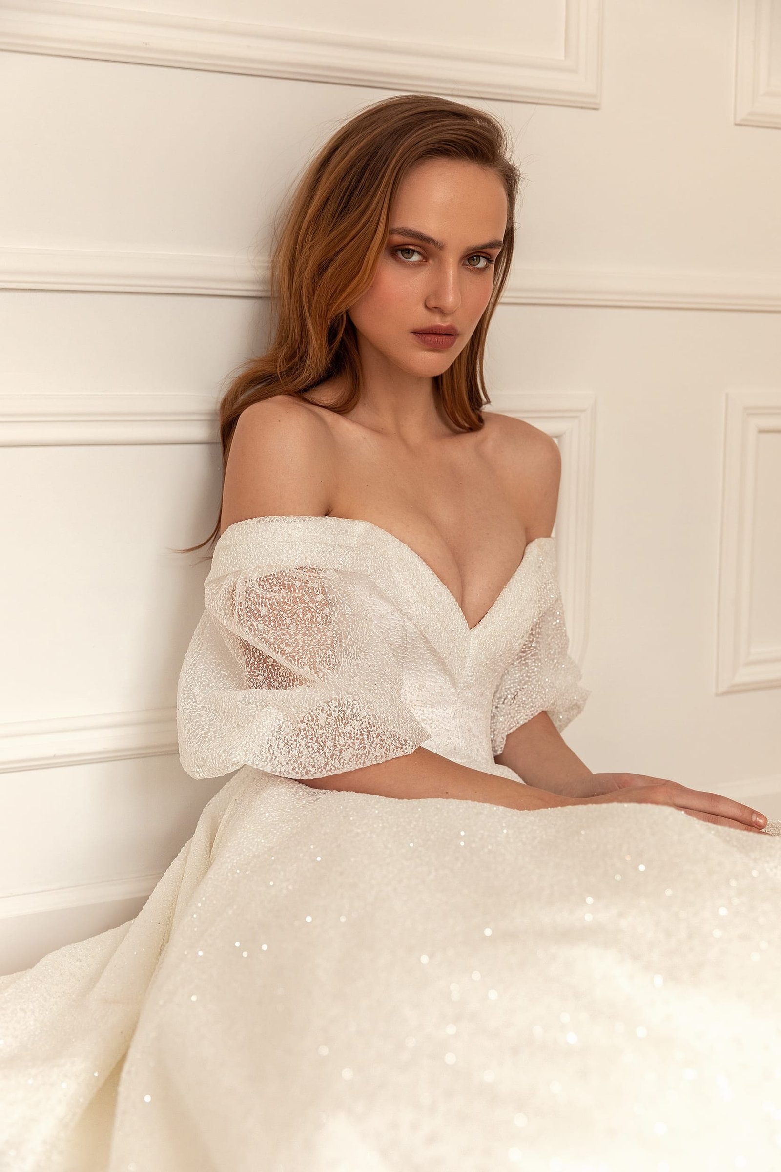 Rosie wedding gown is a perfect choice for a fashionable and chic bride. This ball gown silhouette dress is totally glmorous fully made of glossy embroidered lace decorated with spangles. The off-shoulder neckline is embellished with deep sexy decollete and loose elbow length sleeves made of translucent sparkling material. The gorgeous skirt passes into a long train.