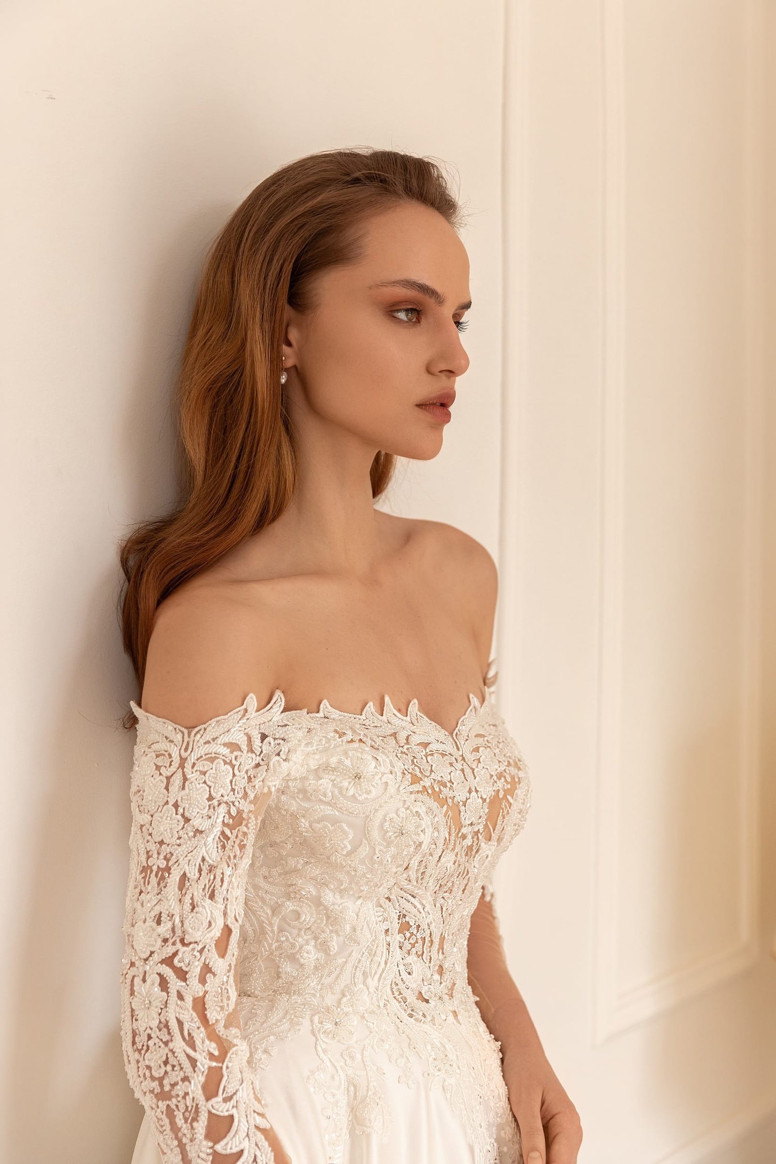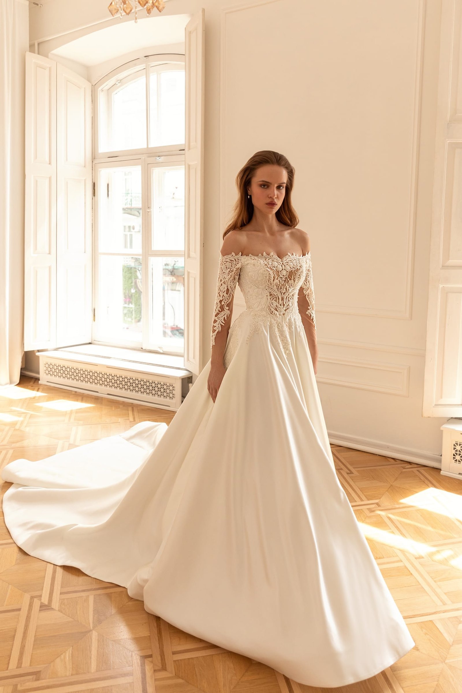 Sigrid is a bridal gown to create a real royal look. The top of the dress is fully decorated with embroidered lace with beads and spangles. The top has a V-shaped off-shoulder neckline on the front and on the back of the dress. Semi-transparent long sleeves are embellished with the same lace add luxury. The beautiful A-line skirt made of glossy satin passes into a long train.