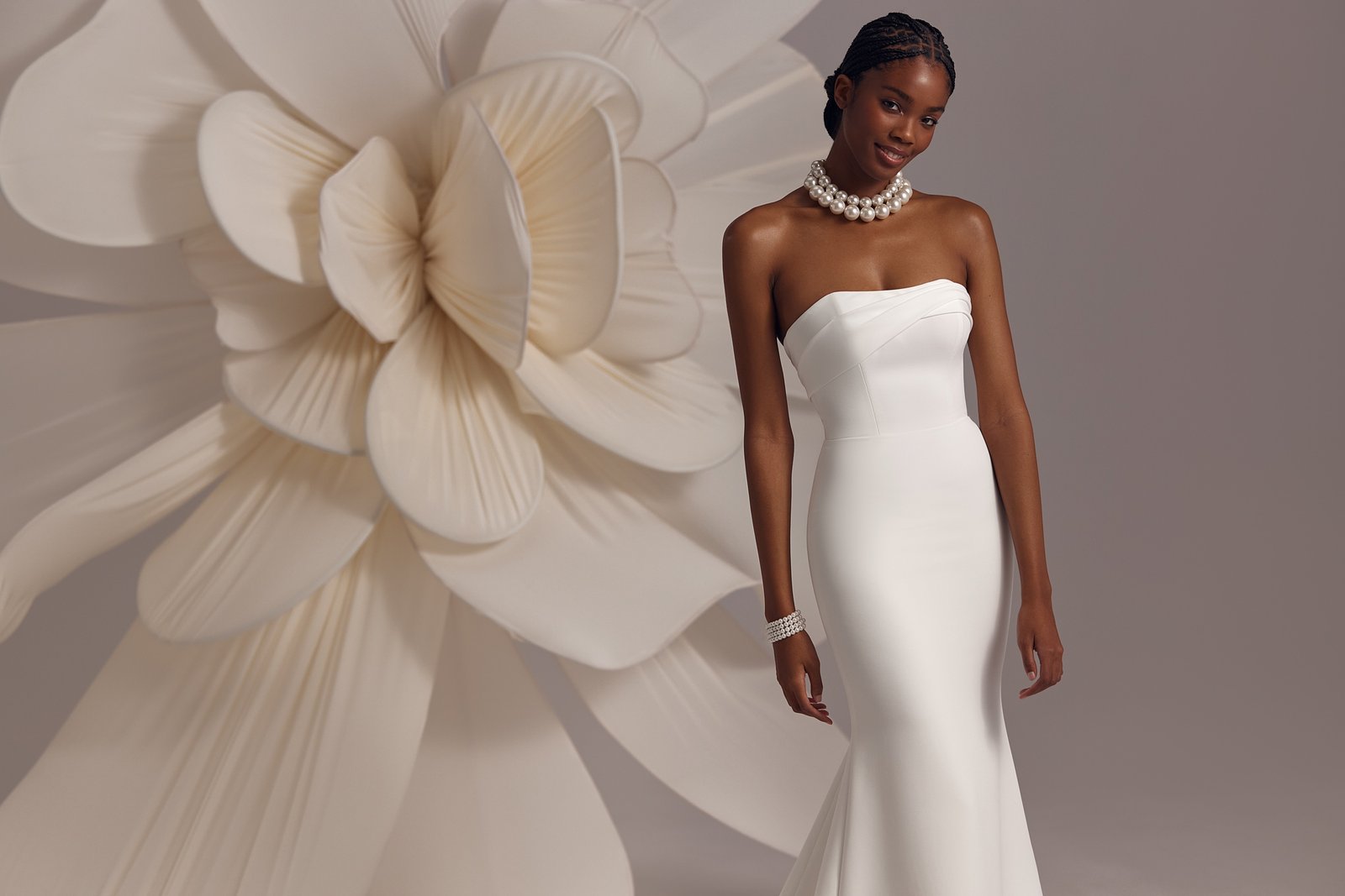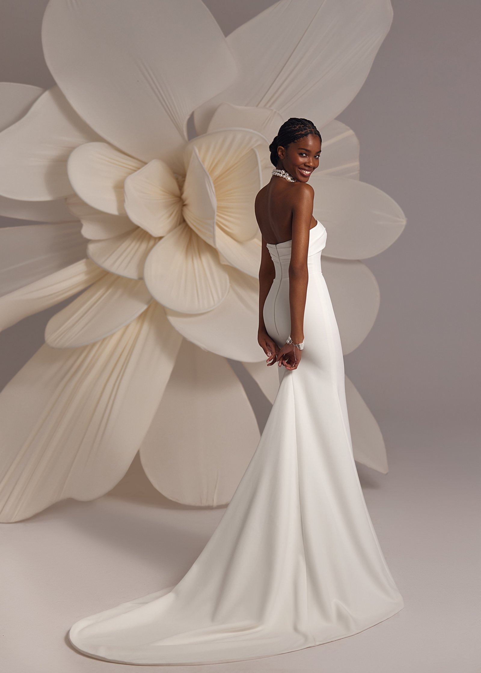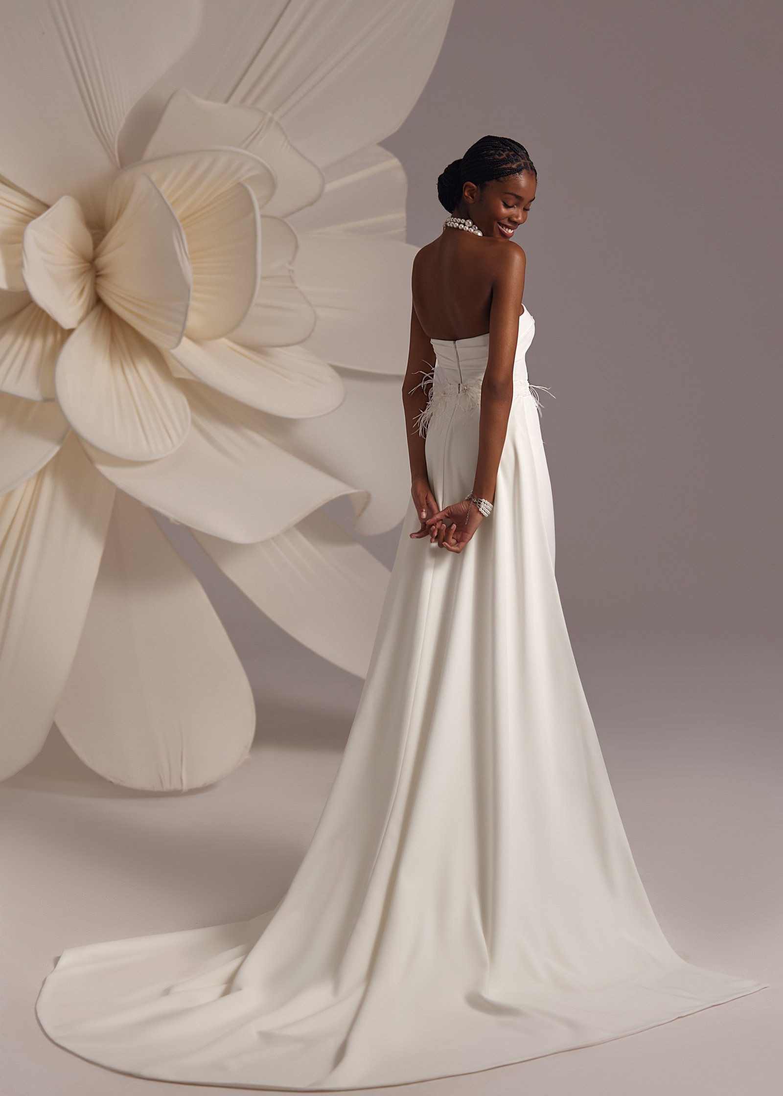 Amalfi – modest and elegant fitted straight silhouette dress with asymmetric corset detail over the neckline and detachable feather floral belt over the fluid skirt.