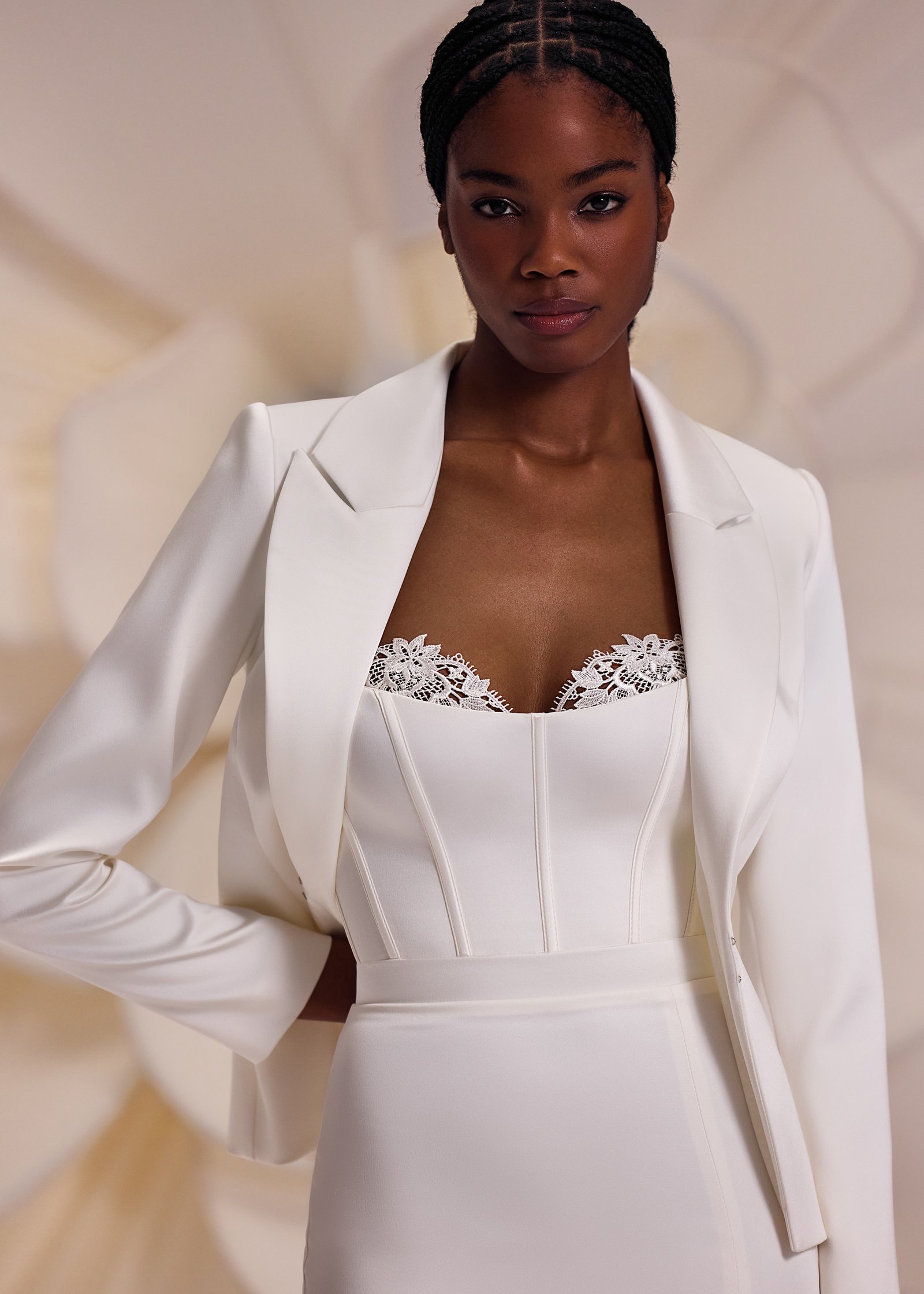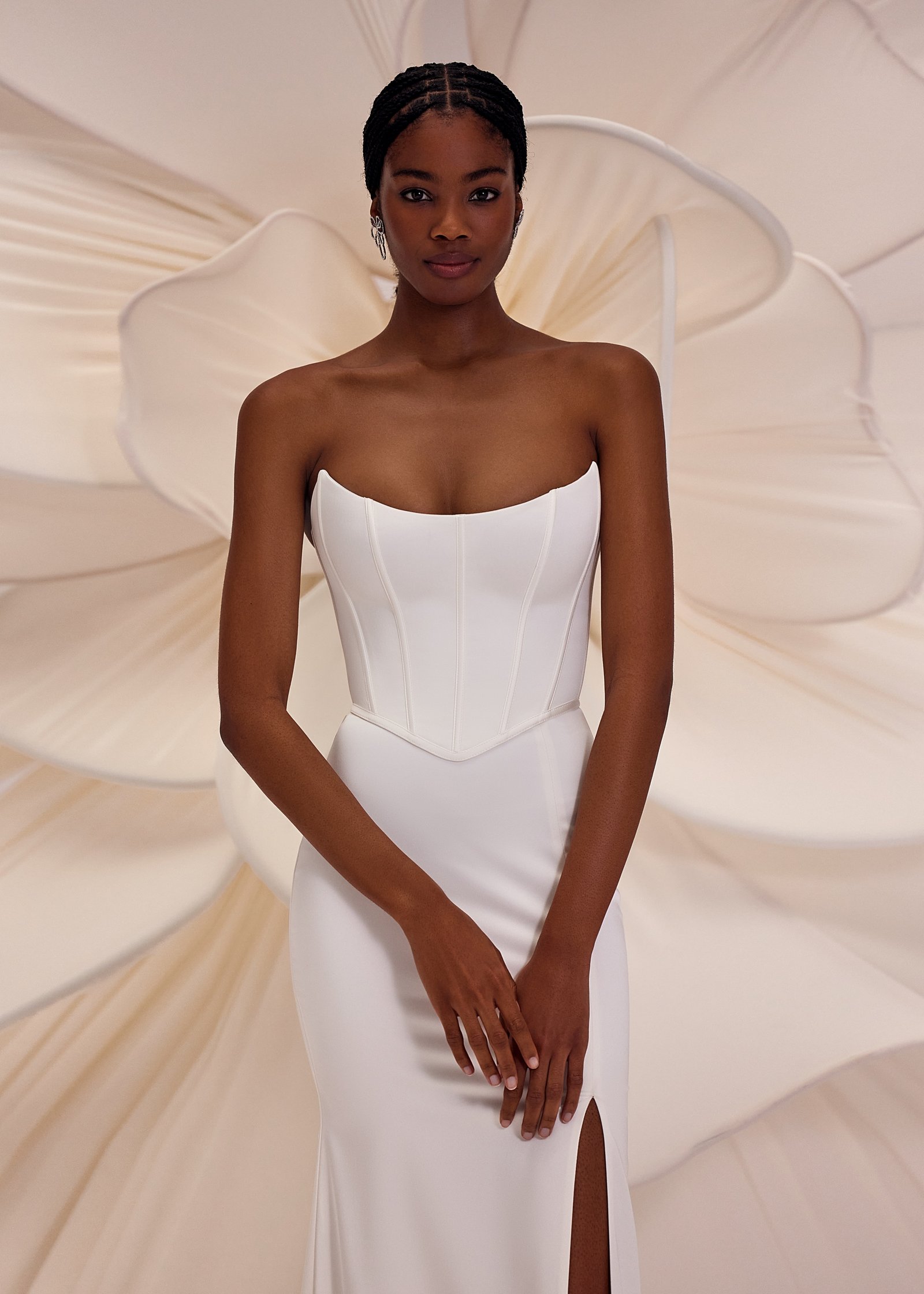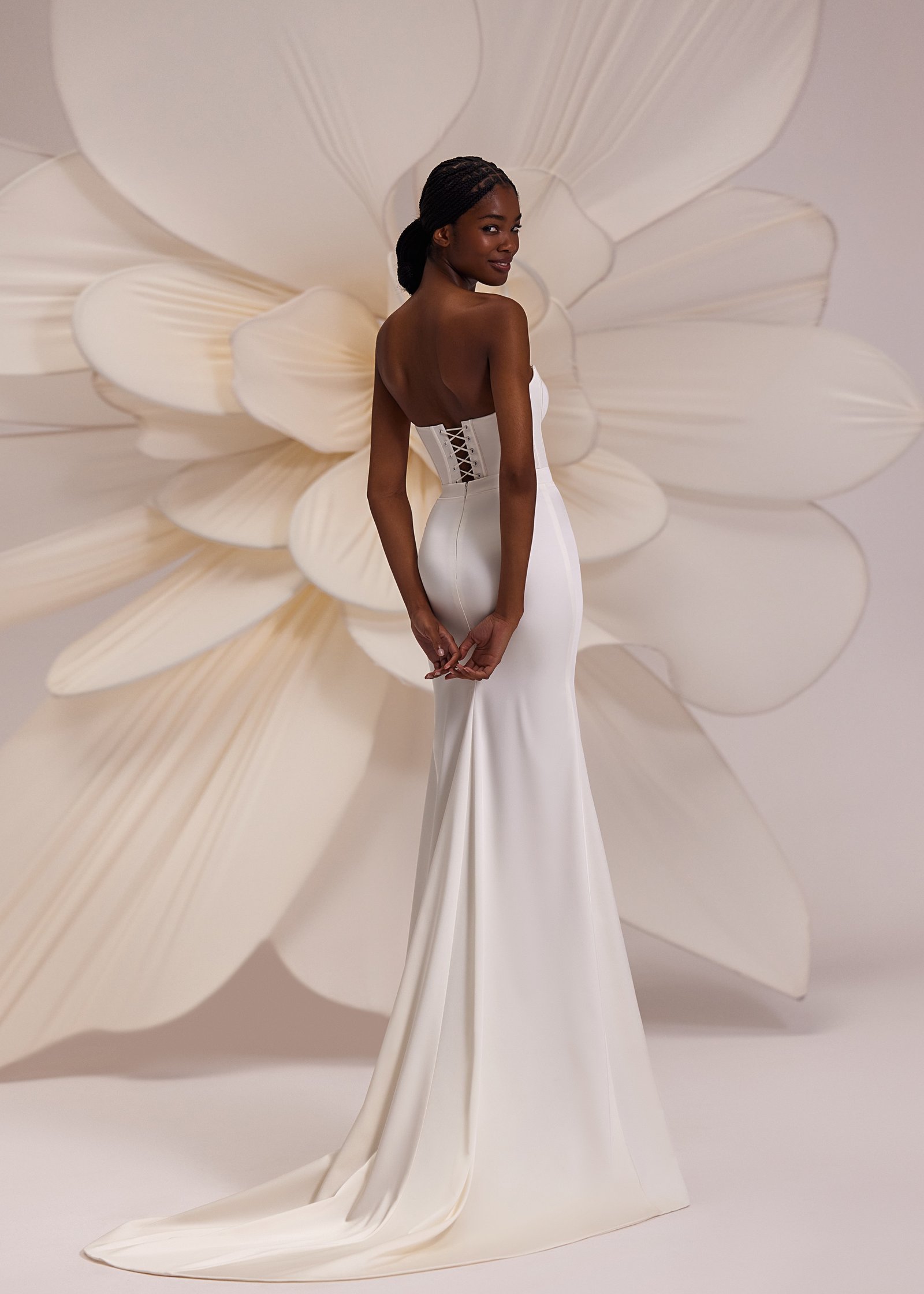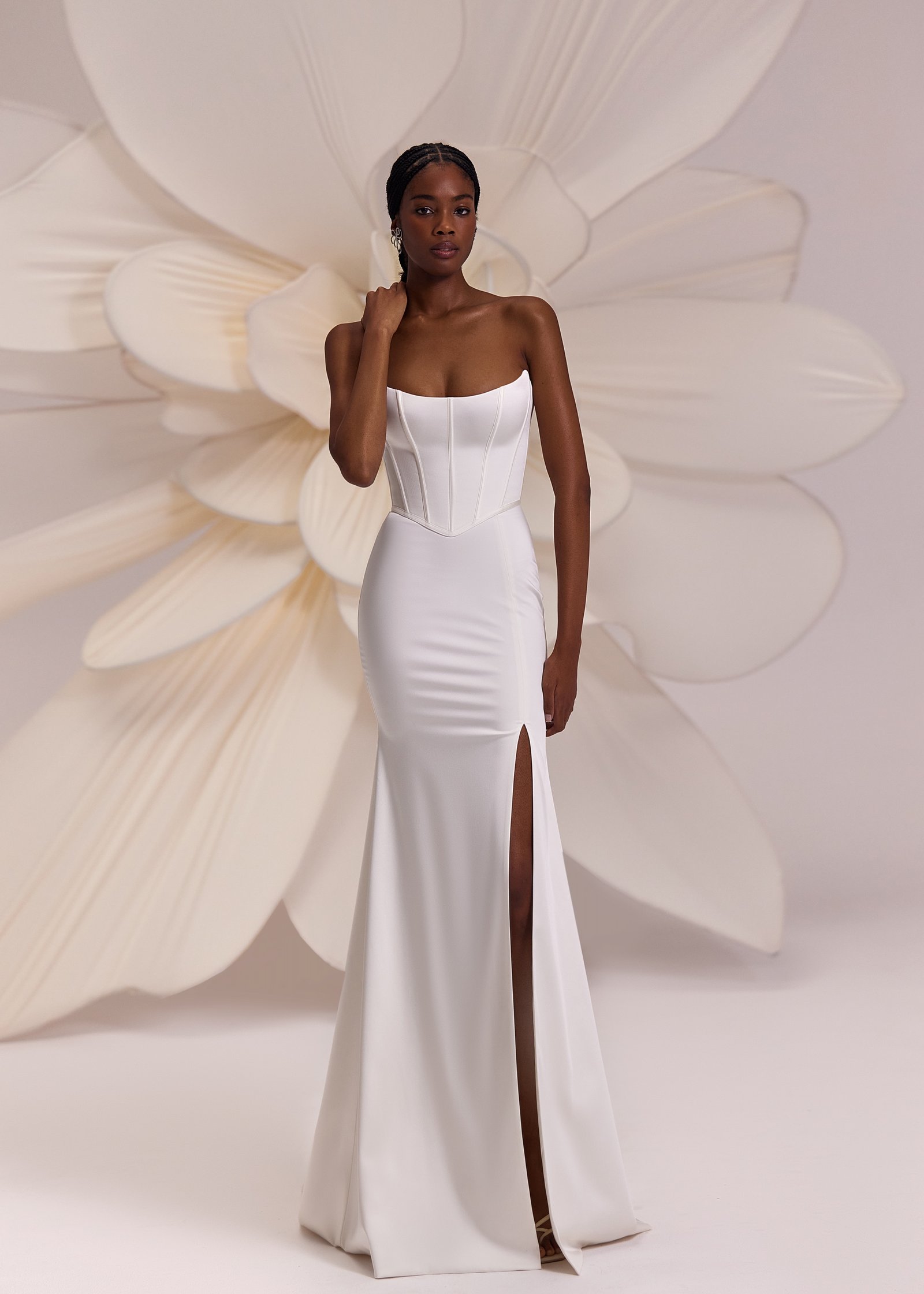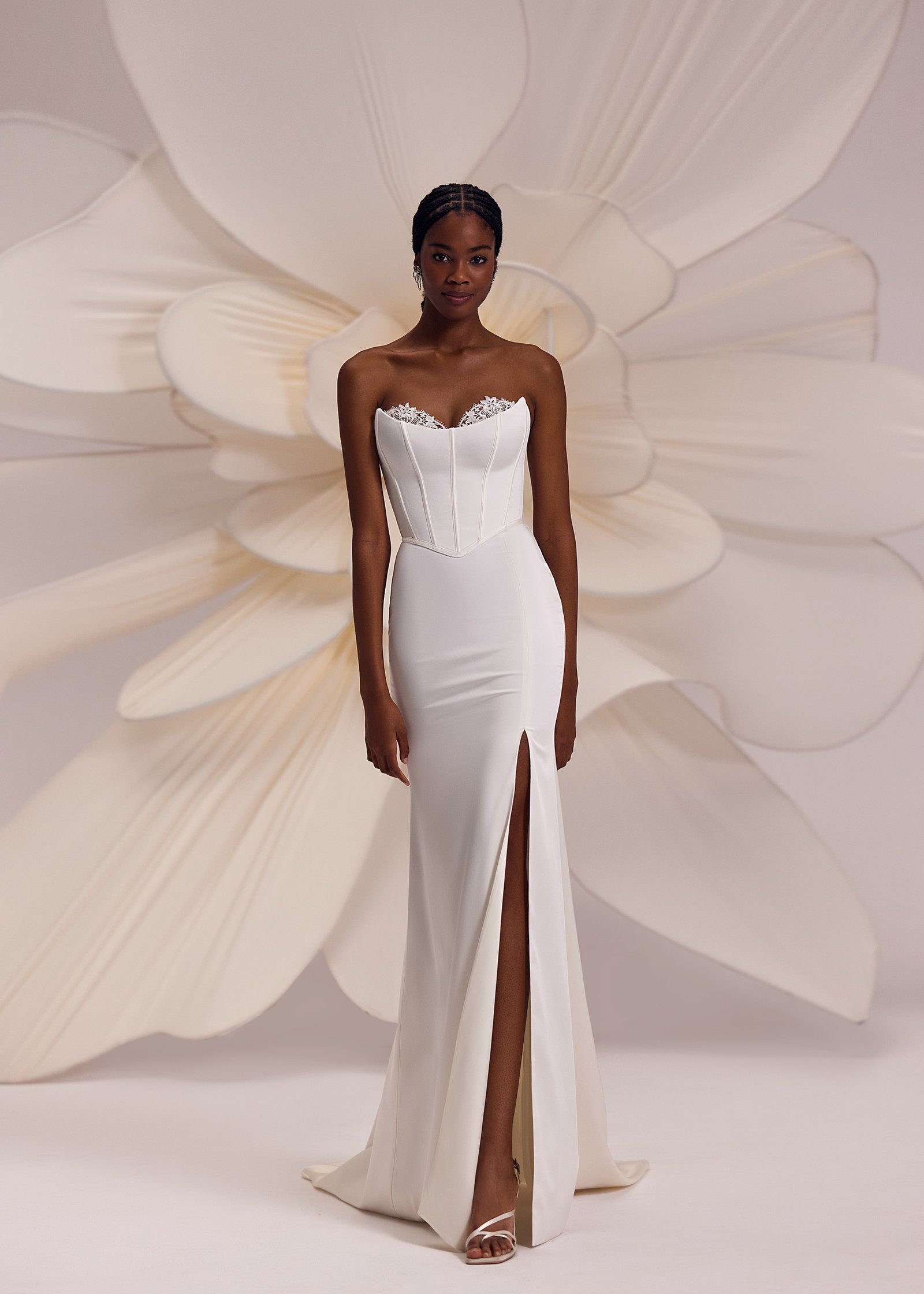 Calgary – fitted straight silhouette dress with heart-shaped neckline decorated with a lace panel in the upper side, split skirt is elongated and extended with a little trail.