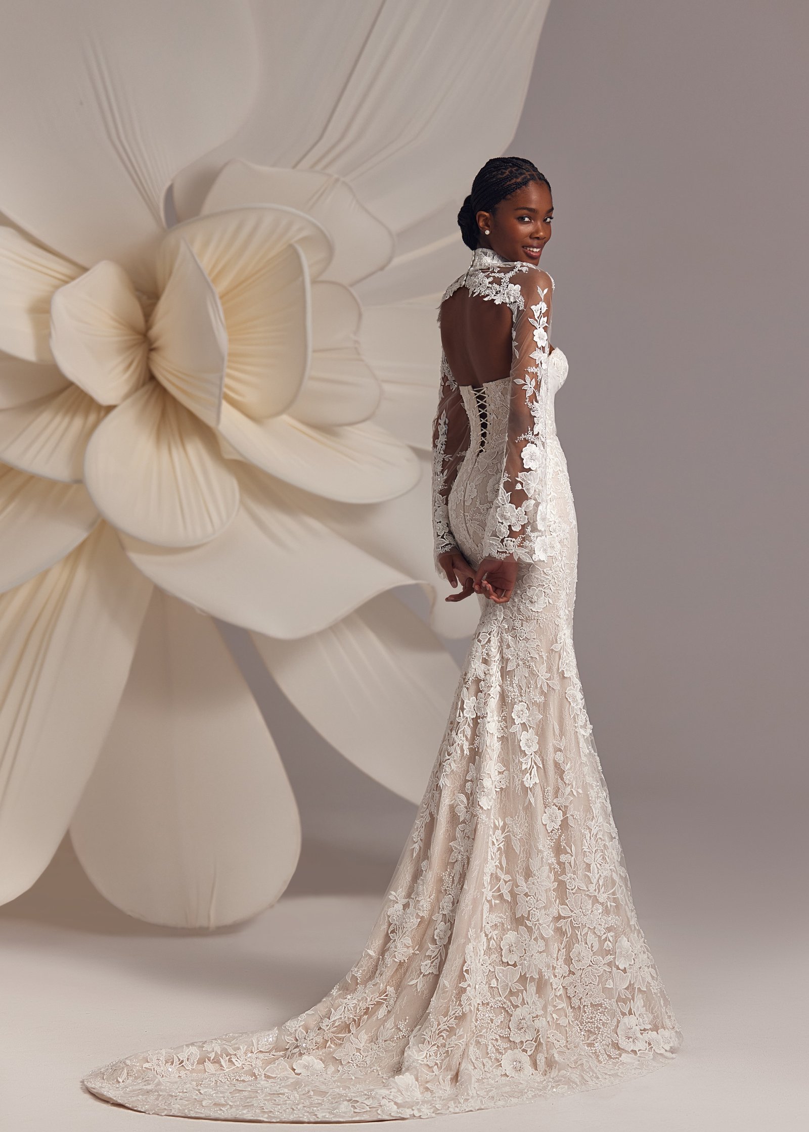 Darla – guipure lace-up heart-shaped neckline corset dress with turtle neck long-flared-sleeve bolero embroidered with floral ornaments and an overlayer of floral designs on mesh all over the dress.