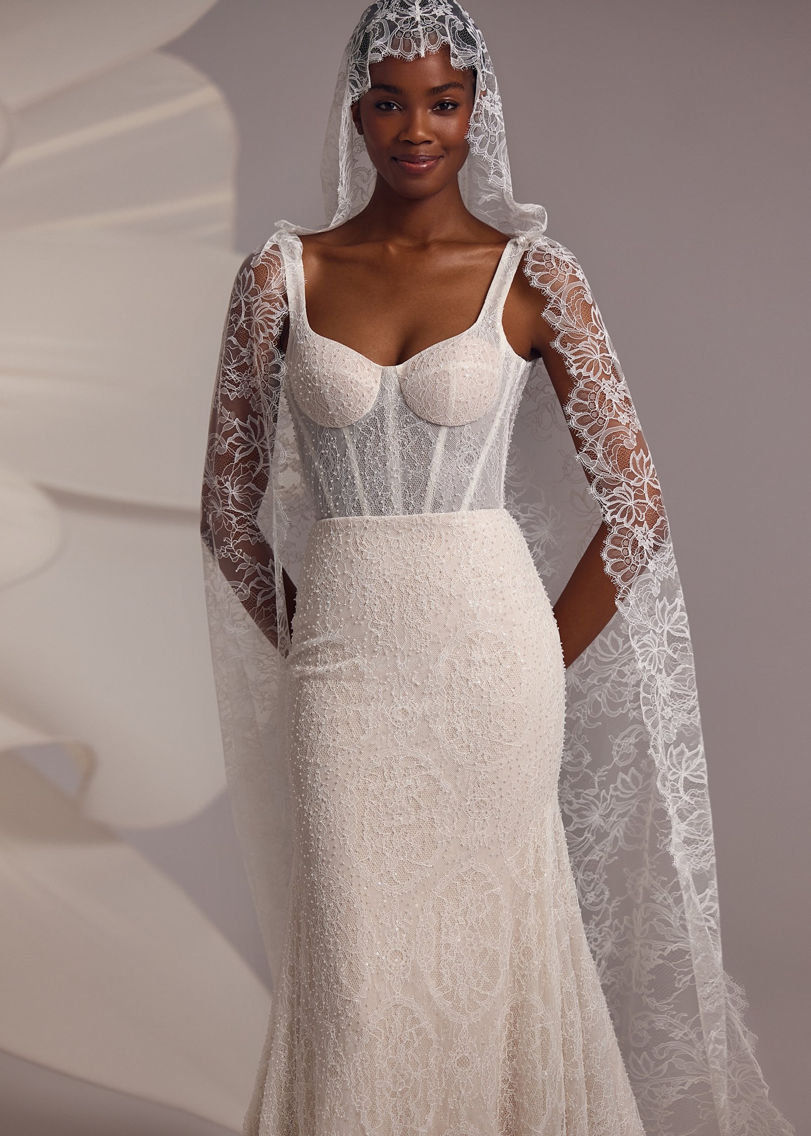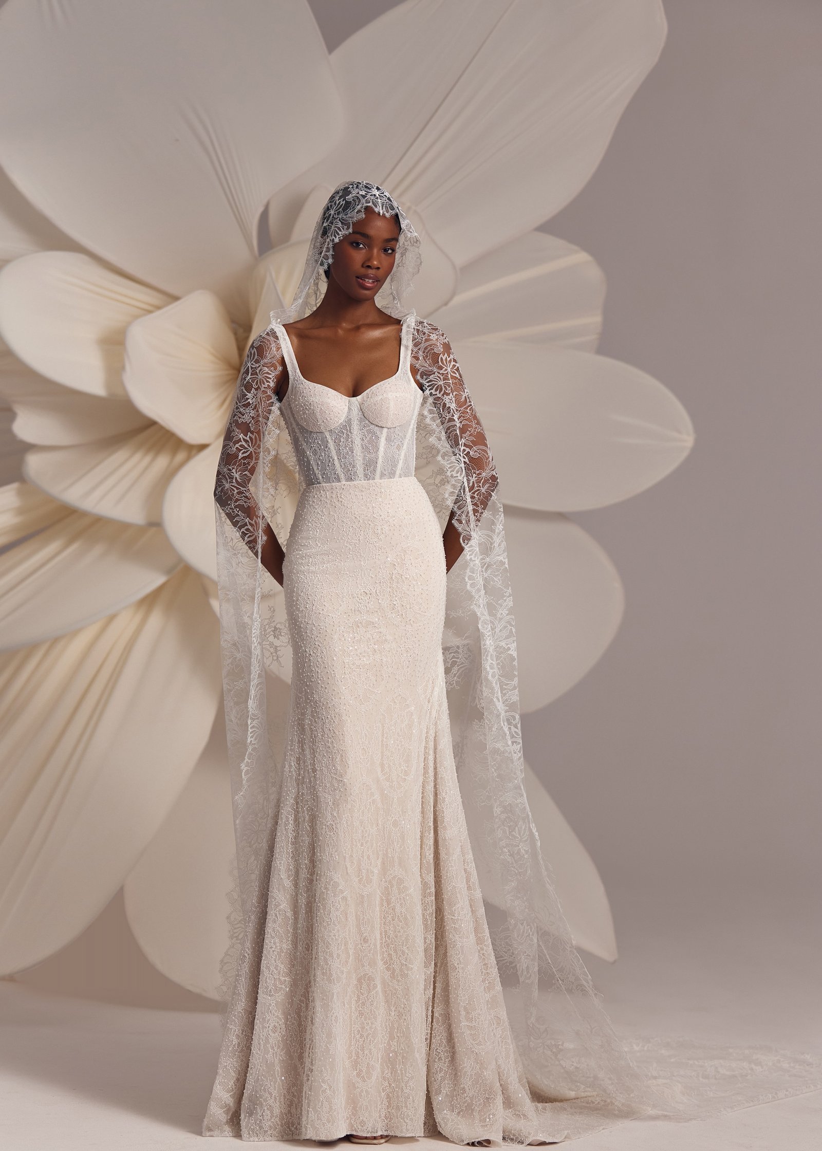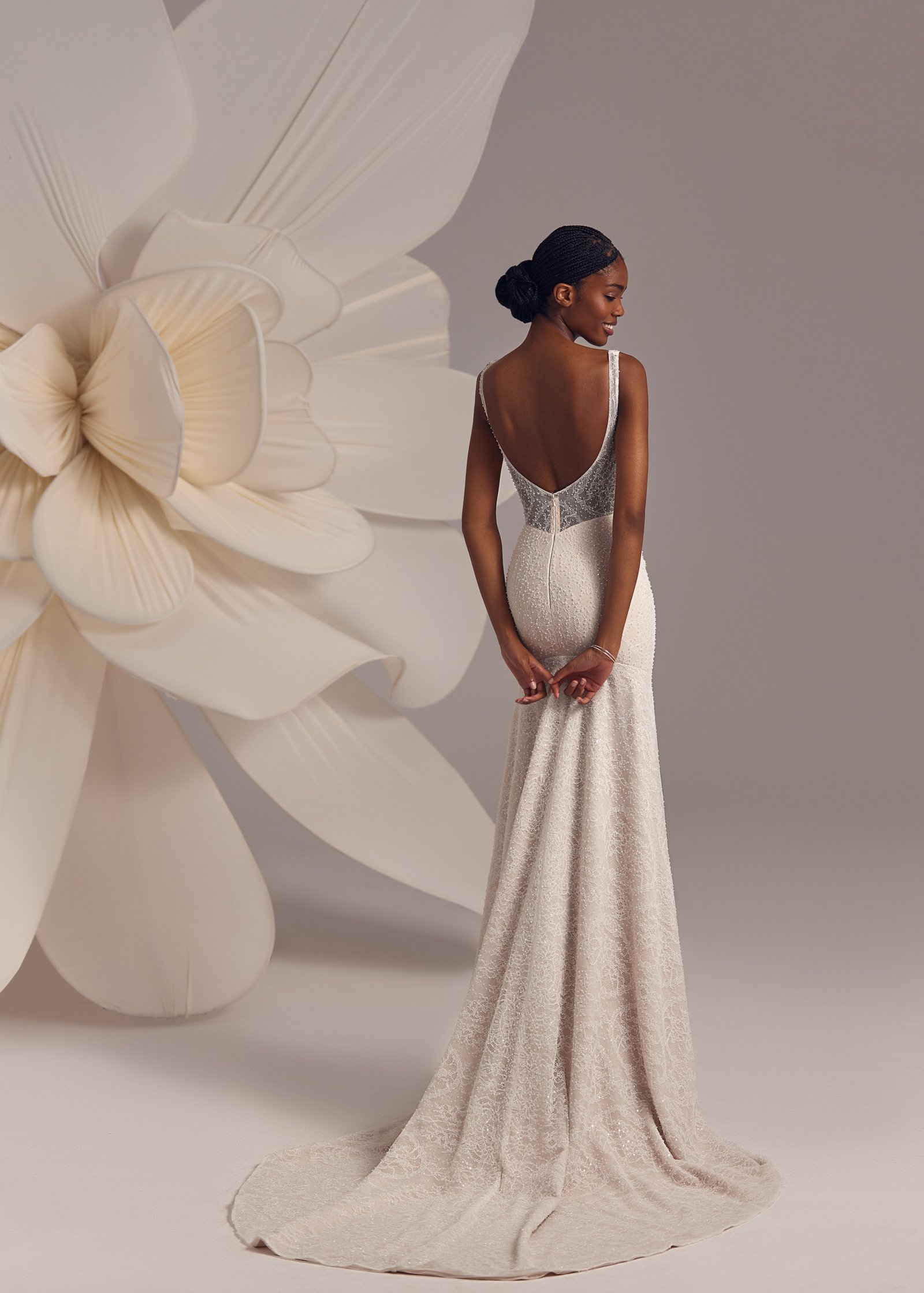 Elsie – strapped smooth pointed neckline dress with deeply cutout round back and floral embroidered veil.