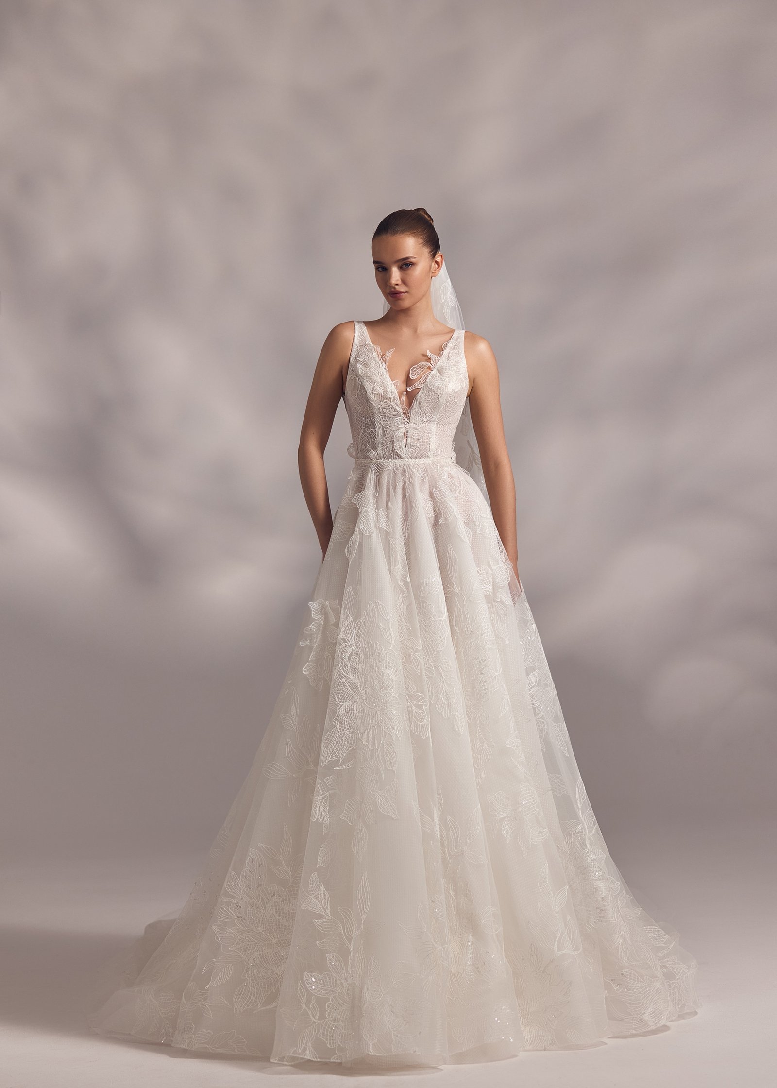 Mellrose – plunging neckline gown with natural waistline, open round back and floral voluminous applications all over the dress. Complemented with simple veil.