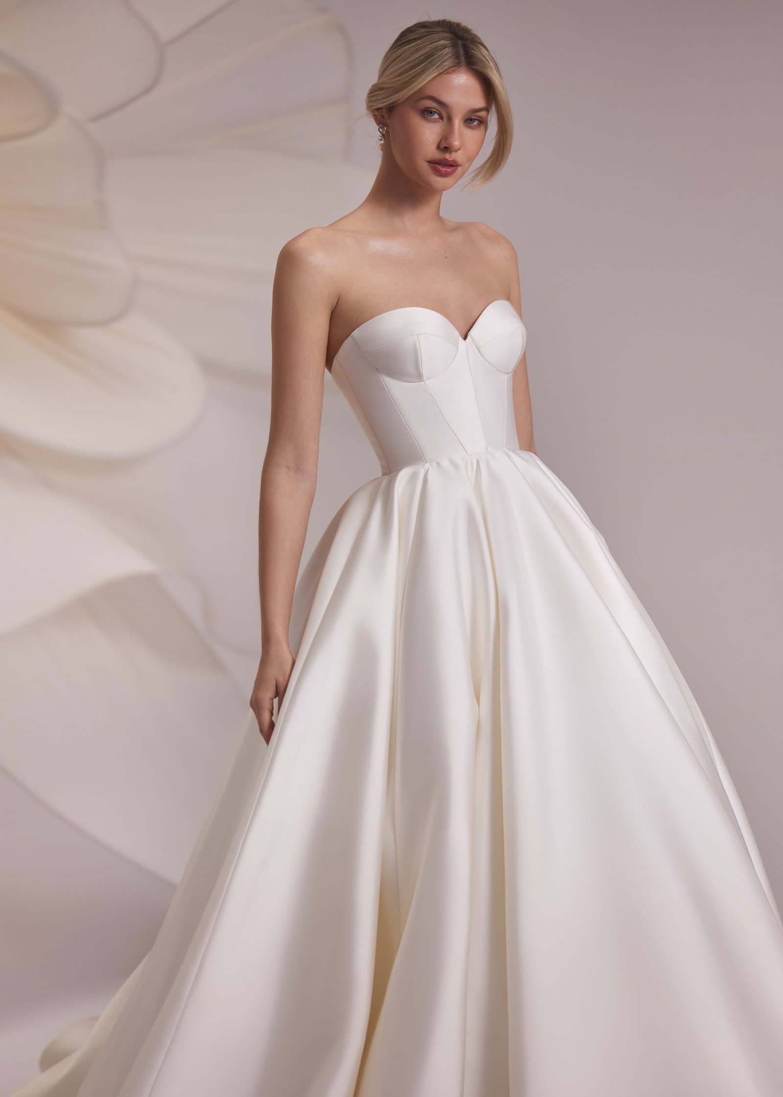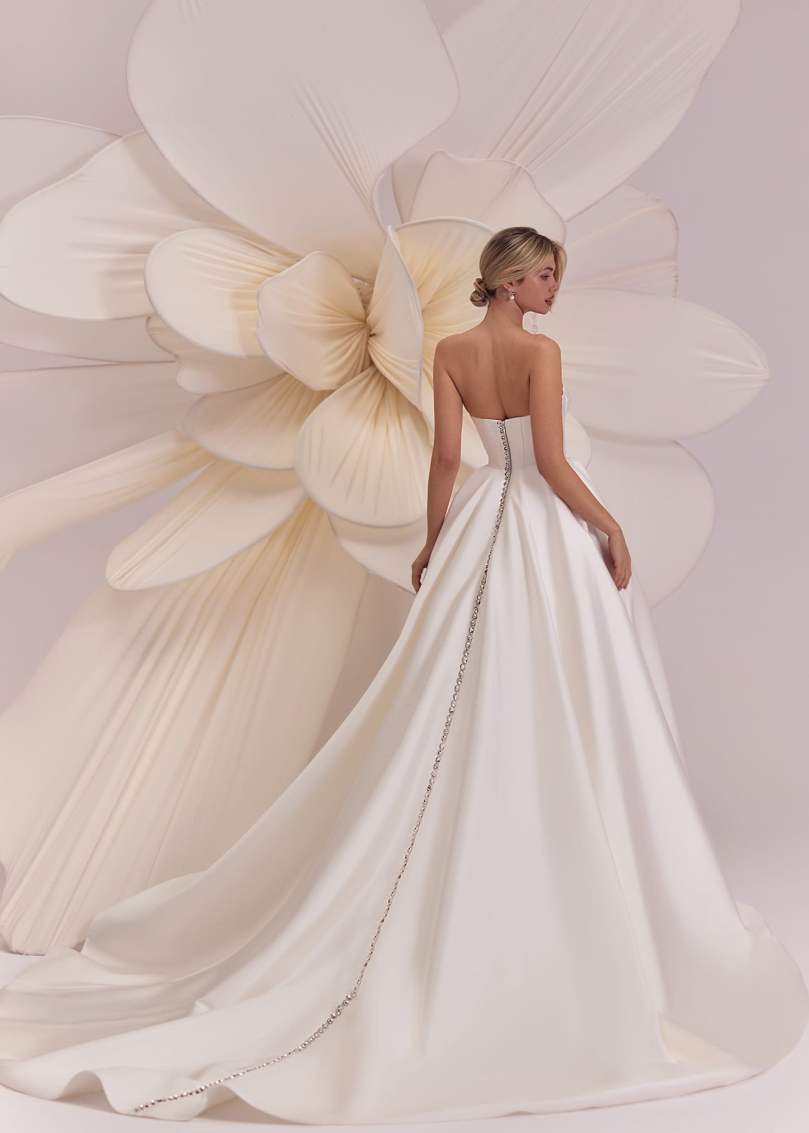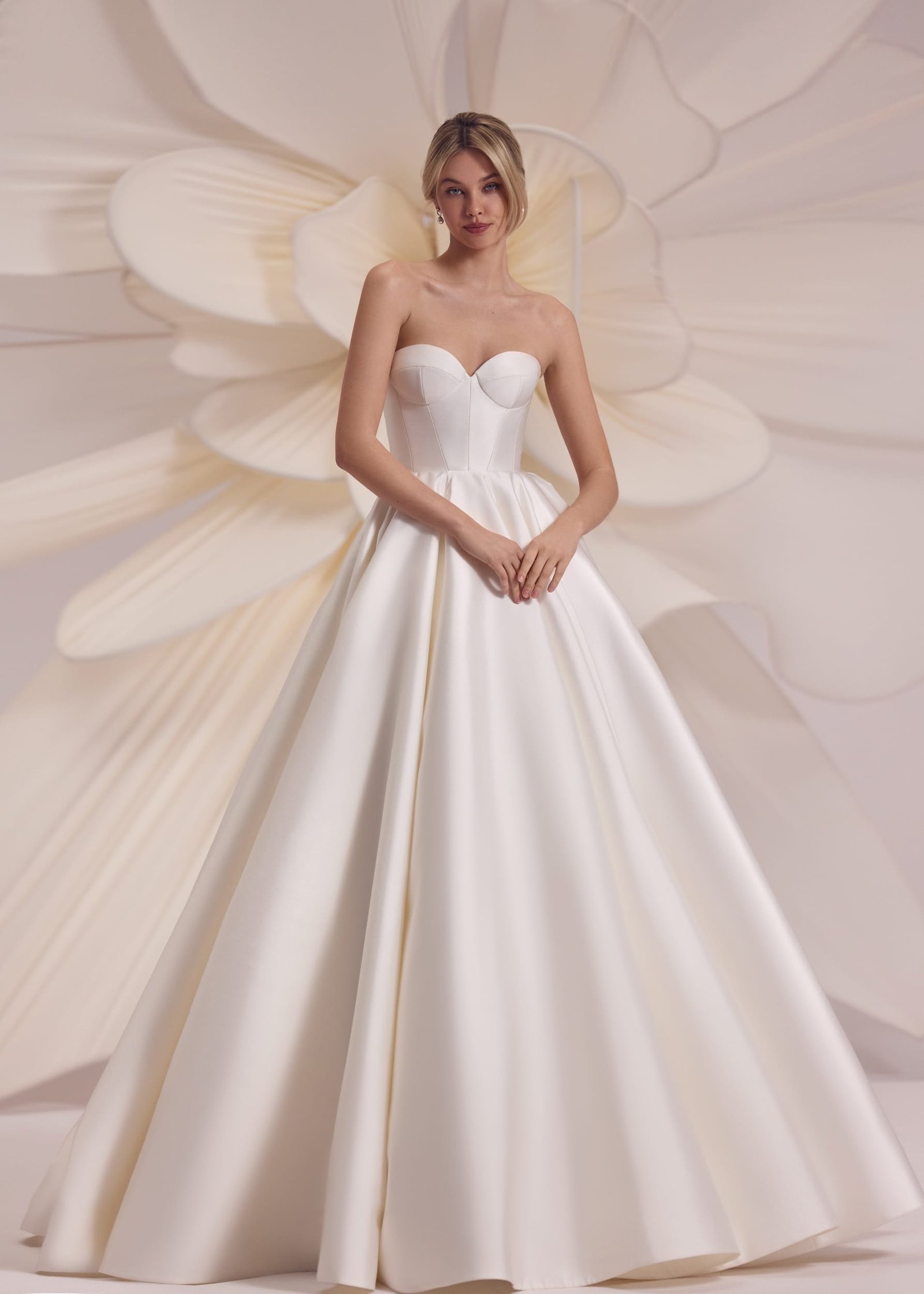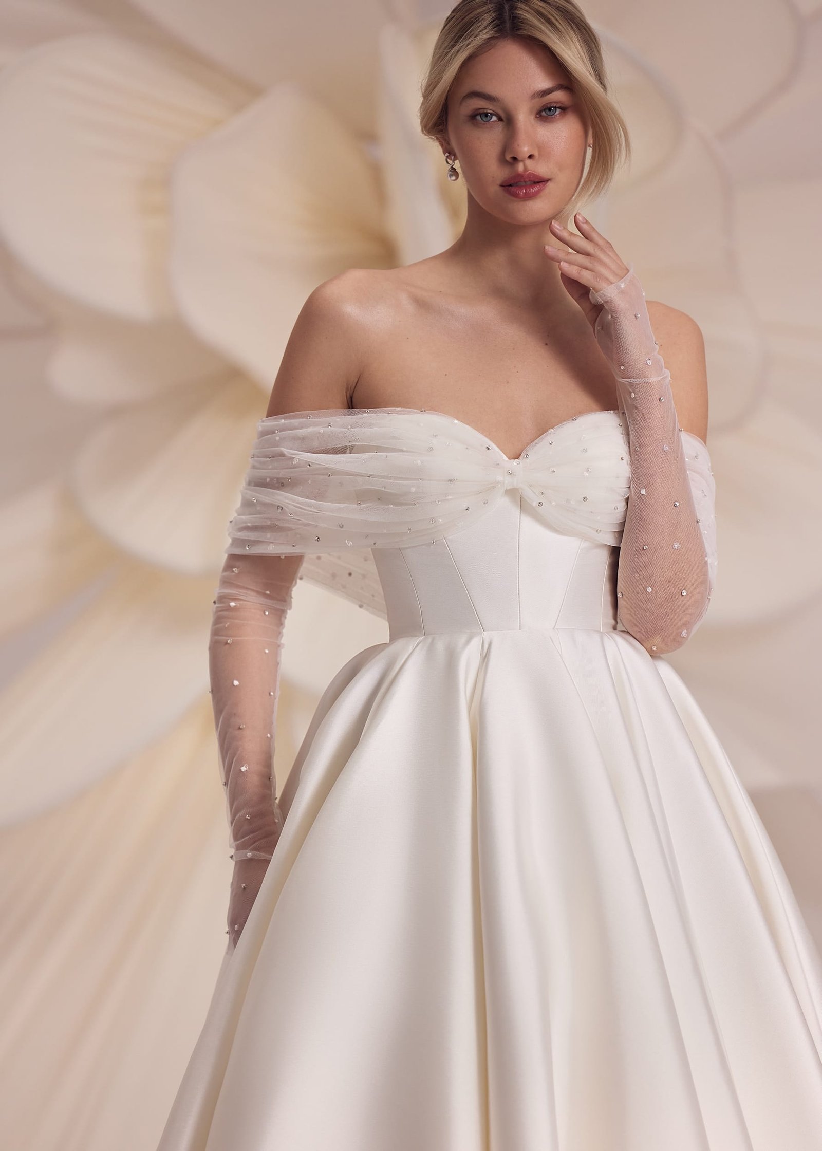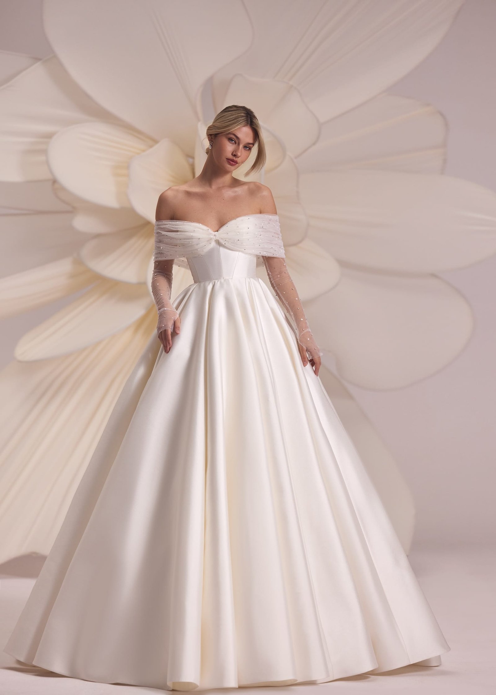 Merida – strapless heart-shaped neckline dress with smooth voluminous skirt, decorated with a full length sparkling crystal line on the back. Complemented with detachable cold-shoulder mesh beaded bolero.