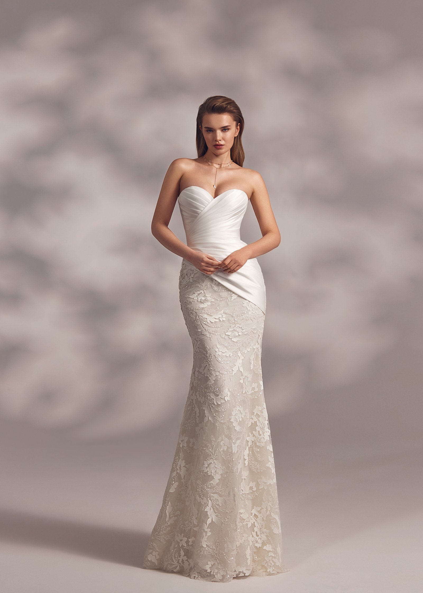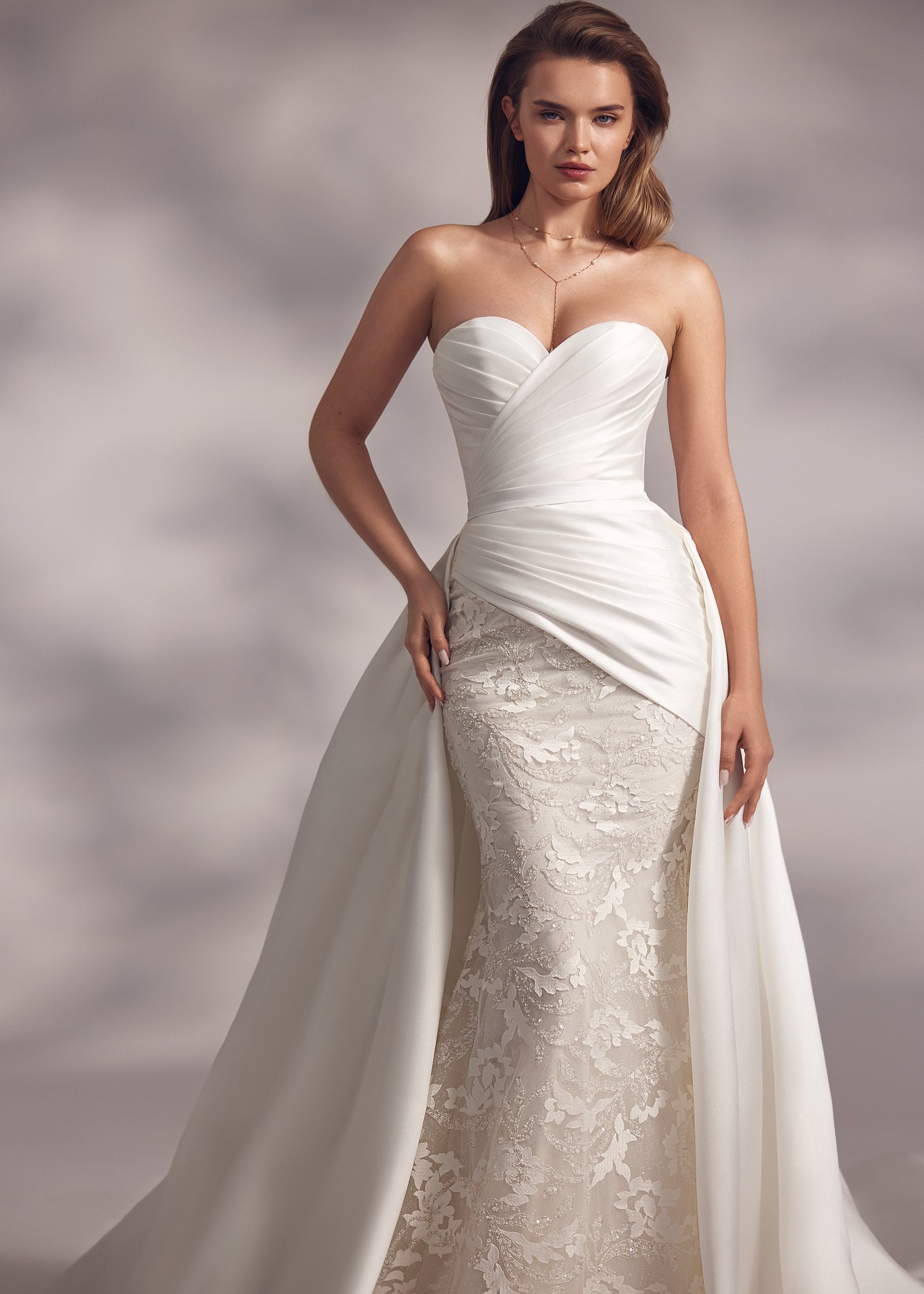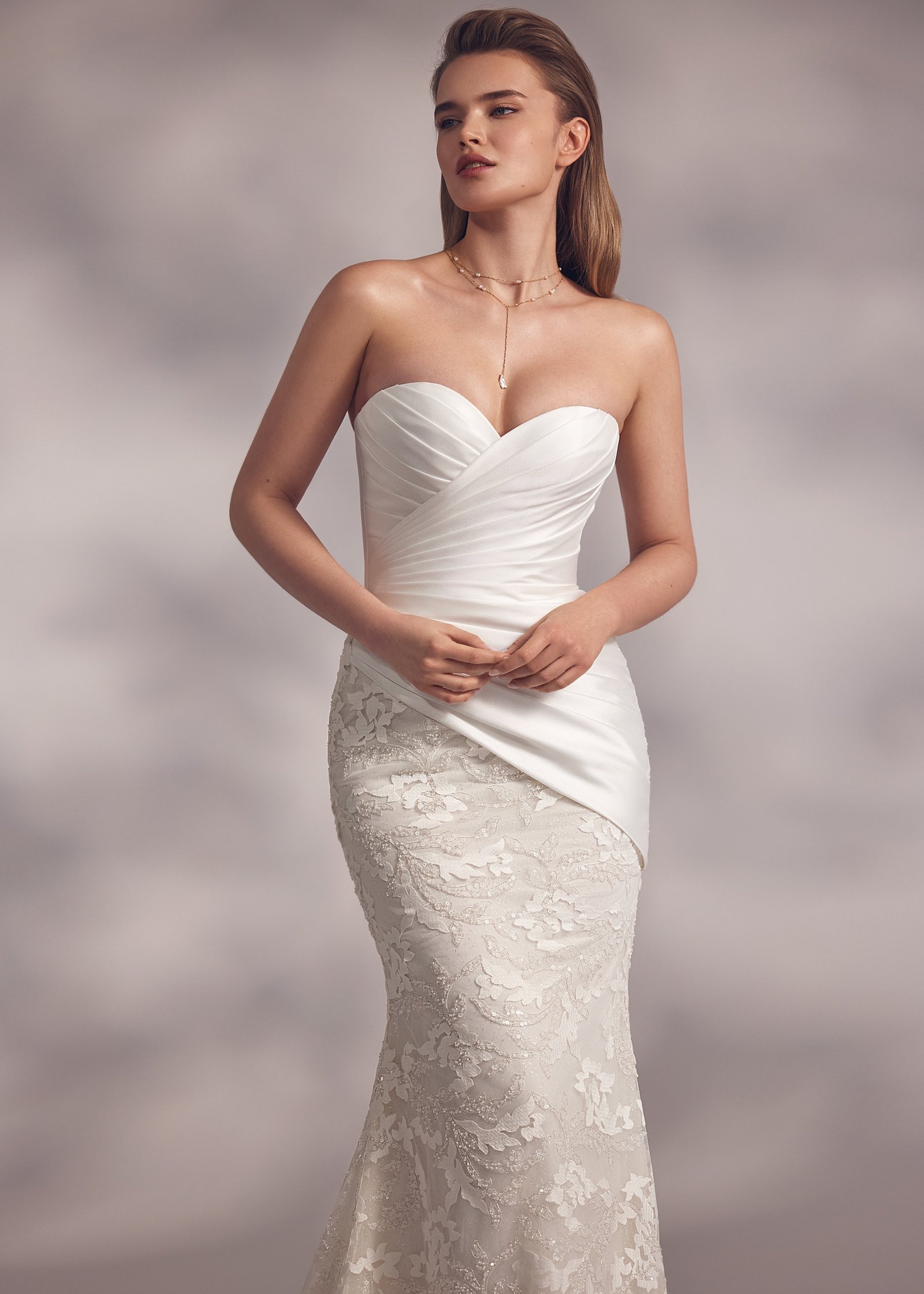Sephora – heart-shaped neckline strapless dress with asymmetric wrap top and lace straight skirt, complemented with a smooth voluminous overskirt.