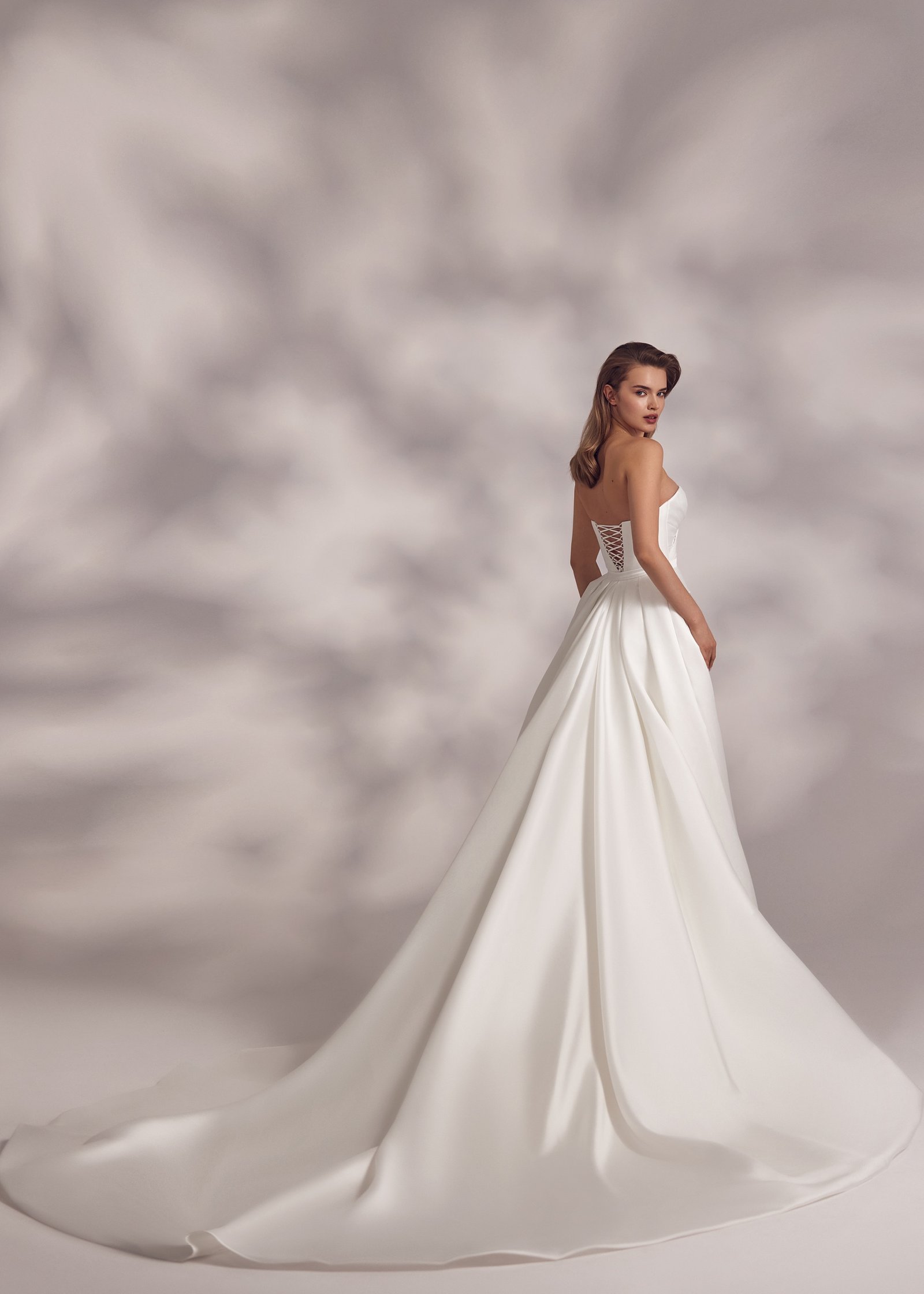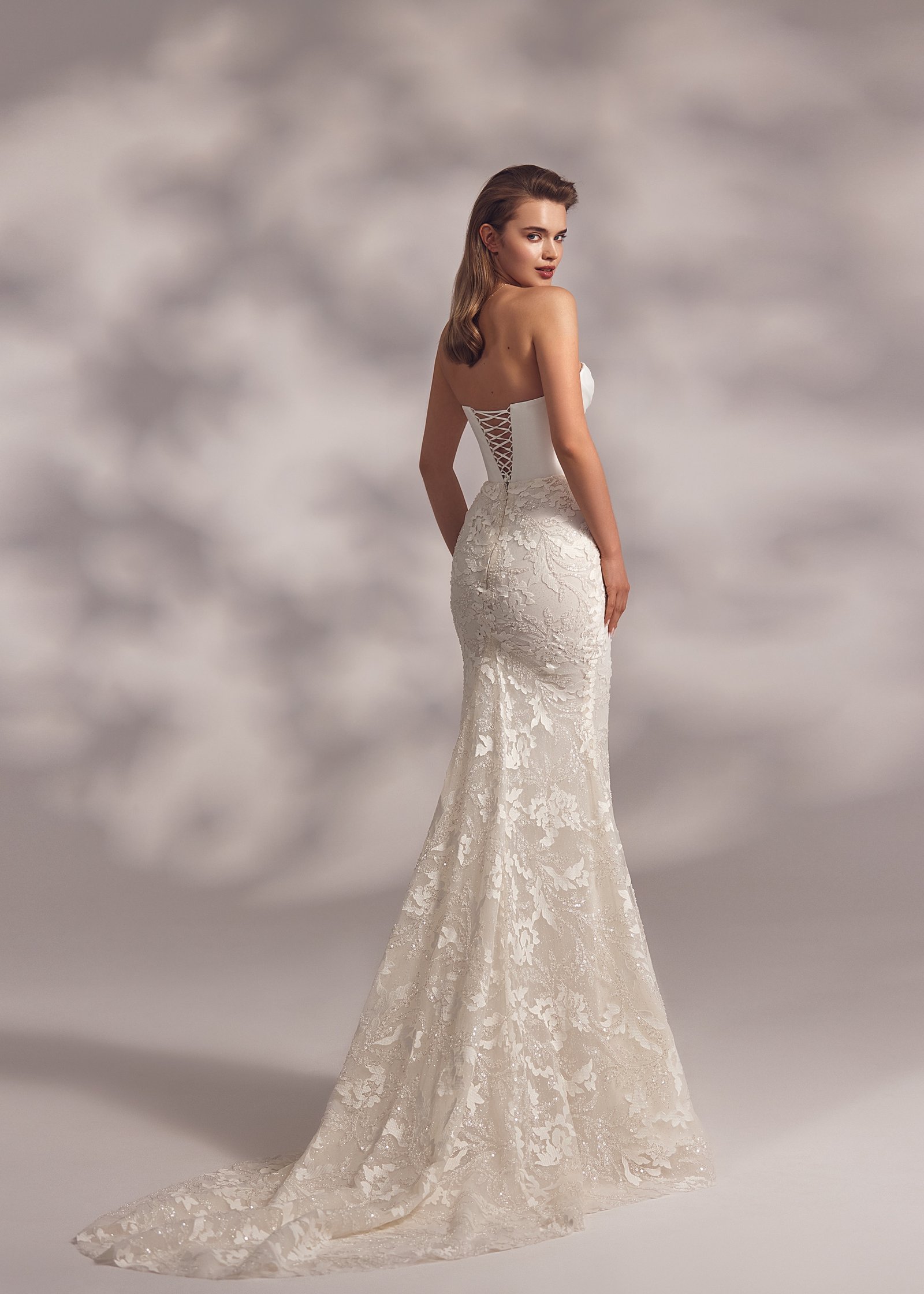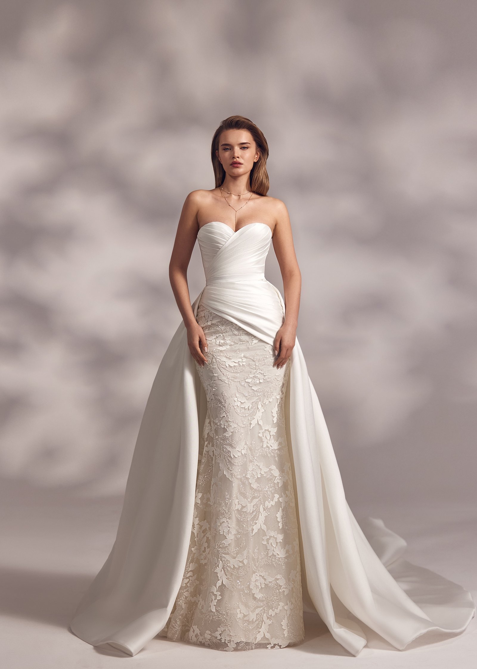Sephora – heart-shaped neckline strapless dress with asymmetric wrap top and lace straight skirt, complemented with a smooth voluminous overskirt.