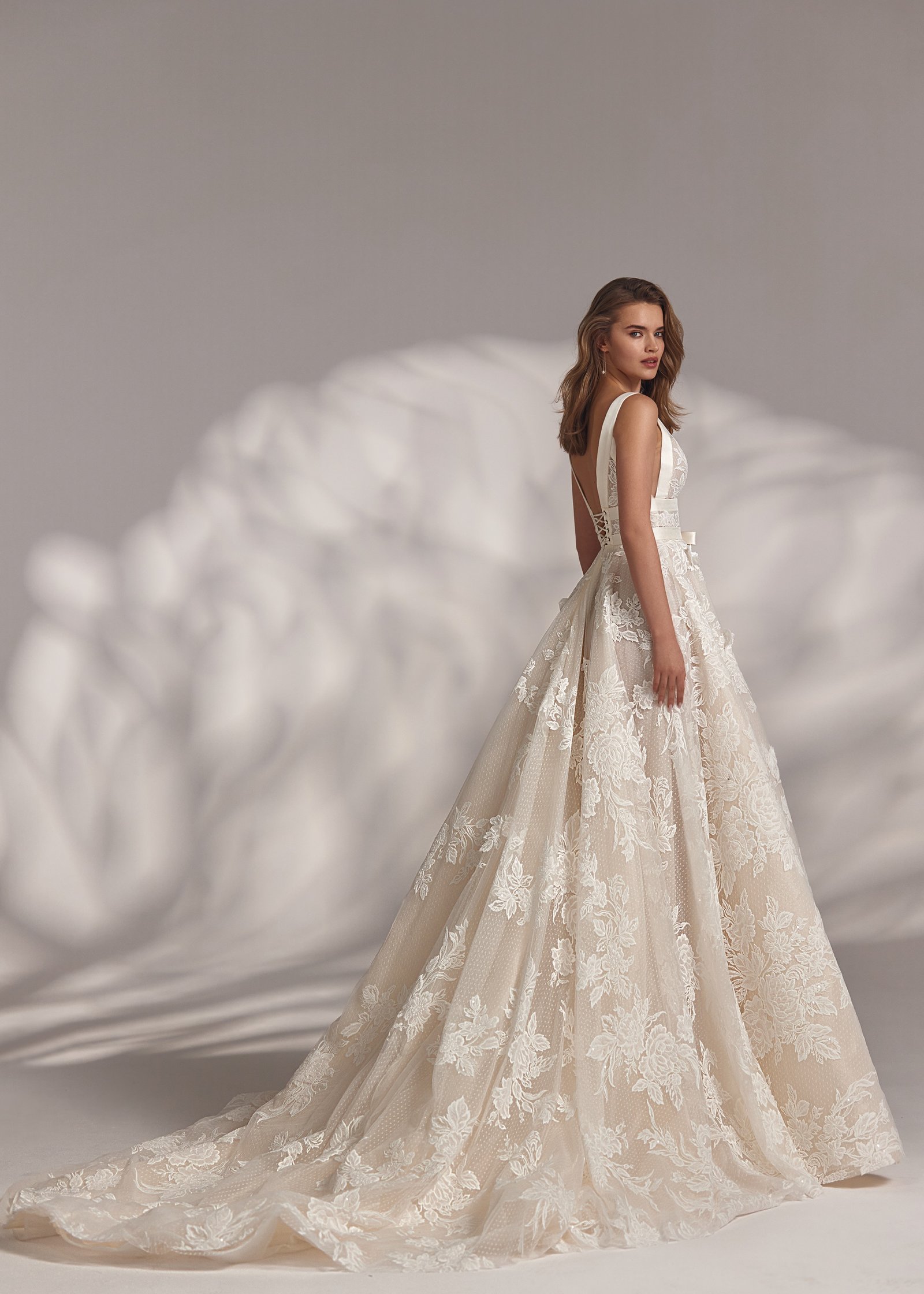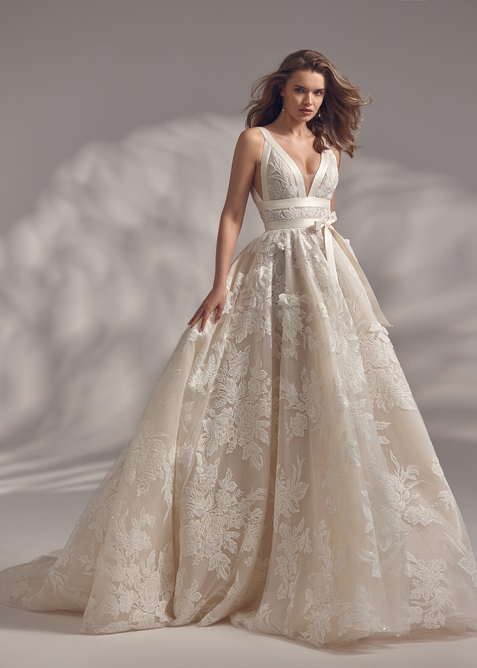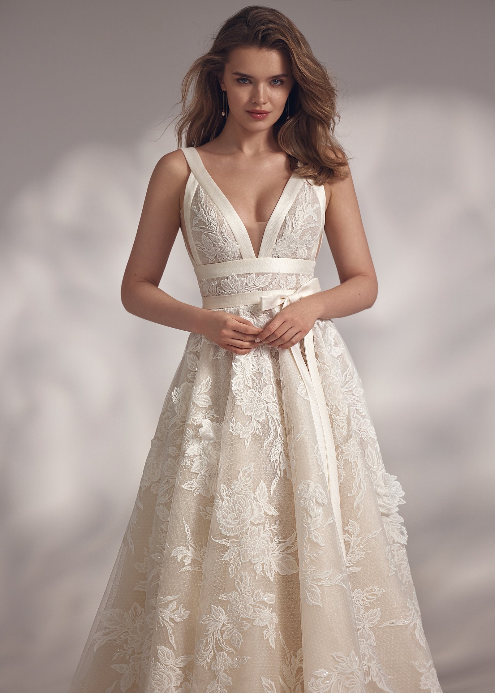 Tilly – V-neck fitted waist dress with open back and rich floral embroidery all over the top and the gown, the waistline is highlighted with ribbon bow.