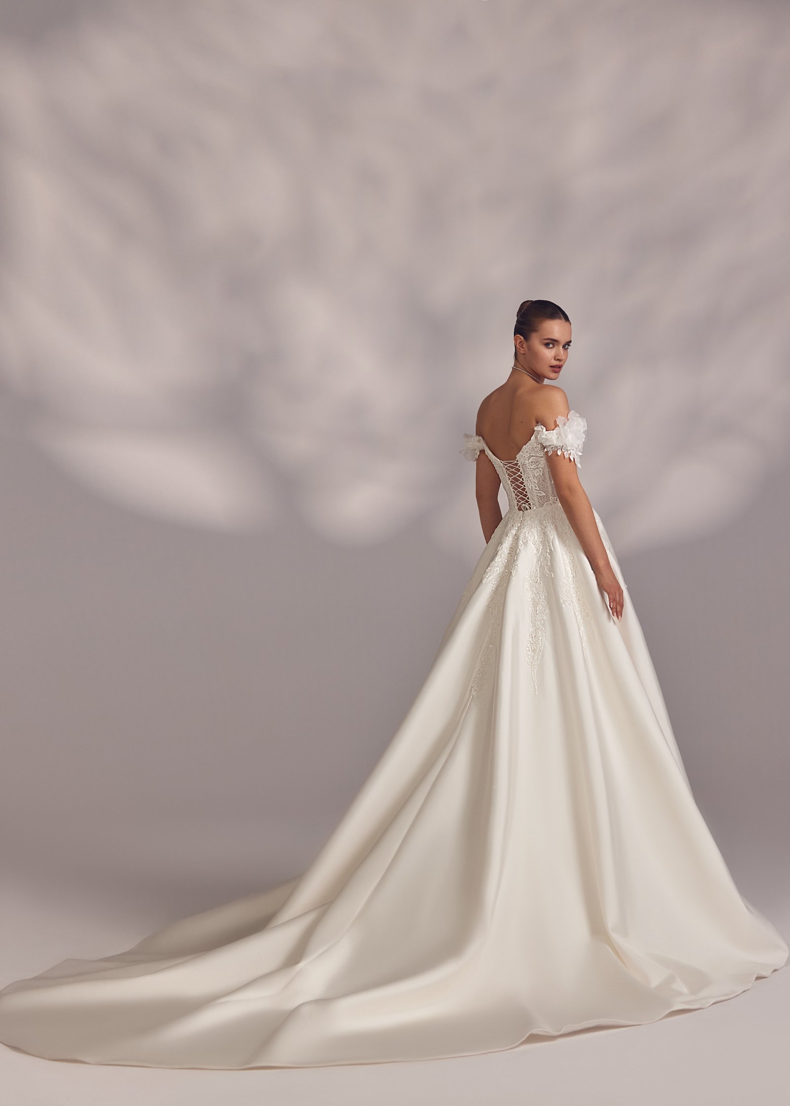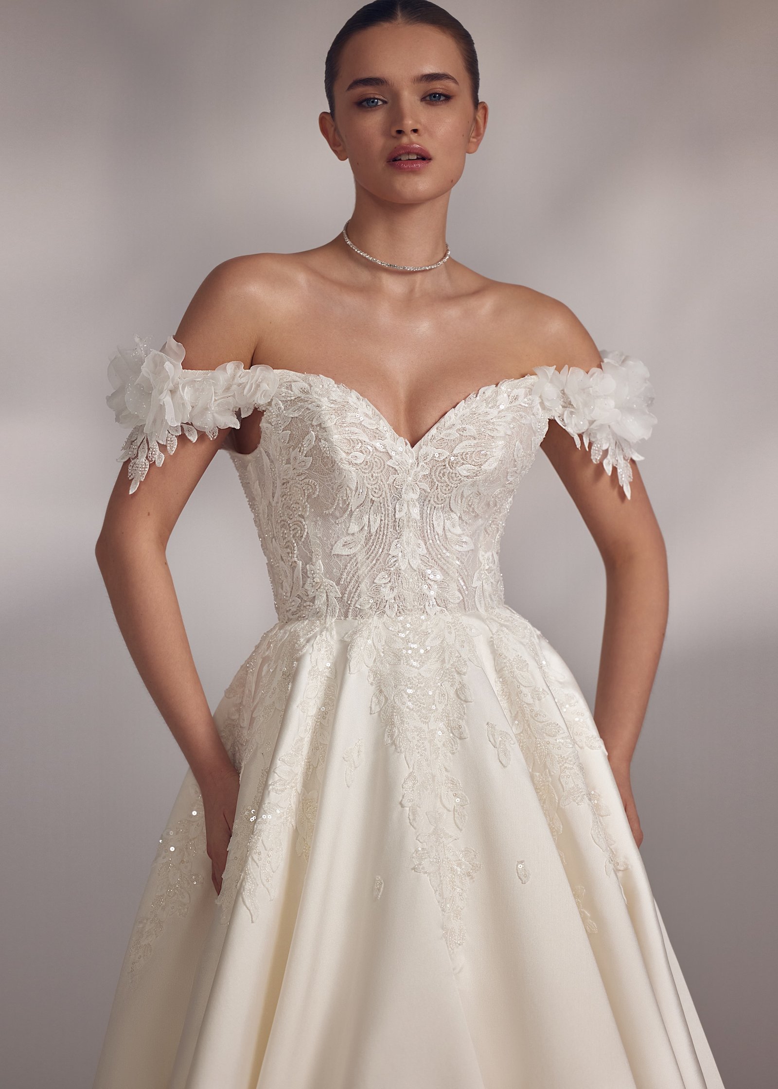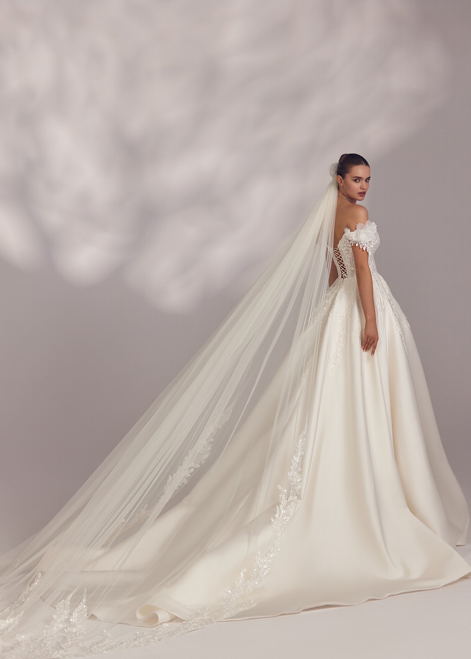 Vivianna – heart-shaped cold-shoulder embroidered dress with floral voluminous wing-sleeves and smooth elongated skirt and lace-up back. Complemented with a simple veil.