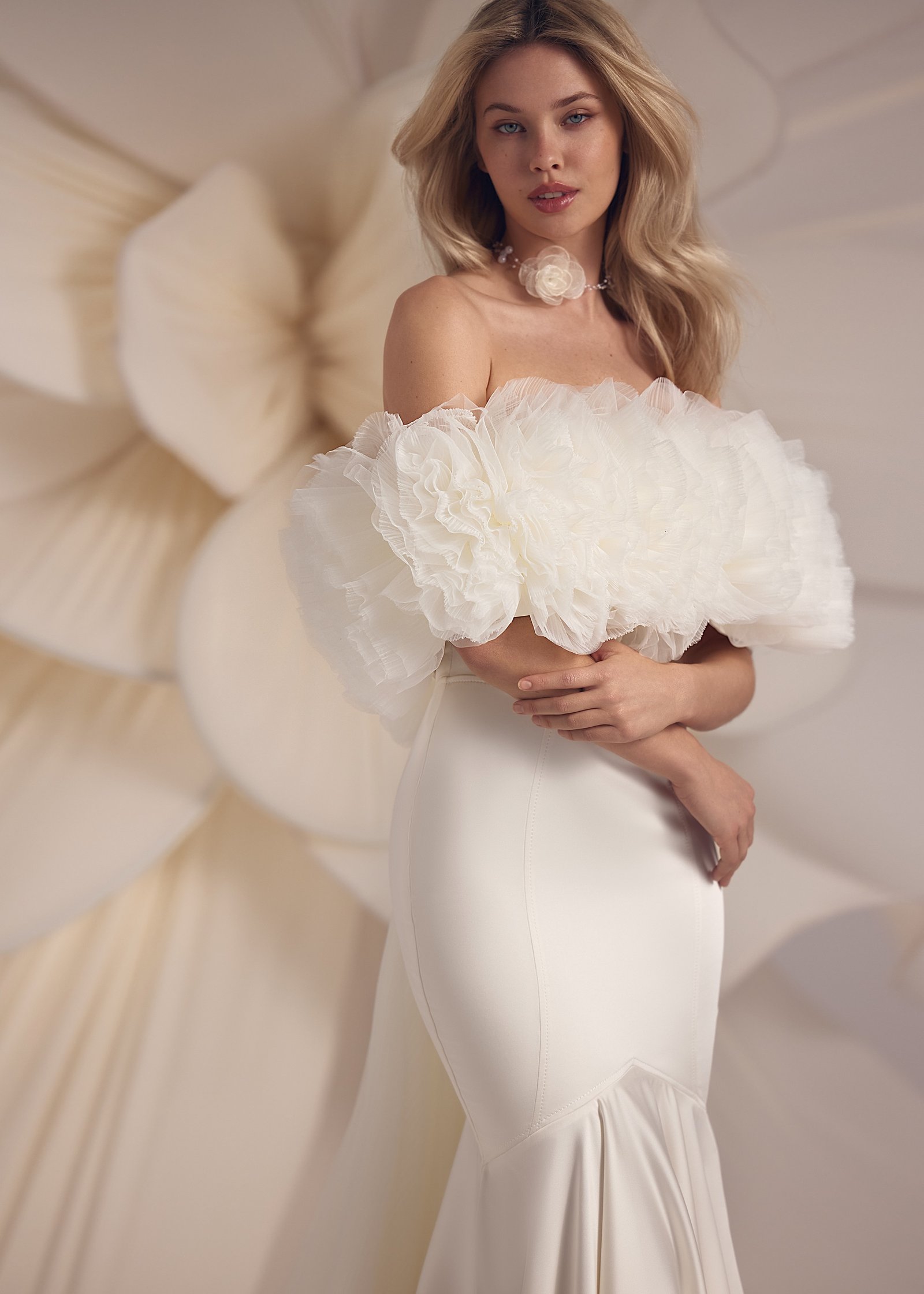 Zara – mermaid tail silhouette with strapless detailed corset and pleated bottom part of the skirt. Complemented with a voluminous tuille ruched bolero with a simple veil extension.
