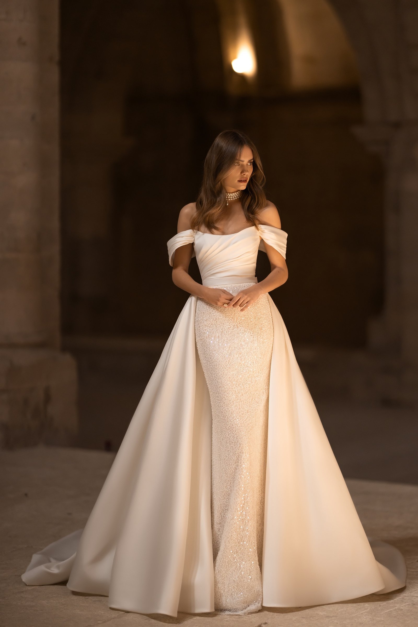 Embrace sophistication and allure with this captivating mermaid wedding dress. The draped mikado fabric corset beautifully accentuates your figure, while the off-shoulder design and sweetheart neckline exude timeless elegance. The skirt, crafted with dazzling sequined fabric, adds a touch of glamour and sparkle to your every step. For added versatility, a detachable mikado fabric overskirt with a long train is included, allowing you to transform your look effortlessly. Prepare to make a grand entrance and leave a lasting impression on your special day.