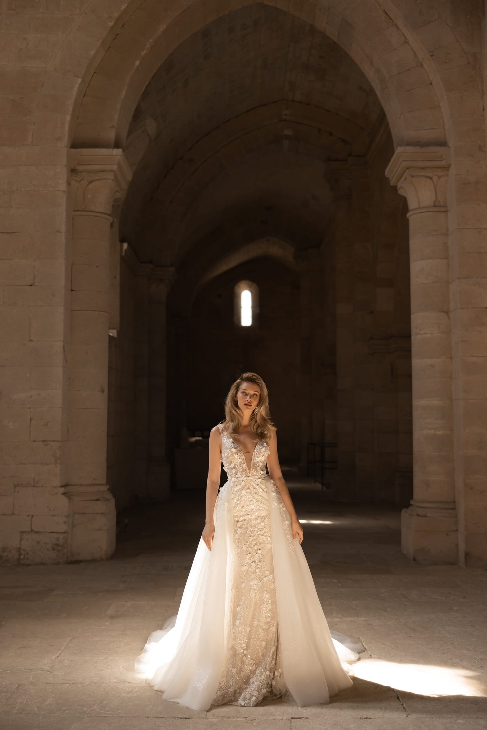 Embrace the epitome of glamour and sophistication with our captivating shiny lace mermaid wedding dress. Every detail of this exquisite gown has been thoughtfully designed to create an enchanting bridal look that will leave you breathless. The mesmerizing 3D flowers and delicate beads adorn the shimmering lace, adding a touch of ethereal romance to the overall design. The deep V-neckline accentuates your natural beauty, while adding a touch of alluring elegance. For an added touch of versatility, this gown comes with a detachable shimmer overskirt, adorned with intricate 3D lace, creating a magnificent visual impact as you walk down the aisle. The detachable overskirt gracefully flows into a long train, leaving a trail of enchantment in your wake. With its impeccable craftsmanship and attention to detail, this wedding dress is a true work of art that will make you feel like a radiant goddess on your special day. Let your inner beauty shine and captivate all hearts with our extraordinary shiny lace mermaid wedding dress.