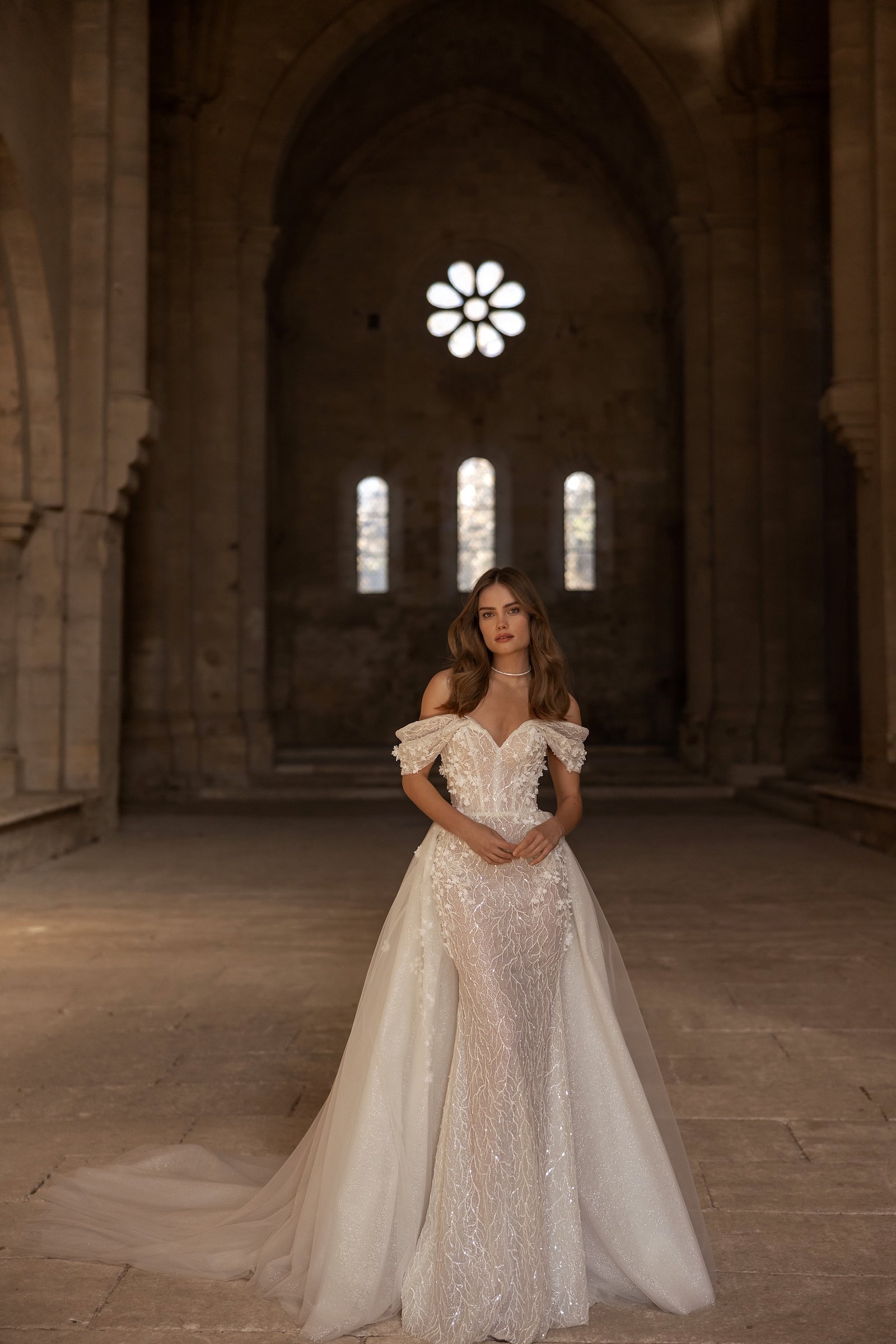 Embrace the ethereal beauty of our mesmerizing mermaid wedding dress. Crafted with meticulous artistry, this gown showcases the perfect blend of romance and glamour. The exquisite lace with shimmer captures the light, creating a dazzling effect that will leave everyone in awe. Delicate 3D flowers and sequins adorn the dress, adding a touch of enchantment and sparkle. The sweetheart neckline accentuates your natural beauty, while the off-shoulder sleeves exude a sense of feminine allure. For added versatility, we offer a detachable shimmer overskirt adorned with 3D lace, allowing you to customize your look with ease. As you walk down the aisle, the dress gracefully embraces your silhouette, hugging your curves in all the right places. The long train cascades behind you, creating a breathtaking and dramatic effect. This mermaid wedding dress is a celebration of your unique love story, ensuring that your special day will be filled with magic, elegance, and unforgettable moments. Radiate confidence and capture hearts in our extraordinary mermaid wedding dress with shimmer and 3D lace embellishments.