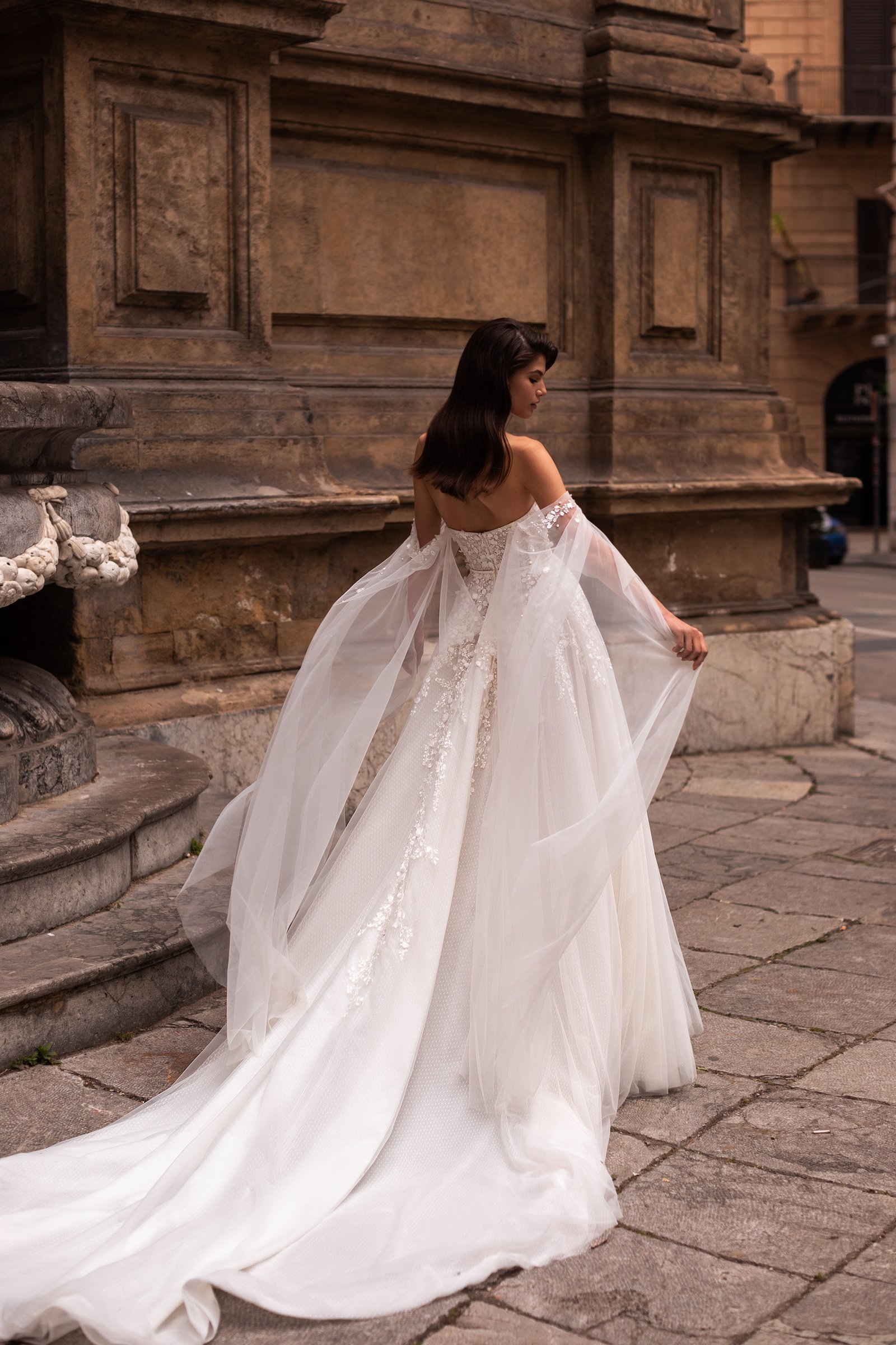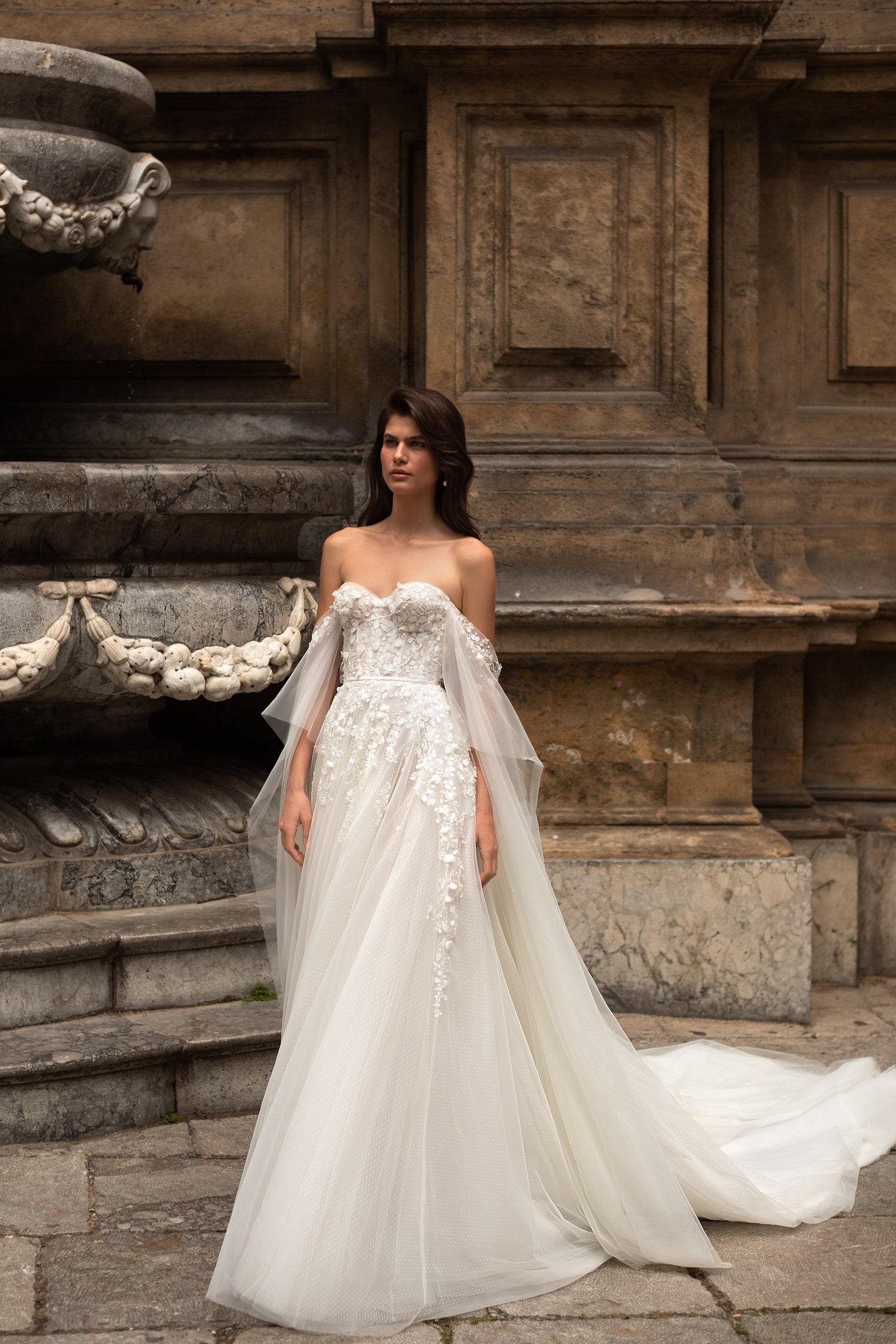 Aidana is a tender wedding gown of A-line silhouette that features delicate hand-embroidered lace. The strapless corset with heart-shaped neckline is embellished with 3D floral lace and small beads. Romantic lowered sleeves combine weightless Tulle with mini floral embroideries. The loose veiling skirt has a long train.
