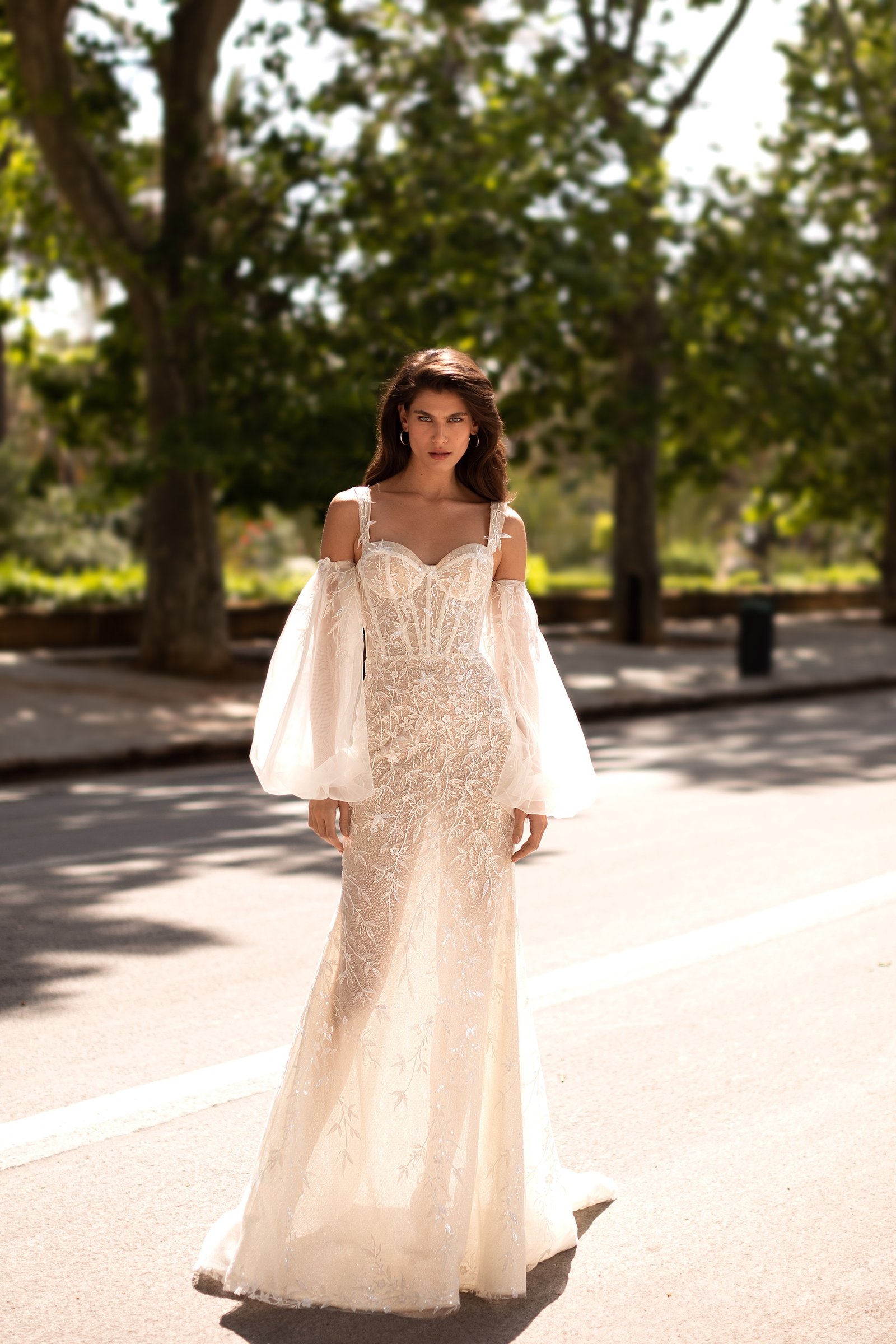 Bellamy is a sparkling wedding dress with fantastic detachable Tulle baloon sleeves. The corset is decorated with a sweetheard neckline, classic cups and bones and scattered hand-embroidered floral appliques that also rest on the shoulder straps. The fitted sheath skirt of mermaid silhouette is made of shiny fabric with mini floral embroideries and delicate chapel train.