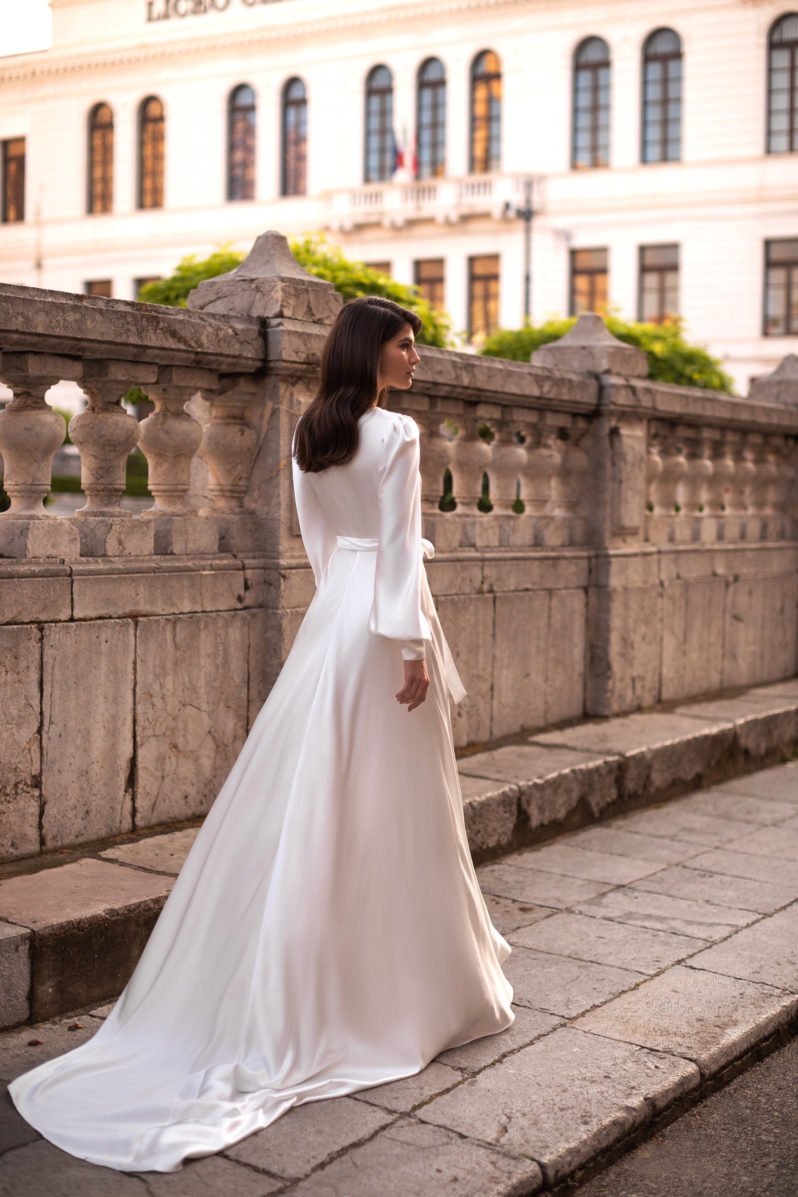 Soft silky fabric creates a smooth silhouette of this elegant A-line wrap wedding dress. Sophisticated V-shaped neckline and sheer long lantern sleeves make the dress glamorous and sexy with a sophisticated twist. A clean, creamy silk A-line skirt with a thigh-high slit is completed with a sweeping chapel train.