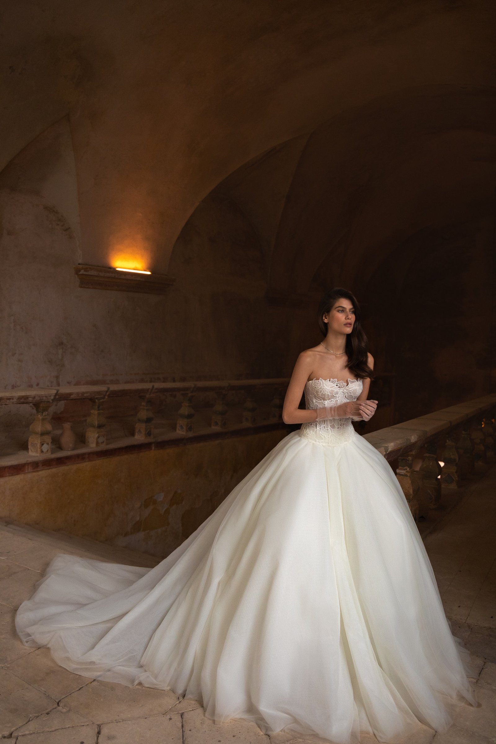 A sheer strapless lace corset decorated with oversized symmetrical flowers gives this natural-waist Tulle ballgown some structure while a feminine Tulle full skirt with a soft cathedral-length train brings Tasca to life in a whimsical way. Since the elements are separate they can be paired with Stormy corset or pants.