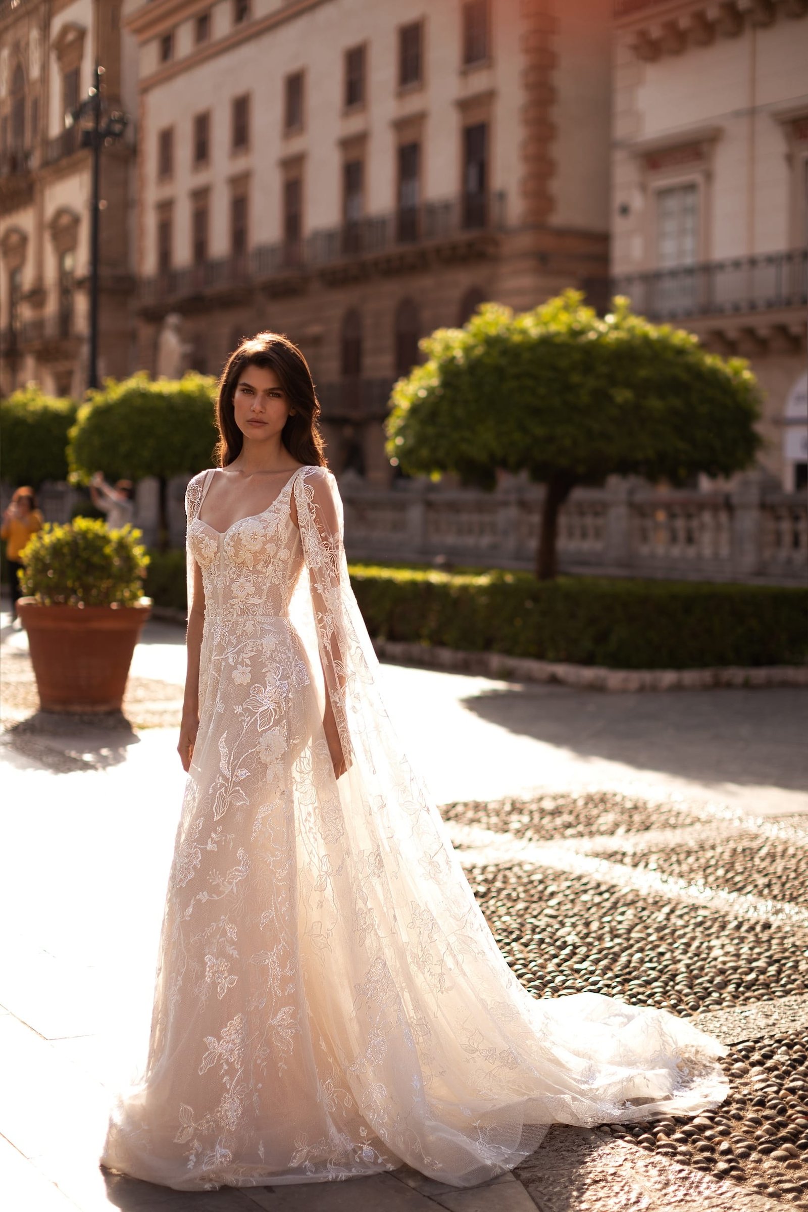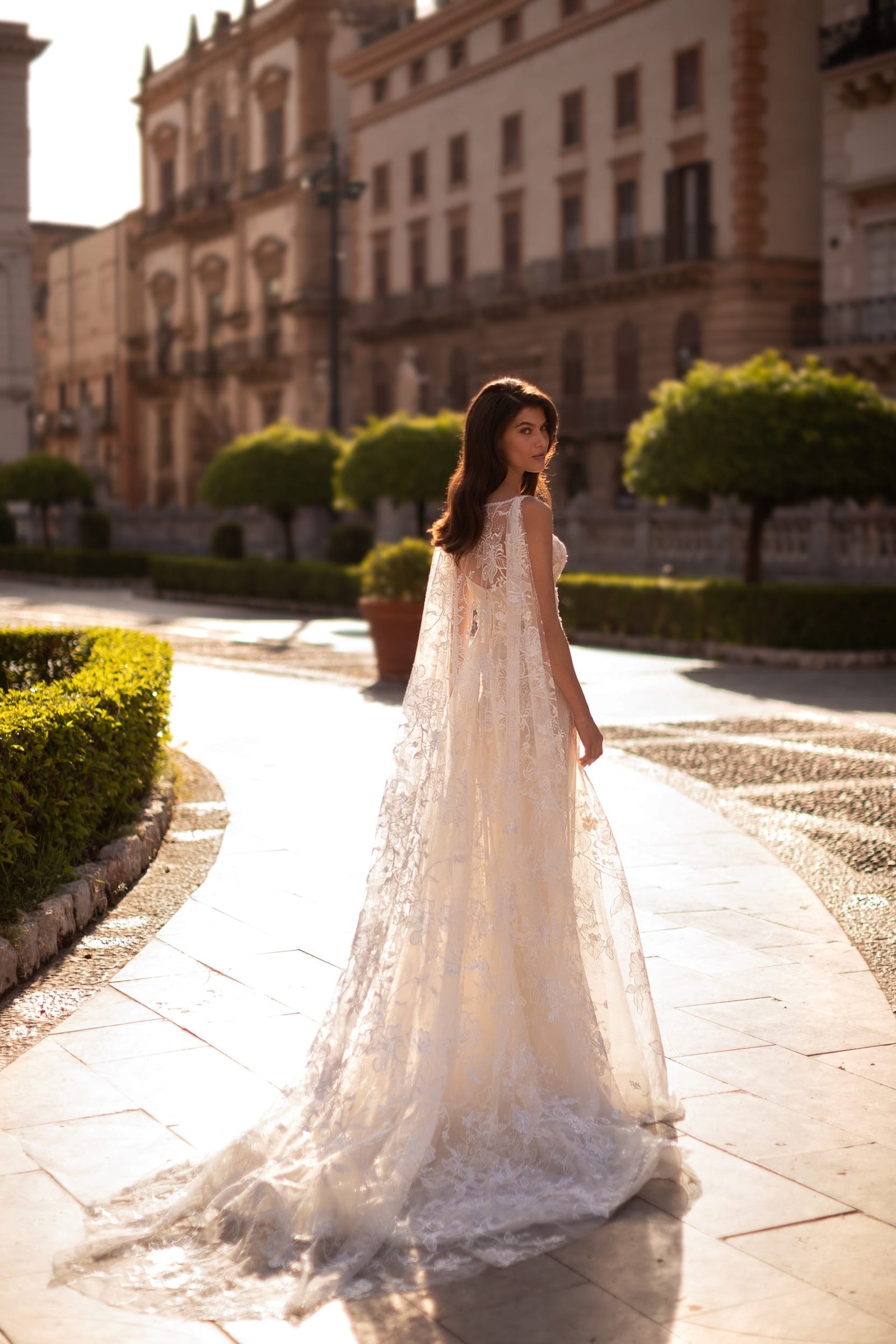 Enchanting, stately, and sexy, this soft A-line corset dress is adorned in embroidery and sparkly silver sequins. A corset features a delicate sweetheart neckline with straps and a voluminous translucent A-line skirt with flower appliques embellished in delicate all-over silver beading. A special sophisticated twist hides in a magnificent semi-ilusion cape attached on the shoulders creating a fantastic long train.