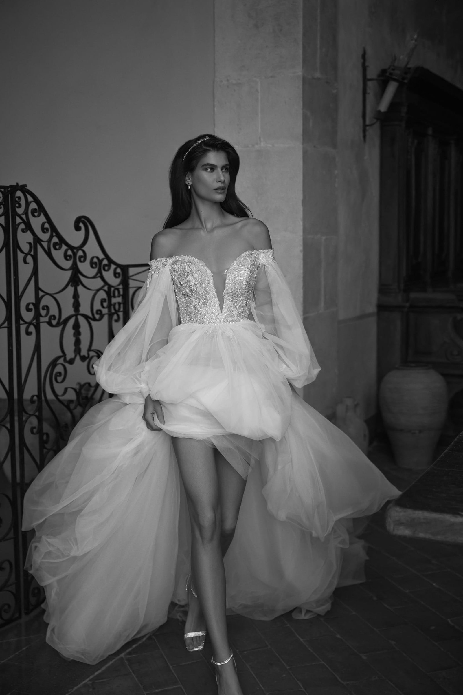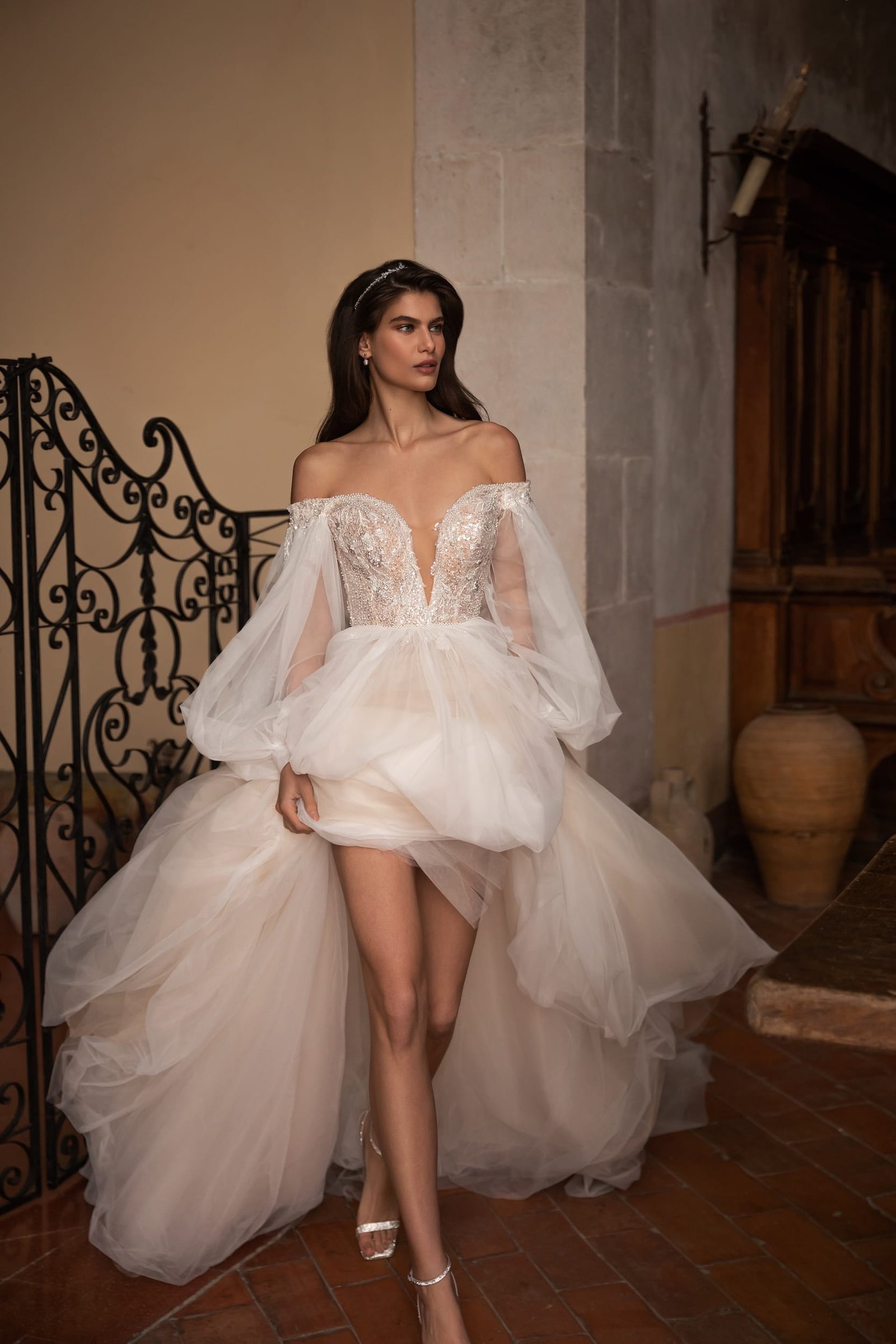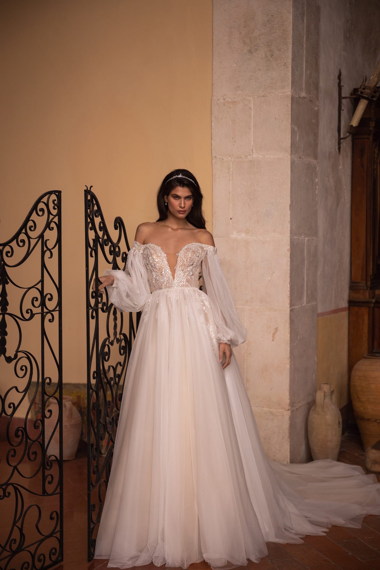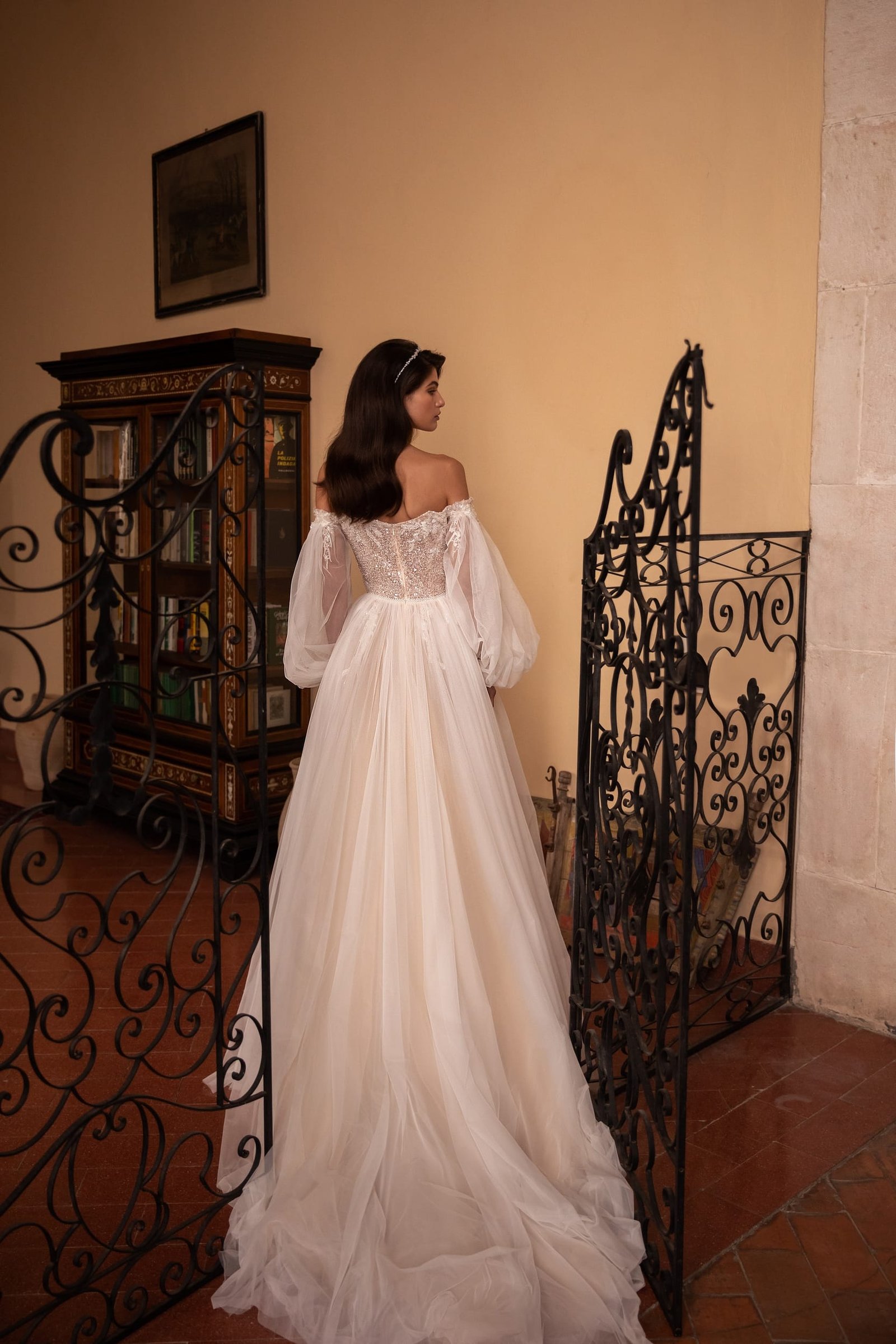 Valetta ball gown is a shining dress for a royal wedding. The bodice with lowered shoulders is made of sparkling lace with a floral pattern and embellished with deep V-neckline and translucent loose sleeves. The uncovered back of the dress with lowered shoulders looks fabulous. The skirt is made of many layers of veiling and decorated with spangles. There is a fantastic long train.