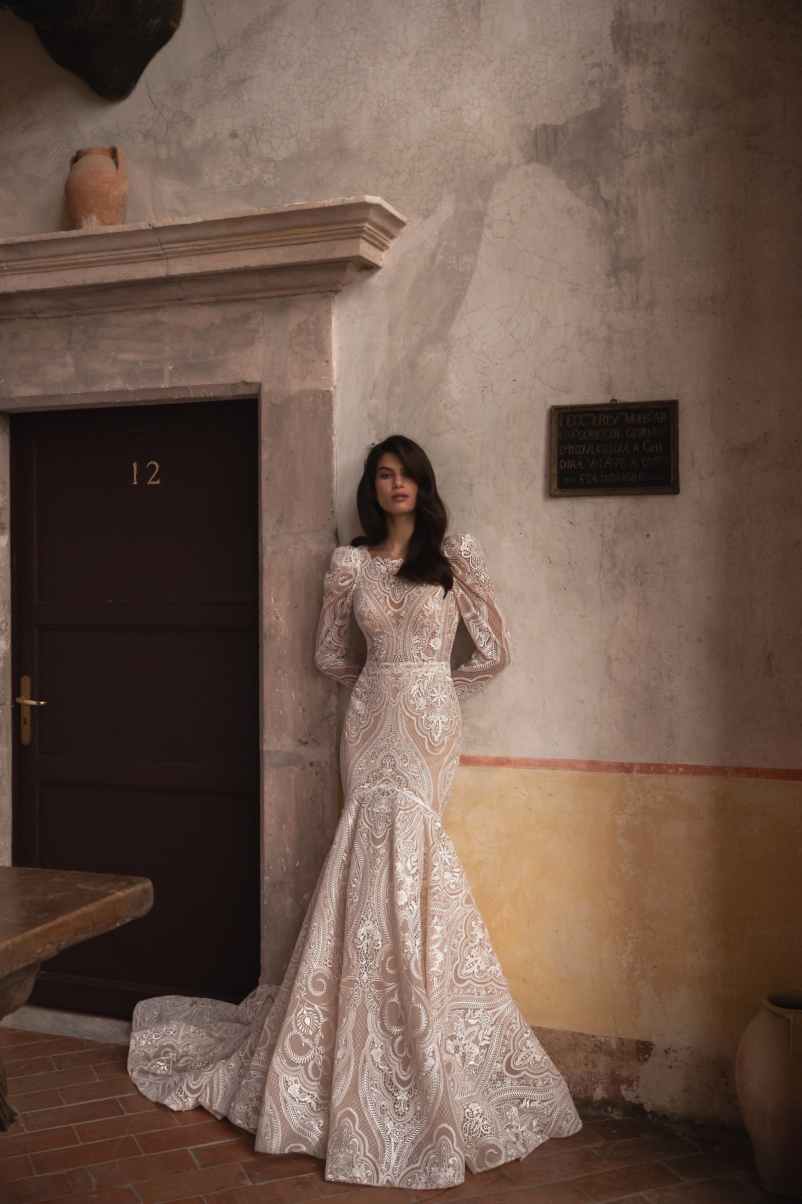 Viva is a perfect choice for elegant and modest brides. The laconic mermaid silhouette accentuates the figure with long sleeves with take-ups and Closed Boat neckline adding solemnity. The whole dress is made of textured patterned lace. The special detail is hidden in the extra-low bodice that bares the bride's back. The skirt has a small delicate chapel train.