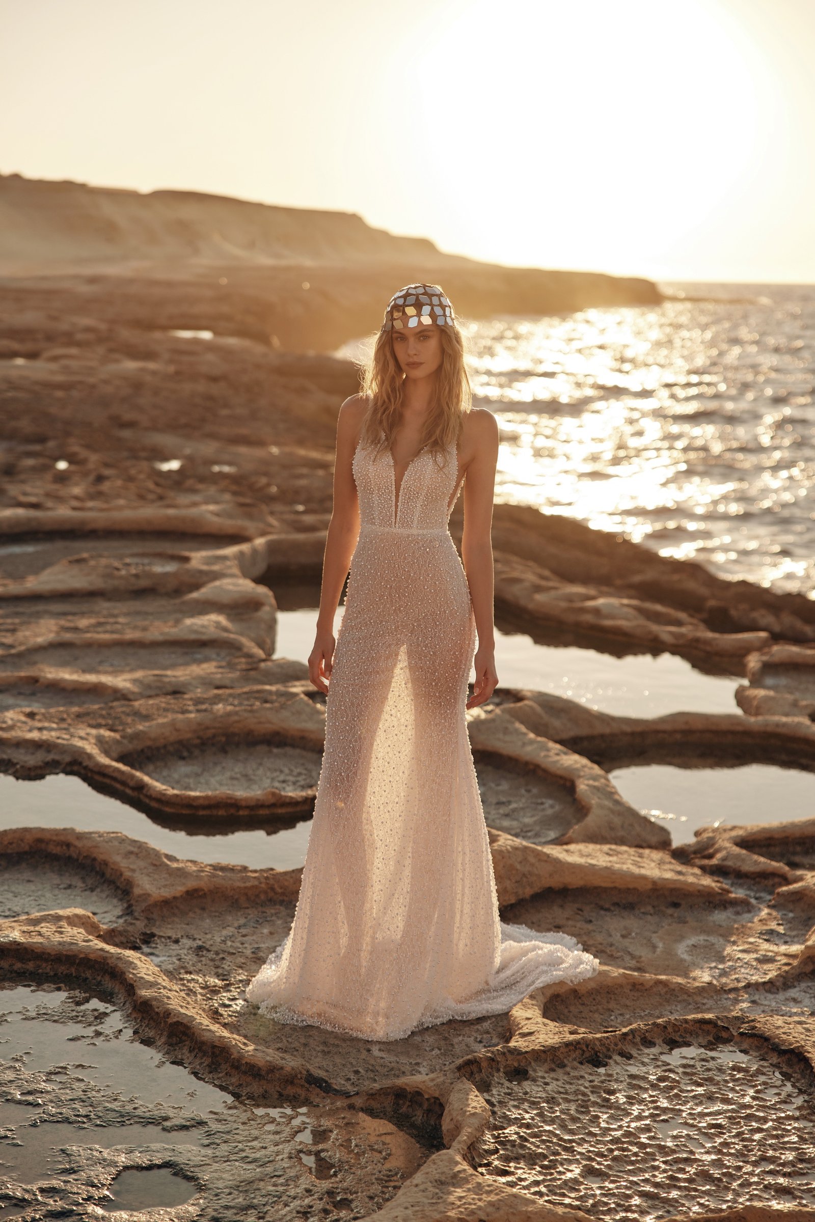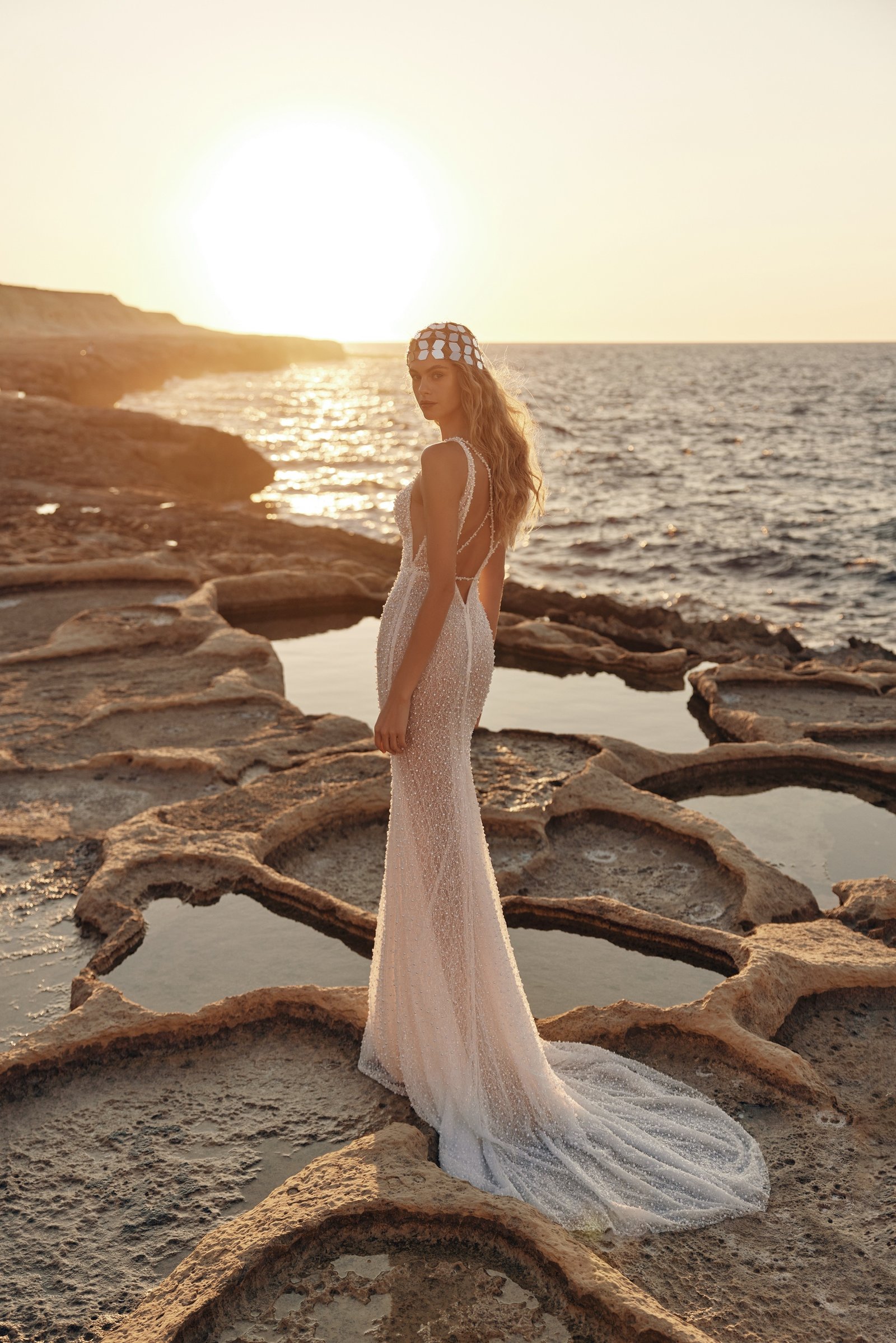 Island Dress - a mermaid-style gown, graceful and statuesque in its silhouette. The dress is fully adorned with shimmering lace and scattered pearls that catch the light with every movement, adding a sparkle. The illusion nude mesh at the neckline creates a seamless finish, while the open back becomes the centerpiece of the design. Delicate crisscross ties at the back enhance its elegance and sensuality. The gown is lined with multiple layers of tulle to ensure opacity and comfort, while a modest train completes the look with sophistication.
