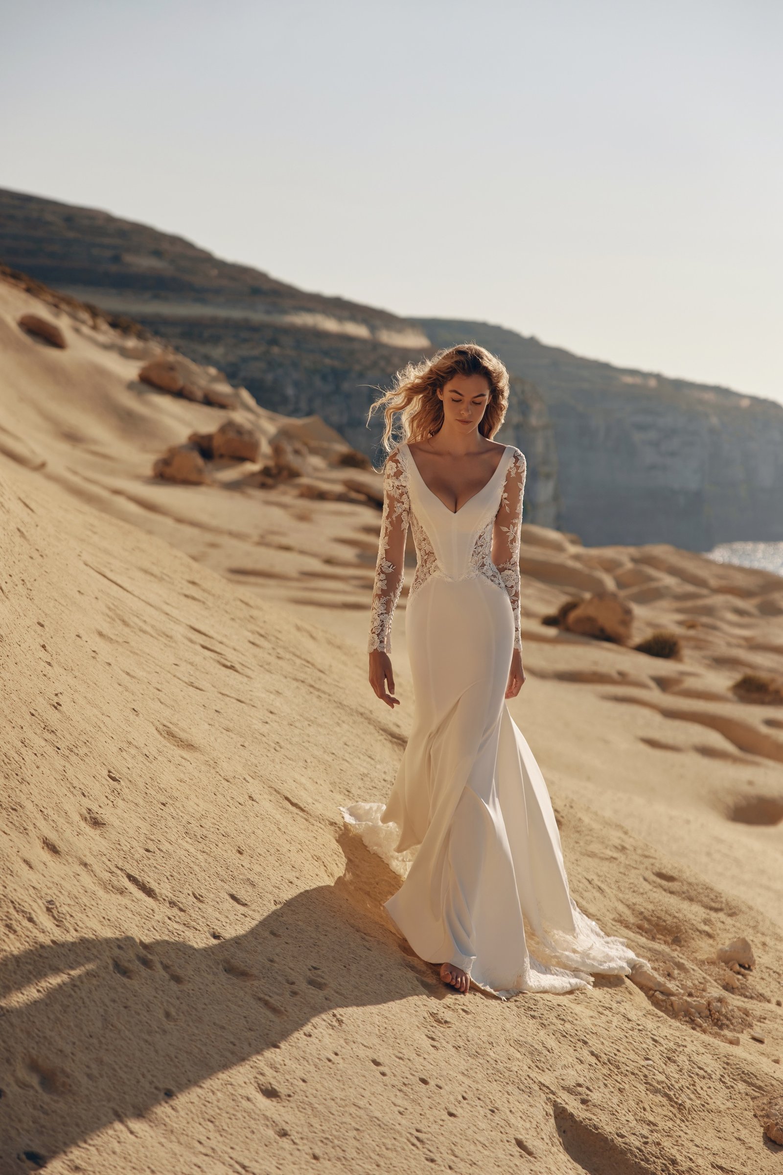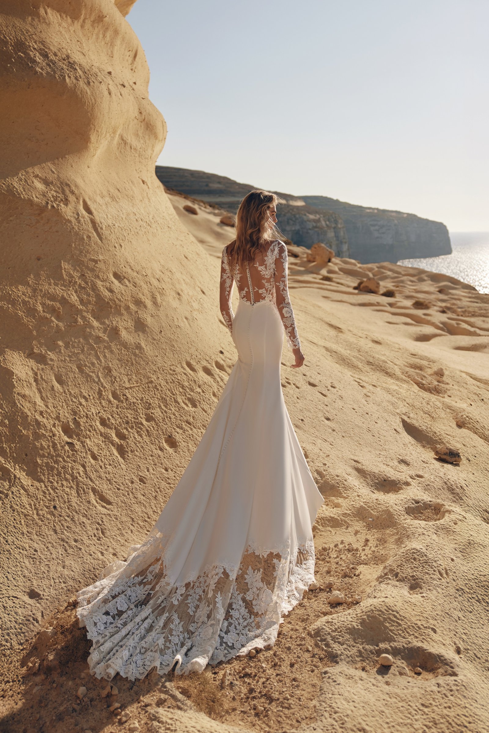 Khali gown is a captivating mermaid silhouette, crafted from refined suiting fabric and delicately adorned with lace. The deep V-neckline enhances the elegance of the bodice, while semi-sheer panels at the corset create the illusion of a slimmer waist. Illusion mesh also extends through the sleeves, finished with intricate 3D lace and a row of covered buttons. The back is sheer and fully embellished with lace, featuring a dramatic line of buttons that continues all the way down through the sweeping train. The train itself is a true highlight of the gown: where the structured suiting fabric ends, layers of lace take over, adding volume, width, and breathtaking dimension to the silhouette.