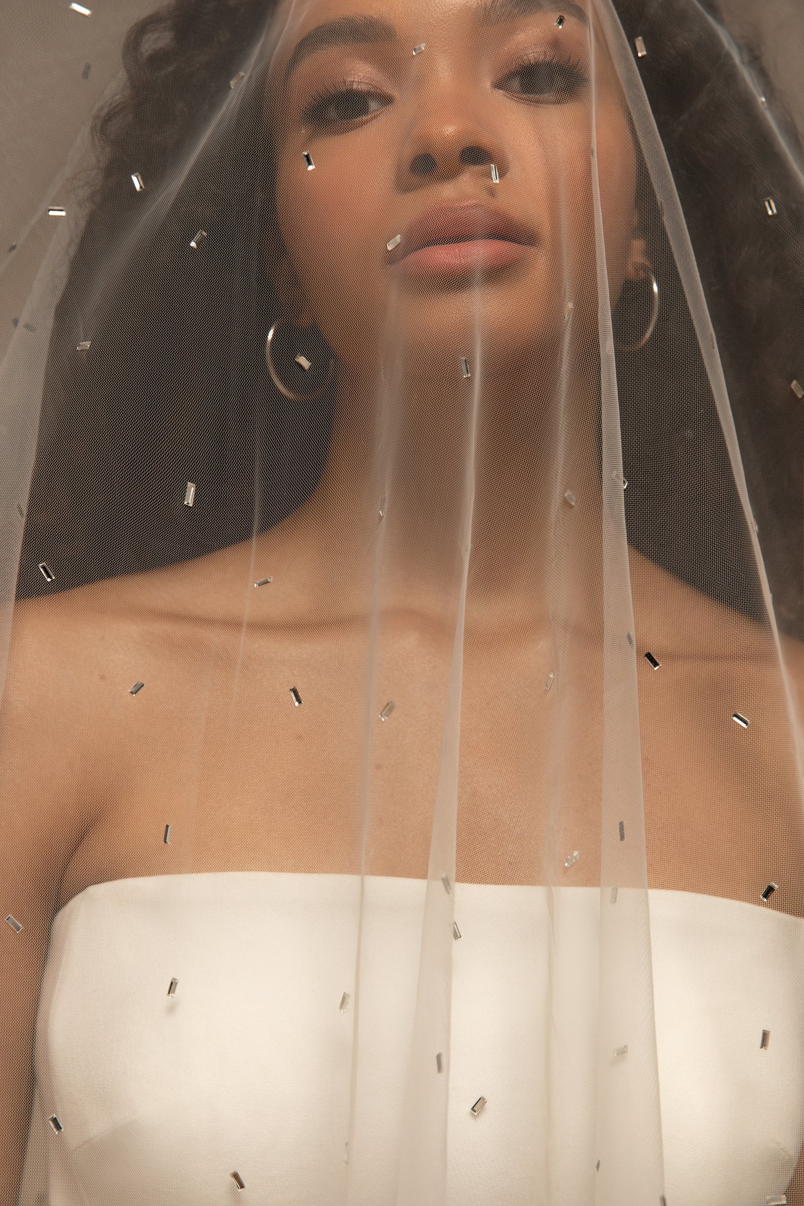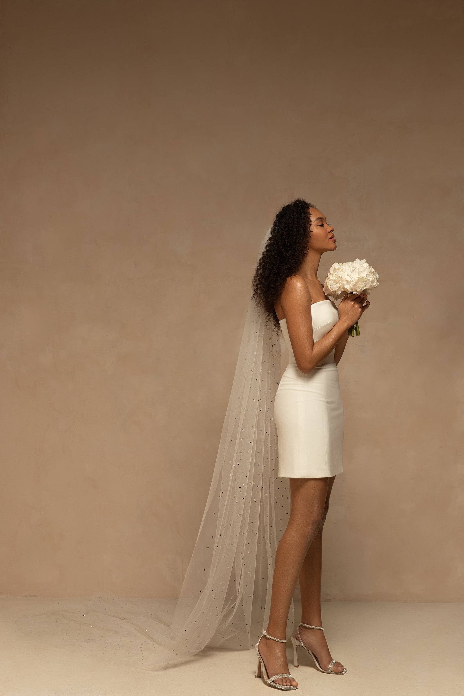 Beautiful minimalistic single-tier bridal veil made of tulle and decorated with small artificial crystals through all length. Available in cathedral length of 2,5m or 3m.