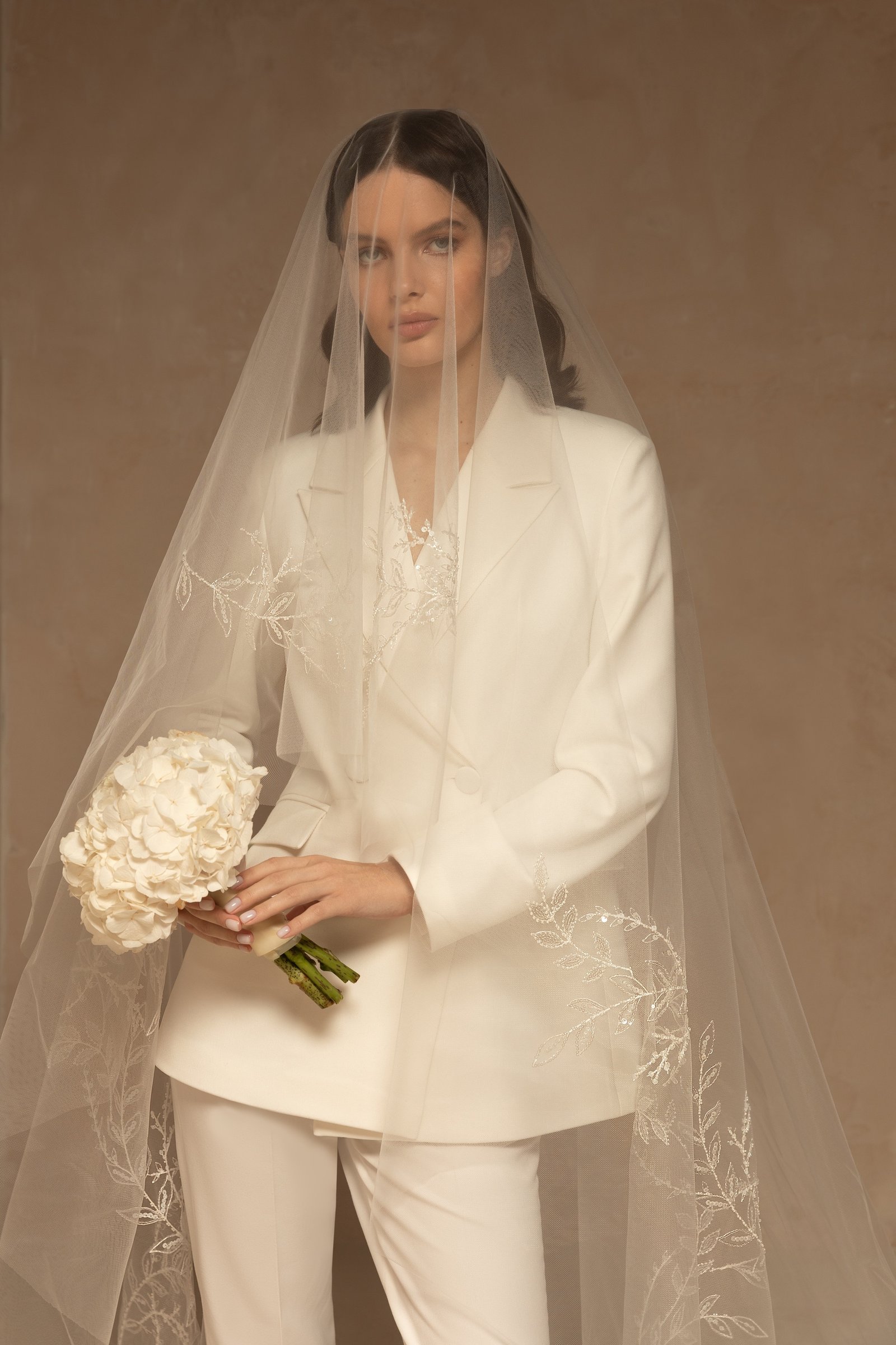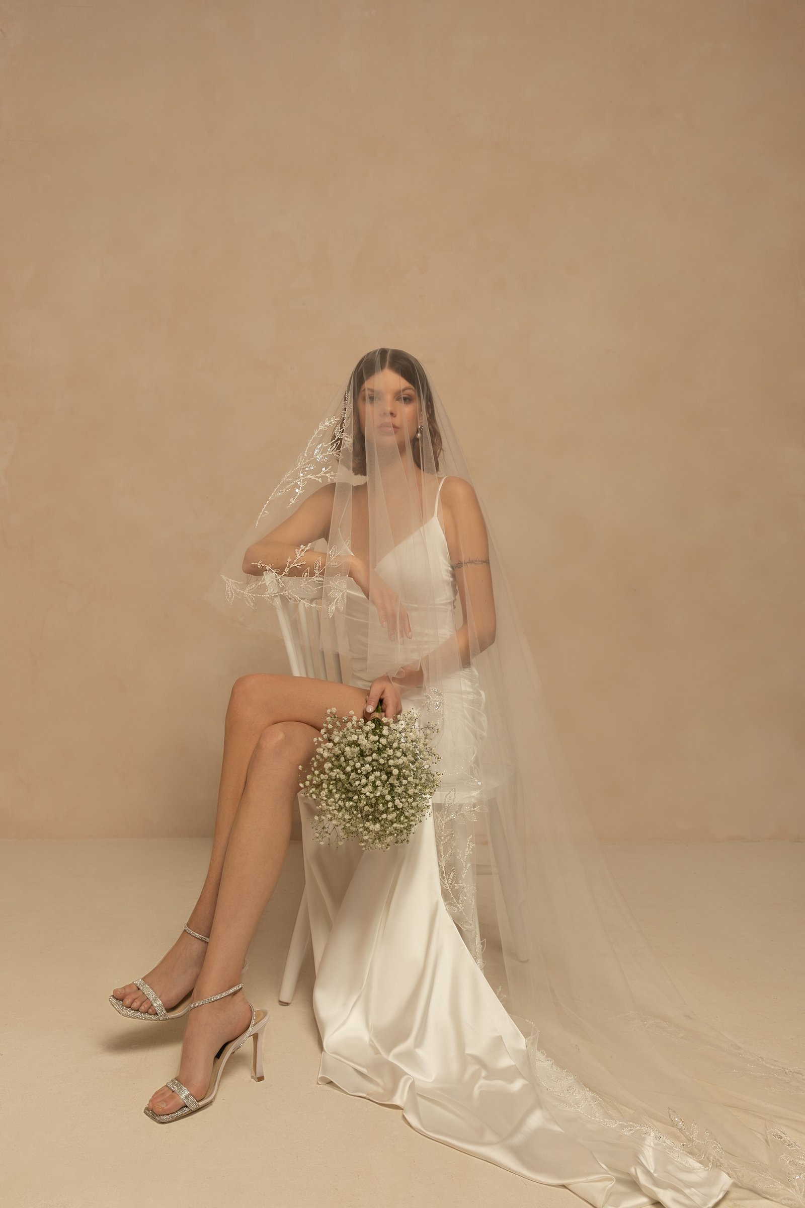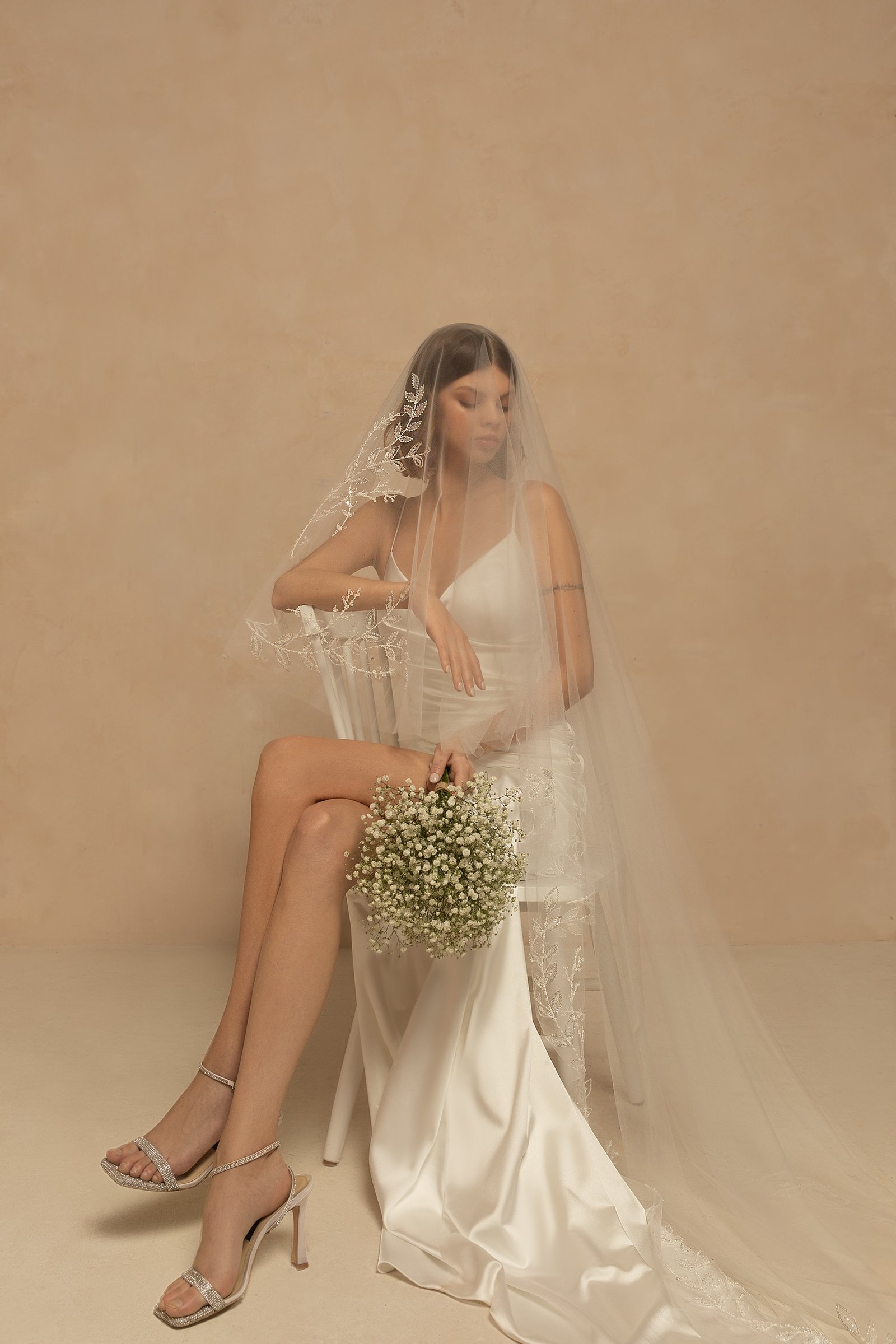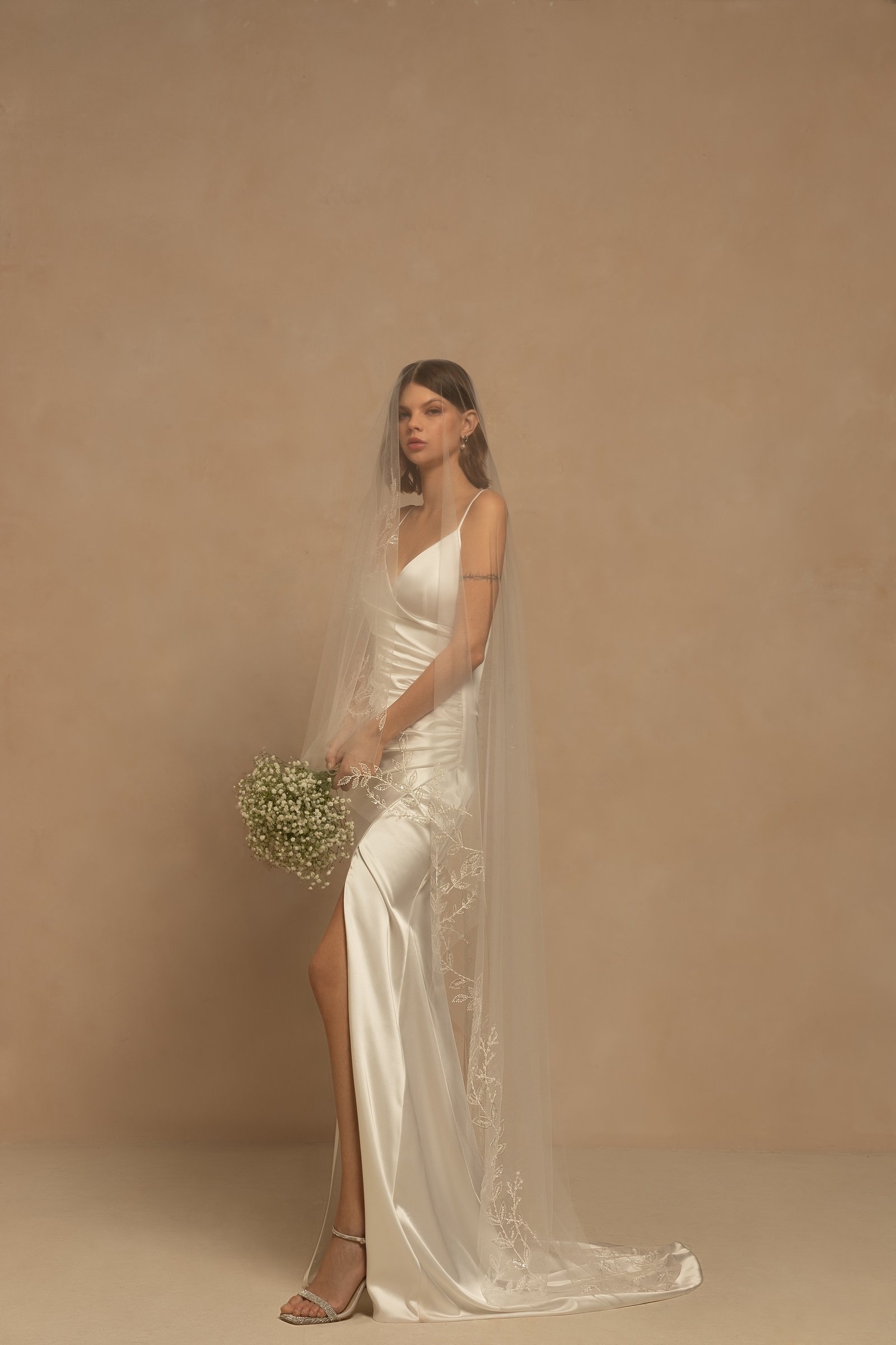 Romantic single-tier drop veil made of weightless tulle decorated with delicate embroidered lace. Can be worn as a mantilla veil. Available in chapel and cathedral lengths. Folded back, the veil will create two layers.