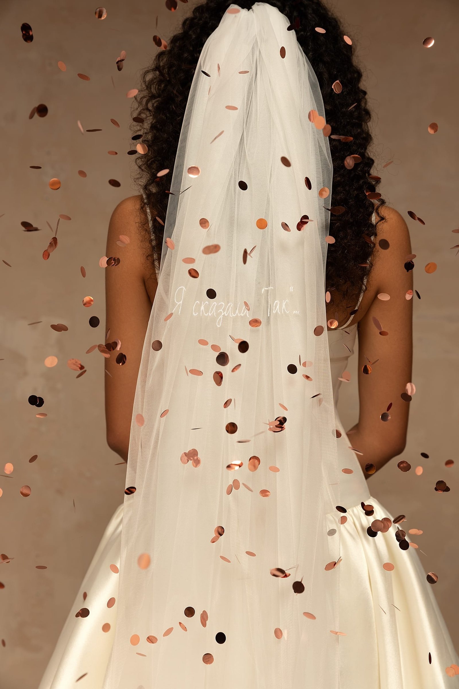 Stylish single-tier bridal veil made of tulle and decorated with an "I said "Yes"" inscription. Available in cathedral length of 2,5m or 3m.