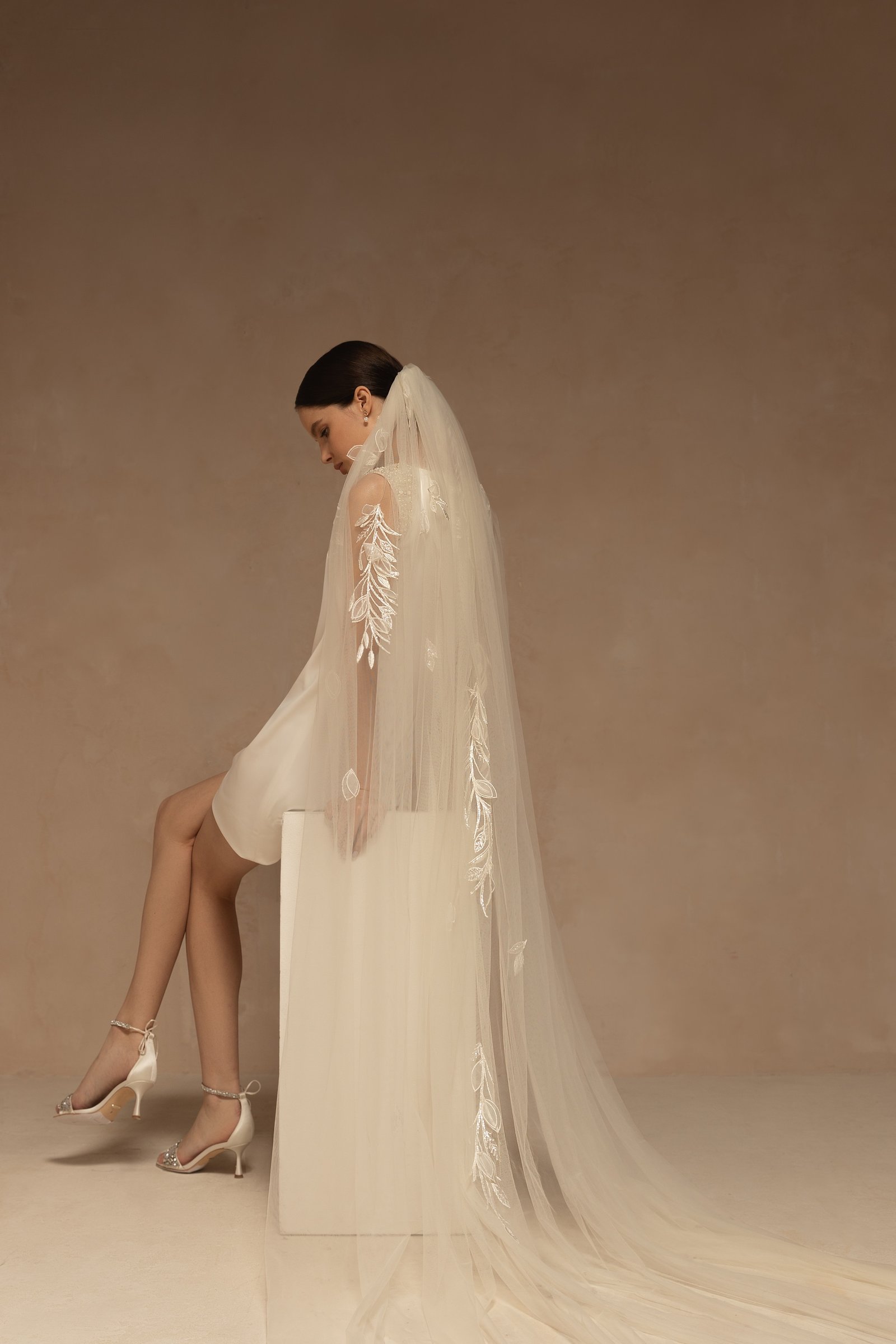 Romantic single-tier veil made of tulle and decorated with oversized floral lace appliques. Available in cathedral length.
