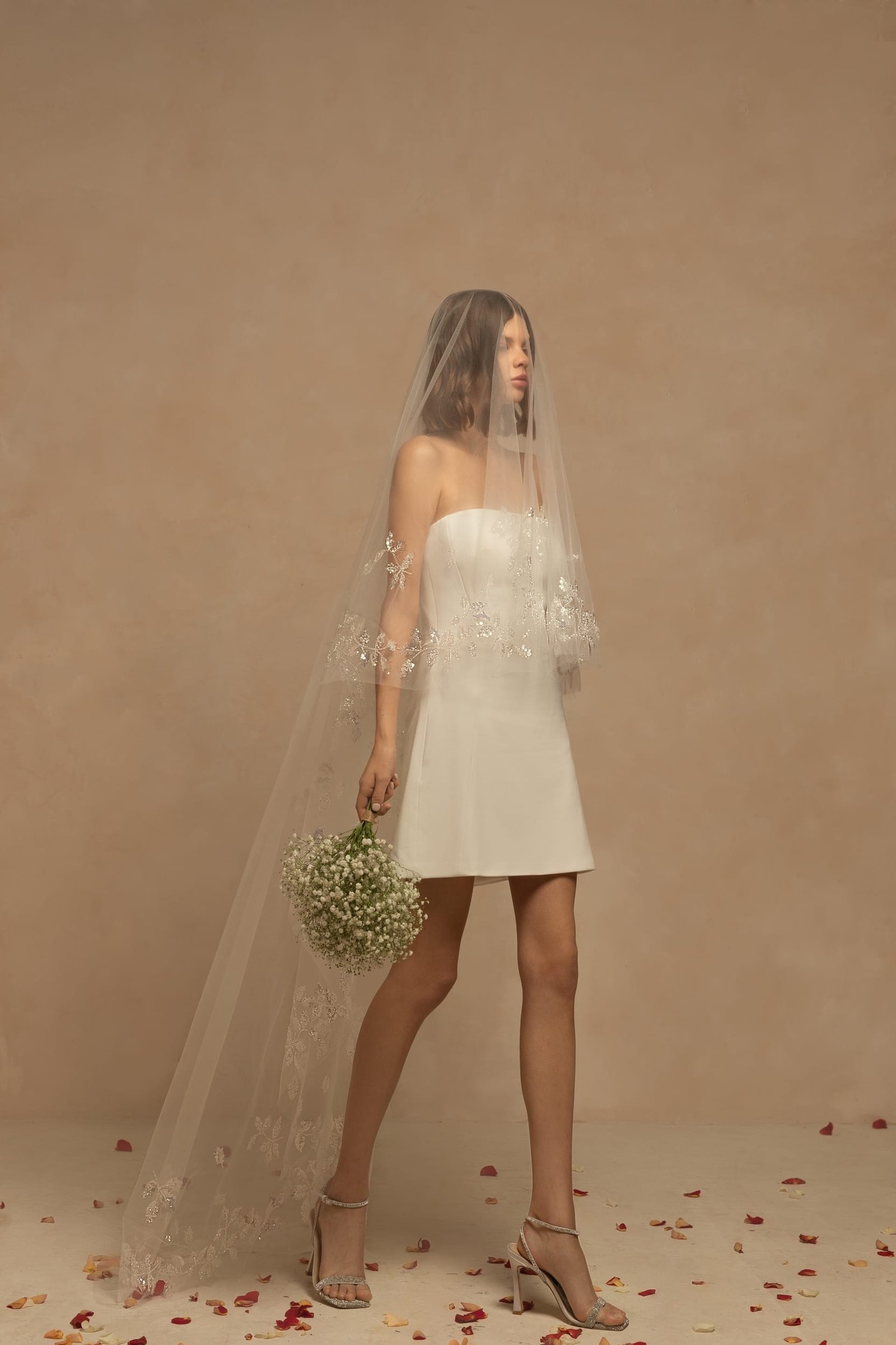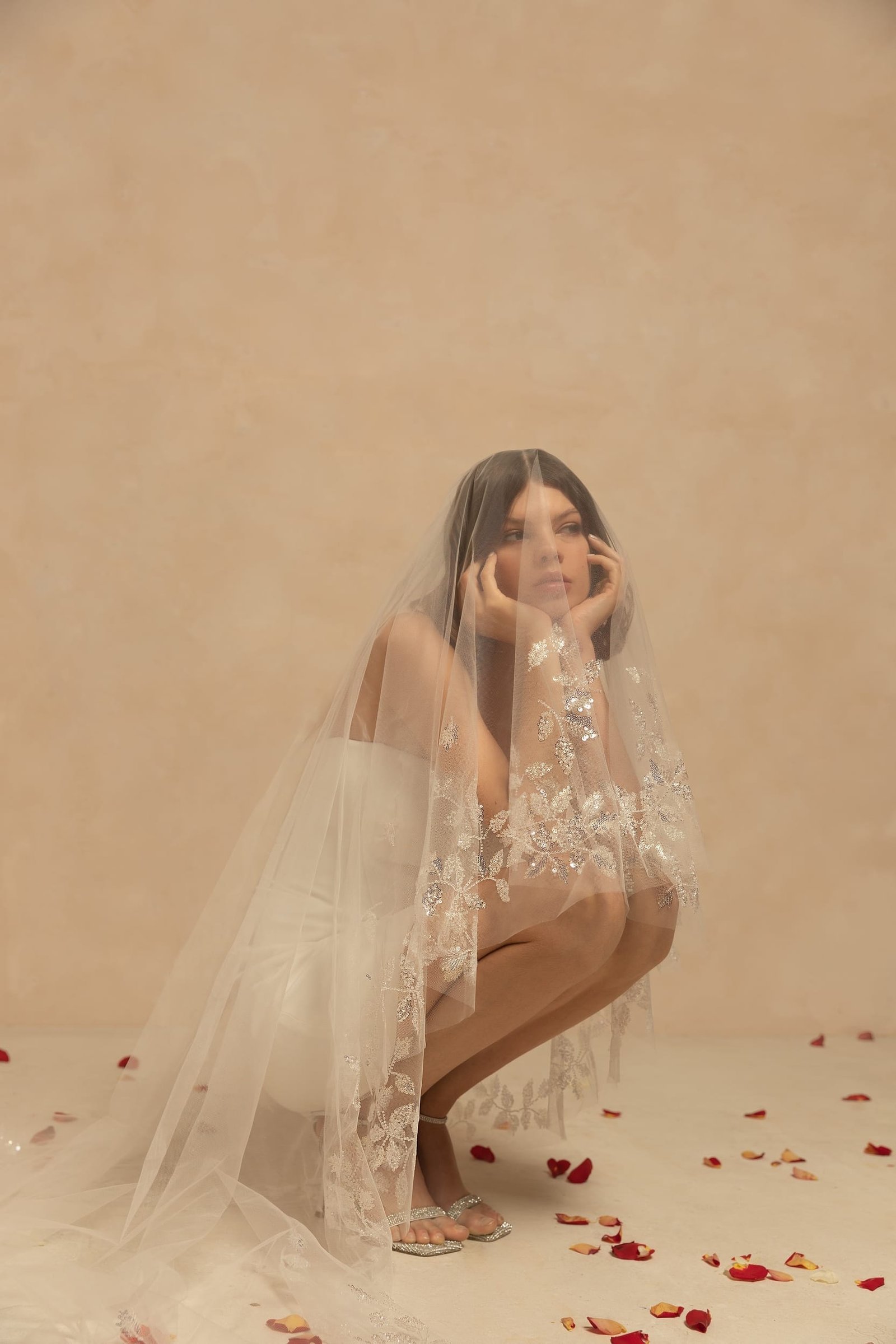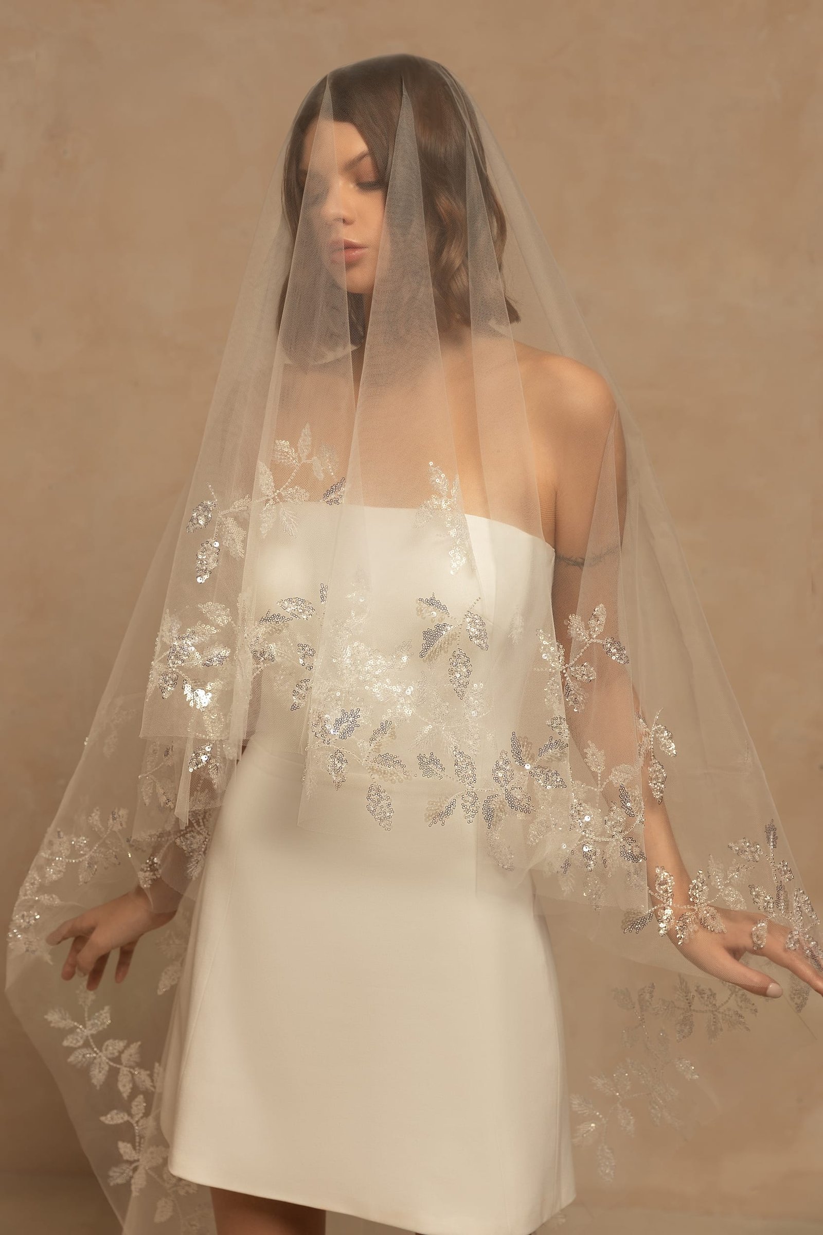 Romantic single-tier drop veil made of weightless tulle decorated with sequined embroidered floral lace. Can be worn as a mantilla veil. Available in cathedral length. Folded back, the veil will create two layers.