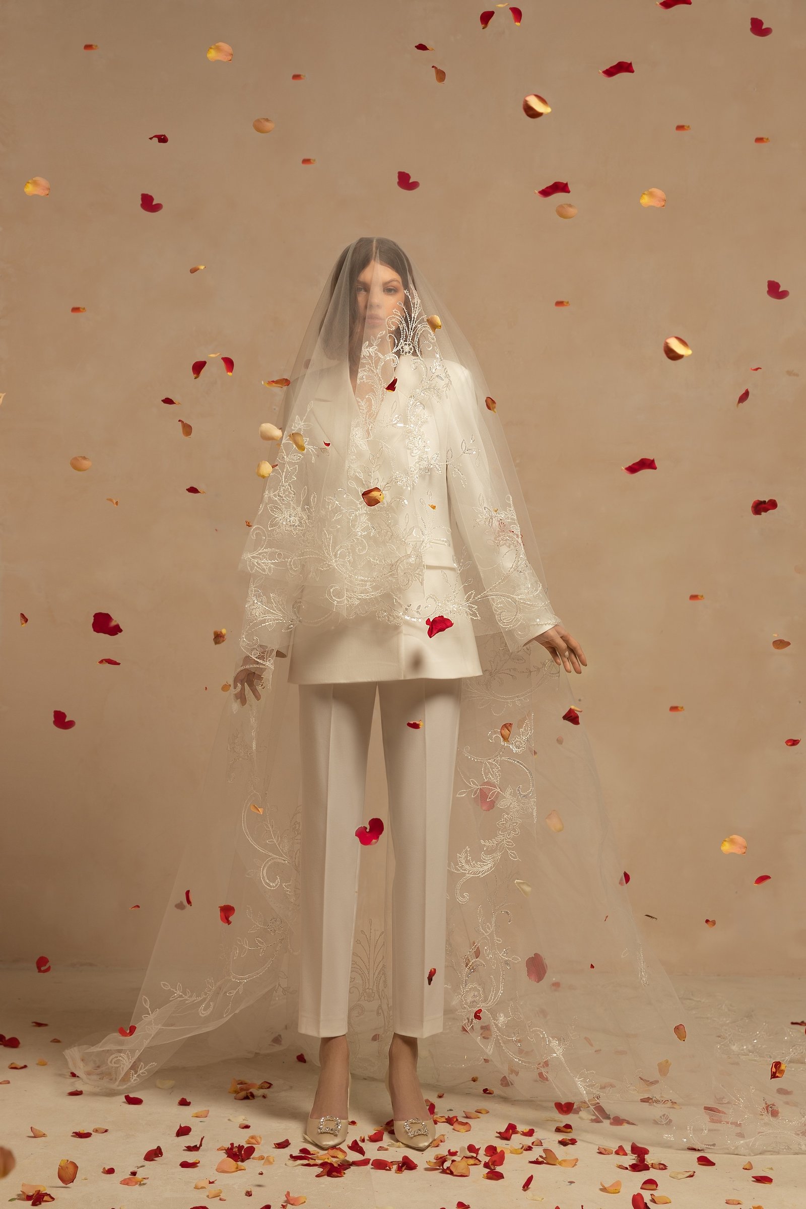 Luxutious single-tier drop veil made of tulle and decorated with sparkling floral lace appliques. Available in cathedral length. Folded back, the veil will create two layers.